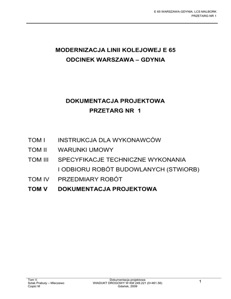 E 65 WARSZAWA-GDYNIA. LCS MALBORK PRZETARG NR 1 MODERNIZACJA LINII KOLEJOWEJ E 65 ODCINEK WARSZAWA – GDYNIA DOKUMENTACJA PROJEKTOWA PRZETARG NR 1 TOM I INSTRUKCJA DLA WYKONAWCÓW TOM II WARUNKI UMOWY TOM III SPECYFIKACJE TECHNICZNE WYKONANIA I ODBIORU ROBÓT BUDOWLANYCH (STWiORB) TOM IV PRZEDMIARY ROBÓT TOM V DOKUMENTACJA PROJEKTOWA Tom V. Szlak Prabuty – Mleczewo Część M Dokumentacja projektowa WIADUKT DROGOWY W KM 249.221 (0+461.56) Gdańsk, 2009 1 E 65 WARSZAWA-GDYNIA. LCS MALBORK PRZETARG NR 1 SPIS ZAWARTOŚCI: TOM V CZĘŚĆ T ROBOTY TOROWE I ODWODNIENIE CZĘŚĆ P PERONY CZĘŚĆ D ROBOTY DROGOWE CZĘŚĆ B ROBOTY BUDOWLANE CZĘŚĆ M OBIEKTY INśYNIERYJNE CZĘŚĆ I SIECI I OBIEKTY SANITARNE CZĘŚĆ S SIEĆ TRAKCYJNA Z ZASILANIEM I STEROWANIEM CZĘŚĆ SN LINIA ODBIORÓW NIETRAKCYJNYCH CZĘŚĆ EN ELEKTROENERGETYKA NIETRAKCYJNA CZĘŚĆ A STEROWANIE RUCHEM KOLEJOWYM CZĘŚĆ TL TELEKOMUNIKACJA CZĘŚĆ Z GOSPODARKA ZIELENIĄ Tom V. Szlak Prabuty – Mleczewo Część M Dokumentacja projektowa WIADUKT DROGOWY W KM 249.221 (0+461.56) Gdańsk, 2009 2 E 65 WARSZAWA-GDYNIA. LCS MALBORK PRZETARG NR 1 I. OPIS TECHNICZNY ................................................................................... 5 1. PODSTAWA OPRACOWANIA. ............................................................................. 5 2. PRZEDMIOT I ZAKRES OPRACOWANIA. ........................................................... 5 3. LOKALIZACJA OBIEKTU. .................................................................................... 5 4. WARUNKI GRUNTOWO - WODNE. ...................................................................... 6 5. STAN ISTNIEJĄCY. ............................................................................................... 6 6. STAN PROJEKTOWANY – NOWY WIADUKT DROGOWY. ................................. 6 6.1 6.2 6.3 6.4 6.5 6.6 6.7 Projektowany zakres robót. .................................................................................... 6 Charakterystyczne parametry projektowanego obiektu. .......................................... 7 Uzasadnienie przyjętego rozwiązania. .................................................................... 8 ZałoŜenia i podstawowe wyniki obliczeń statycznych.............................................. 8 Posadowienie konstrukcji i roboty ziemne............................................................... 8 Konstrukcja wiaduktu. ............................................................................................. 8 Mur oporowy. .......................................................................................................... 9 7. URZĄDZENIA OBCE NA OBIEKCIE. .................................................................... 9 8. OPIS ROZWIĄZAŃ ELEMENTÓW WYPOSAśENIA OBIEKTU. ........................... 9 8.1 8.2 8.3 8.4 8.5 8.6 8.7 8.8 8.9 8.10 8.11 8.12 8.13 8.14 Izolacja. .................................................................................................................. 9 Nawierzchnia na obiekcie. ...................................................................................... 9 KrawęŜniki. ............................................................................................................. 9 Dylatacja................................................................................................................. 9 Odwodnienie. ....................................................................................................... 10 Płyty przejściowe. ................................................................................................. 10 ŁoŜyska. ............................................................................................................... 10 Bariery ochronne. ................................................................................................. 10 Osłona anty-poraŜeniowa. .................................................................................... 11 Schody zejściowe na peron. ................................................................................. 11 Znaki pomiarowe. ................................................................................................. 11 Umocnienie skarp. ................................................................................................ 11 Zasypki przyobiektowe. ........................................................................................ 11 Ochrona antykorozyjna. ........................................................................................ 11 9. OPIS TECHNOLOGII I ORGANIZACJI BUDOWY WIADUKTU. .......................... 12 10. DOSTĘPNOŚĆ OBIEKTU DLA OSÓB O OGRANICZONEJ MOśLIWOŚCI PORUSZANIA SIĘ. .............................................................................................. 12 11. CHARAKTERYSTYKA EKOLOGICZNA OBIEKTU............................................. 12 11.1 11.2 11.3 11.4 12. Emisja hałasu ....................................................................................................... 13 Wpływ na drzewostan ........................................................................................... 13 Budynki ................................................................................................................ 13 Odprowadzenie wód opadowych .......................................................................... 13 ARCHEOLOGIA................................................................................................... 13 Tom V. Szlak Prabuty – Mleczewo Część M Dokumentacja projektowa WIADUKT DROGOWY W KM 249.221 (0+461.56) Gdańsk, 2009 3 E 65 WARSZAWA-GDYNIA. LCS MALBORK PRZETARG NR 1 13. BEZPIECZEŃSTWO POśAROWE ...................................................................... 13 14. ZABEZPIECZENIE KONSTRUKCJI PRZED WPŁYWAMI EKSPLOATACJI GÓRNICZEJ ........................................................................................................ 13 15. MATERIAŁY. ...