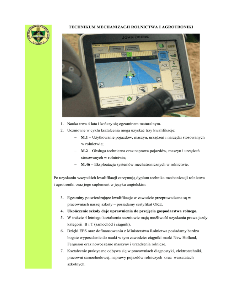 TECHNIKUM MECHANIZACJI ROLNICTWA I AGROTRONIKI 1. Nauka trwa 4 lata i kończy się egzaminem maturalnym. 2. Uczniowie w cyklu kształcenia mogą uzyskać trzy kwalifikacje: M.1 – Użytkowanie pojazdów, maszyn, urządzeń i narzędzi stosowanych w rolnictwie; M.2 – Obsługa techniczna oraz naprawa pojazdów, maszyn i urządzeń stosowanych w rolnictwie; M.46 – Eksploatacja systemów mechatronicznych w rolnictwie. Po uzyskaniu wszystkich kwalifikacji otrzymują dyplom technika mechanizacji rolnictwa i agrotroniki oraz jego suplement w języku angielskim. 3. Egzaminy potwierdzające kwalifikacje w zawodzie przeprowadzane są w pracowniach naszej szkoły – posiadamy certyfikat OKE. 4. Ukończenie szkoły daje uprawnienia do przejęcia gospodarstwa rolnego. 5. W trakcie 4 letniego kształcenia uczniowie mają możliwość uzyskania prawa jazdy kategorii B i T (samochód i ciągnik). 6. Dzięki EFS oraz dofinansowaniu z Ministerstwa Rolnictwa posiadamy bardzo bogate wyposażenie do nauki w tym zawodzie: ciągniki marki New Holland, Ferguson oraz nowoczesne maszyny i urządzenia rolnicze. 7. Kształcenie praktyczne odbywa się w pracowniach diagnostyki, elektrotechniki, pracowni samochodowej, naprawy pojazdów rolniczych oraz warsztatach szkolnych. 8. Młodzież wyjeżdża na Międzynarodowe Targi Techniki Rolniczej, Targi Spawalnictwa, utrzymujemy kontakt z uczelniami branżowymi. 9. Jako jedyna szkoła ponadgimnazjalna w Rykach posiadamy internat. 10. Przychodząc do nas zdobędziesz umiejętności w zakresie diagnozowania stanu technicznego pojazdów rolniczych dzięki specjalistycznym urządzeniom kontrolno – pomiarowym. 11. Będziesz mógł sprawdzić swoją wiedzę w Olimpiadzie Wiedzy i Umiejętności Rolniczych oraz Powiatowym Turnieju Motoryzacyjnym. 12. Zdobędziesz dodatkowe umiejętności uczestnicząc w kursach kwalifikacyjnych: Operatora wózków widłowych z napędem elektrycznym i spalinowym; Uprawnienia spawacza w zakresie MIG, MAG, TIG, Operatora koparko – ładowarki. Absolwenci znajdą zatrudnienie w: firmach transportowych przedsiębiorstwach spedycyjnych stacjach diagnostyczno - obsługowych zakładach remontowych maszyn i urządzeń rolniczych we własnym gospodarstwie rolnym W naszej szkole stawiamy na nowoczesność!