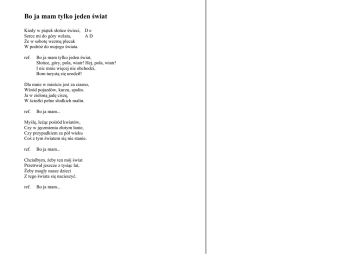 Bo ja mam tylko jeden świat Kiedy w piątek słońce świeci, D e Serce mi do góry wzlata, AD Że w sobotę wezmę plecak W podróż do mojego świata. ref. Bo ja mam tylko jeden świat, Słońce, góry, pola, wiatr! Hej, pola, wiatr! I nic mnie więcej nie obchodzi, Bom turystą się urodził! Dla mnie w mieście jest za ciasno, Wśród pojazdów, kurzu, spalin. Ja w zieloną jadę ciszę, W ścieżki pełne słodkich malin. ref. Bo ja mam... Myślę, leżąc pośród kwiatów, Czy w jęczmienia złotym łanie, Czy przypadkiem za pół wieku Coś z tym światem się nie stanie. ref. Bo ja mam... Chciałbym, żeby ten mój świat Przetrwał jeszcze z tysiąc lat, Żeby mogły nasze dzieci Z tego świata się nacieszyć. ref. Bo ja mam...