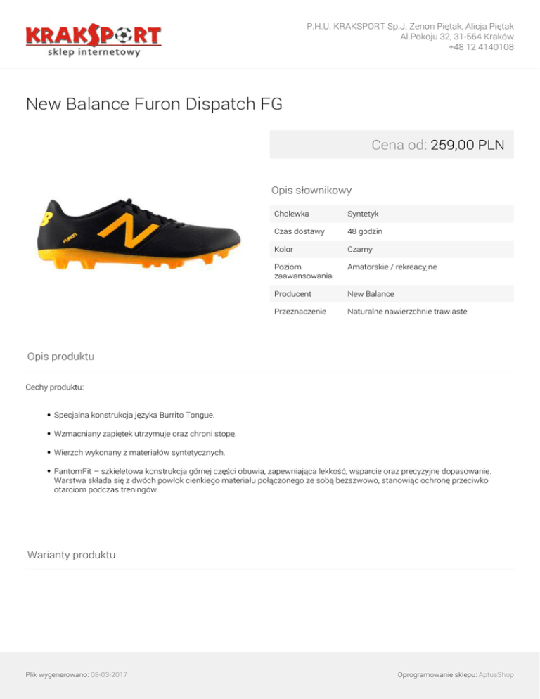 P.H.U. KRAKSPORT Sp.J. Zenon Piętak, Alicja Piętak Al.Pokoju 32, 31-564 Kraków +48 12 4140108 New Balance Furon Dispatch FG Cena od: 259,00 PLN Opis słownikowy Cholewka Syntetyk Czas dostawy 48 godzin Kolor Czarny Poziom zaawansowania Amatorskie / rekreacyjne Producent New Balance Przeznaczenie Naturalne nawierzchnie trawiaste Opis produktu Cechy produktu: Specjalna konstrukcja języka Burrito Tongue. Wzmacniany zapiętek utrzymuje oraz chroni stopę. Wierzch wykonany z materiałów syntetycznych. FantomFit – szkieletowa konstrukcja górnej części obuwia, zapewniająca lekkość, wsparcie oraz precyzyjne dopasowanie. Warstwa składa się z dwóch powłok cienkiego materiału połączonego ze sobą bezszwowo, stanowiąc ochronę przeciwko otarciom podczas treningów. Warianty produktu Plik wygenerowano: 08-03-2017 Oprogramowanie sklepu: AptusShop P.H.U. KRAKSPORT Sp.J. Zenon Piętak, Alicja Piętak Al.Pokoju 32, 31-564 Kraków +48 12 4140108 Plik wygenerowano: 08-03-2017 40 259,00 PLN 40.5 259,00 PLN 41 259,00 PLN 42 259,00 PLN 42.5 259,00 PLN 43 259,00 PLN 44 259,00 PLN 44.5 259,00 PLN Oprogramowanie sklepu: AptusShop P.H.U. KRAKSPORT Sp.J. Zenon Piętak, Alicja Piętak Al.Pokoju 32, 31-564 Kraków +48 12 4140108 45 259,00 PLN Galeria Plik wygenerowano: 08-03-2017 Powered by TCPDF (www.tcpdf.org) Oprogramowanie sklepu: AptusShop