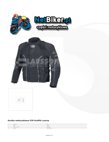 Kurtka motocyklowa STR Graffiti czarna 1. 2. 3. 4. 5. 6. Producent Nazwa Kolor Rodzaj materiału Typ Rozmiar STR Graffiti czarny tekstylna uniwersalna XXL; S; M; L; XL Strona 1 z 2 Graffiti – 100 % wodoszczelna i oddychająca membrana DRYWAY+® – możliwość wypięcia membrany i uzyskania pełnego przewiewu przez materiał zewnętrzny kurtki – wypinany ocieplacz z inteligentnej pochłaniajcej ciepło ociepliny OUTLAST® – wywietrzniki wzdłuż całej długości ramion, pach i po bokach oraz na plecach – wewnątrz dodatkowe wzmocnienia z materiału HI-ART® – na barkach i łokciach ochraniacze z atestem CE i bezstopniową regulacją położenia – elementy odblaskowe – 11 kieszeni + naszyta na rękaw przeźroczysta kieszeń na GPS lub notatki – miejsce na atestowany CE ochraniacz pleców Back Converter – miejsce na poidełko z wodą – miejsce na poprowadzenie przewodu zestawu słuchawkowego Strona 2 z 2