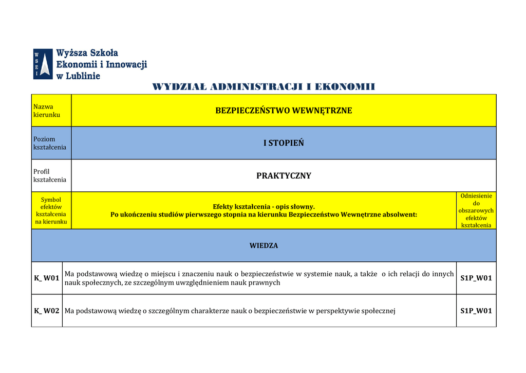 WYDZIAŁ ADMINISTRACJI I EKONOMII Nazwa kierunku BEZPIECZEŃSTWO WEWNĘTRZNE Poziom kształcenia I STOPIEŃ Profil kształcenia PRAKTYCZNY Symbol efektów kształcenia na kierunku Efekty kształcenia - opis słowny. Po ukończeniu studiów pierwszego stopnia na kierunku Bezpieczeństwo Wewnętrzne absolwent: Odniesienie do obszarowych efektów kształcenia WIEDZA K_ W01 Ma podstawową wiedzę o miejscu i znaczeniu nauk o bezpieczeństwie w systemie nauk, a także o ich relacji do innych S1P_W01 nauk społecznych, ze szczególnym uwzględnieniem nauk prawnych K_ W02 Ma podstawową wiedzę o szczególnym charakterze nauk o bezpieczeństwie w perspektywie społecznej S1P_W01 Ma podstawową wiedzę o różnych rodzajach struktur społecznych i instytucji społecznych odgrywających szczególną rolę w zakresie bezpieczeństwa w skali lokalnej, regionalnej, krajowej, europejskiej i międzynarodowej oraz o , ich genezie i S1P_W02 K_ W03 ewolucji ze szczególnym uwzględnieniem państwa i jego organów oraz istniejących między nimi relacjach; rozumie S1P_W03 istotę bezpieczeństwa społecznego oraz bezpieczeństwa społeczności lokalnych, rolę organów administracji w kształtowaniu tej płaszczyzny bezpieczeństwa K_ W04 Zna rodzaje więzi prawnych i organizacyjnych występujących w społeczeństwie dotyczących bezpieczeństwa oraz S1P_W04 porządku publicznego Ma podstawową wiedzę o człowieku jako podmiocie konstytuującym struktury społeczne, a także jako podmiocie S1P_W05 K_ W05 działającym w tych strukturach społecznych, potrafi rozróżniać i analizować prawa i obowiązki członka poszczególnych S1P_W07 struktur zapewniających bezpieczeństwo i porządek publiczny K_ W06 Ma podstawową wiedzę o roli człowieka w organizacji państwowej oraz w strukturach ponadnarodowych S1P_W05 zapewniających bezpieczeństwo państwa i różnorodnych struktur społecznych Zna metody i narzędzia pozyskiwania oraz przetwarzania danych służących zapewnieniu bezpieczeństwa wewnętrznego K_ W07 w różnych obszarach życia społecznego, ze szczególnym uwzględnieniem podmiotów publicznych oraz zasad współpracy S1P_W06 podmiotów prywatnych Ma uporządkowaną wiedzę dotyczącą źródeł prawa, w szczególności prawa stosowanego w działaniach instytucji bezpieczeństwa narodowego oraz zna ich specyfikę, ma wiedzę o zasadach i normach (w tym pozaprawnych) K_ W08 S1P_W07 regulujących funkcjonowanie wybranych służb ochrony bezpieczeństwa i porządku publicznego, zna podstawowe procedury funkcjonowania administracji publicznej Ma wiedzę w zakresie podstaw socjologii i psychologii oraz w zakresie pozyskiwania, przetwarzania i ochrony danych z K_ W09 wykorzystaniem różnych metod, w szczególności z zakresu informatyki umożliwiających definiowanie procesów S1P_W06 zachodzących w wybranych strukturach społecznych relewantnych z punktu widzenia bezpieczeństwa państwa Ma wiedzę na temat podstawowych regulacji prawnych rp dotyczących bezpieczeństwa państwa oraz zwalczania S1P_W06 K_ W10 przestępczości, w tym przestępczości zorganizowanej, bezpieczeństwa wewnętrznego w ue, zarządzania kryzysowego, S1P_W07 źródeł zagrożeń w zakresie bezpieczeństwa K_ W11 Ma wiedzę o procesach zmian struktur i instytucji społecznych, w szczególności instytucji bezpieczeństwa wewnętrznego S1P_W08 i narodowego, ich genezie oraz ewolucji S1P_W09 K_ W12 Zna podstawowe zasady ustroju rzeczypospolitej polskiej dotyczące struktury i kompetencji poszczególnych organów S1P_W03 władzy ustawodawczej, wykonawczej i sądowniczej, ma wiedzę w zakresie wzajemnych relacji i współdziałania pomiędzy S1P_W07 konstytucyjnymi organami państwowymi K_ W13 Ma podstawową wiedzę z zakresu mechanizmów ochrony praw i wolności człowieka i obywatela oraz ich realizacji S1P_W05 S1P_W07 K_ W14 Posiada podstawową wiedzę o unormowaniach prawnych w zakresie ochrony własności przemysłowej i prawa S1P_W10 autorskiego K_ W15 Ma podstawową wiedzę w zakresie konstruowania bezpieczeństwa społeczności lokalnych oraz zarządzania S1P_W06 kryzysowego w sytuacji szczególnych zagrożeń S1P_W07 Zna publicznoprawne uwarunkowania rozwoju przedsiębiorczości oraz podstawowe reguły i zasady funkcjonowania różnych form indywidualnej przedsiębiorczości w obrocie prawnym, ma wiedzę w zakresie funkcjonowania rynku pracy K_ W16 S1P_W11 oraz reguł świadczenia pracy w ramach stosunku pracy UMIEJĘTNOŚCI Potrafi prawidłowo interpretować zjawiska społeczne oraz konkretne sytuacje faktyczne relewantne dla bezpieczeństwa wewnętrznego S1P_U01 Potrafi wykorzystywać podstawową wiedzę teoretyczną z zakresu nauk prawnych i nauk o bezpieczeństwie, a także K_U02 organizacji i zarządzania w celu analizowania i interpretowania problemów istotnych z punktu widzenia bezpieczeństwa wewnętrznego i zewnętrznego państwa S1P_U02 K_U01 Potrafi wykorzystać pozyskane dane dotyczące bezpieczeństwa wewnętrznego w działalności zawodowej oraz na ich podstawie analizować przyczyny powstawania zagrożeń dla bezpieczeństwa państwa i porządku publicznego S1P_U02 S1P_U03 Potrafi właściwie analizować przyczyny historyczne, kryminologiczne, społeczne wywołujące zagrożenia w zakresie K_U04 bezpieczeństwa wewnętrznego oraz prognozować podejmowanie konkretnych działań mających na celu eliminację tych zagrożeń S1P_U03 Potrafi prognozować procesy i zjawiska społeczne relewantne z punktu widzenia bezpieczeństwa wewnętrznego. Potrafi K_U05 wykorzystać standardowe metody i narzędzia z zakresu psychologii, socjologii, kryminologii, ekonomii do realizacji tych celów S1P_U04 Prawidłowo posługuje się systemami normatywnymi oraz konkretnymi normami i regułami prawnymi, a także regułami K_U06 zawodowymi w celu oceny stanu faktycznego oraz rozwiązania konkretnego zadania w sferze działań instytucji bezpieczeństwa; potrafi przewidzieć istotne skutki prawne i organizacyjne podej