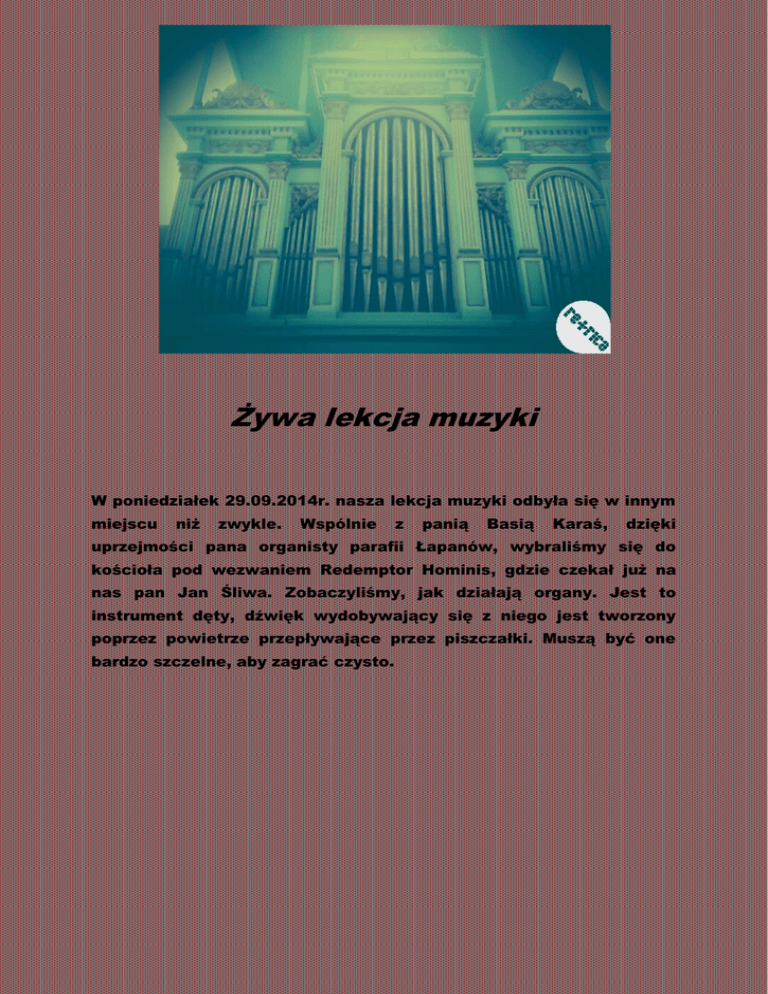 Żywa lekcja muzyki W poniedziałek 29.09.2014r. nasza lekcja muzyki odbyła się w innym miejscu niż zwykle. Wspólnie z panią Basią Karaś, dzięki uprzejmości pana organisty parafii Łapanów, wybraliśmy się do kościoła pod wezwaniem Redemptor Hominis, gdzie czekał już na nas pan Jan Śliwa. Zobaczyliśmy, jak działają organy. Jest to instrument dęty, dźwięk wydobywający się z niego jest tworzony poprzez powietrze przepływające przez piszczałki. Muszą być one bardzo szczelne, aby zagrać czysto. Nasze organy parafialne wyprodukowano w 1919 roku. Zostały one przeniesione z kościoła pod wezwaniem św. Bartłomieja. Okazało się, że podczas jednego z występów chóru, grupa osób oparła się o piszczałki, przez co zostały one zgniecione. Na szczęście udało się je wyprostować. W kościele przez chwilę nie było prądu, więc musieliśmy własnoręcznie wprowadzić powietrze do organów poprzez tzw. kalikowanie. Zobaczyliśmy też wielki zbiór pieśni kościelnych pana organisty. Serdecznie dziękujemy panu organiście za możliwość poznania fragmentu historii naszego Kościoła, bo przecież muzyka nieodłącznie towarzyszy Kościołowi i jest jednym z najbogatszych Jego tworzyw. Kacper Rogowski Michał Sobczyk W imieniu uczniów naszej szkoły dziękujemy również za lekcję śpiewu poświęconą św. Janowi Kantemu (16 października 2014r.), dzięki której uroczystość ku czci Patrona Szkoły mogła być jeszcze piękniejsza.