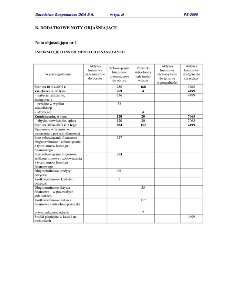 Doradztwo Gospodarcze DGA S.A. w tys. zł PS-2005 B. DODATKOWE NOTY OBJA NIAJ CE Nota obja niaj ca nr 1 INFORMACJE O INSTRUMENTACH FINANSOWYCH. Wyszczególnienie Stan na 01.01.2005 r. Zwi kszenia, w tym: - nabycie, zało enie, zaci gni cie - przej te w wyniku konsolidacji - udzielenie Zmniejszenia, w tym: - zbycie, rozwi zanie, spłata Stan na 30.06.2005 r. z tego: Ujawnione w bilansie ze wskazaniem pozycji bilansowej Inne zobowi zania finansowe długoterminowe - zobowi zania z tytułu umów leasingu finansowego Inne zobowi zania finansowe krótkoterminowe - zobowi zania z tytułu umów leasingu finansowego Długoterminowe kredyty i po yczki Krótkoterminowe kredyty i po yczki Długoterminowe aktywa finansowe – w pozostałych jednostkach Krótkoterminowe aktywa finansowe - udzielone po yczki w tym naliczone odsetki rodki pieni ne w kasie i na rachunkach Aktywa finansowe przeznaczone do obrotu Zobowi zania finansowe przeznaczone do obrotu Po yczki udzielone i nale no ci własne 235 769 736 168 4 Aktywa finansowe utrzymywane do terminu wymagalno ci Aktywa finansowe dost pne do sprzeda y 7065 4499 4499 33 120 120 884 4 20 20 152 7065 7065 4499 527 284 68 5 35 117 7 4499 Doradztwo Gospodarcze DGA S.A. w tys. zł PS-2005 CHARAKTERYSTYKA INSTRUMENTÓW FINANSOWYCH Zobowi zania finansowe długo - i krótkoterminowe - umowy leasingowe Umowa leasingu nr F1894H Umowa zawarta w dniu 3 kwietnia 2003 r. pomi dzy Raiffeisen-Leasing Polska S.A. jako Finansuj cym a Doradztwem Gospodarczym DGA S.A. jako Korzystaj cym. Przedmiotem umowy jest leasing samochodu ci arowego VW Passat o warto ci 93.852,47 PLN. Warto okresowa opłata leasingowa – 2.414,30 PLN; warto wst pnej opłaty leasingowej – 17.362,71 PLN; ko cowa – 2.815,50 PLN. Zabezpieczenie umowy stanowi weksel własny in blanco wraz z deklaracj wekslow , który Finansuj cy jest upowa niony wypełni do kwoty stanowi cej równowarto wszelkich wymagalnych a niezapłaconych nale no ci. Zobowi zania z tytułu umowy zakwalifikowano do: - zobowi zania krótkoterminowe w kwocie – 25.530,65 PLN, - zobowi zania długoterminowe w kwocie – 0, Umowa leasingu nr G3878M Umowa zawarta w dniu 16 kwietnia 2004 r. pomi dzy Raiffeisen-Leasing Polska S.A. jako Finansuj cym a Doradztwem Gospodarczym DGA S.A. jako Korzystaj cym. Przedmiotem umowy jest leasing samochodu ci arowego VW Passat o warto ci 84.163,94 PLN. Warto okresowa opłata leasingowa – 2.221,29 PLN; warto wst pnej opłaty leasingowej – 15.149,51 PLN; ko cowa – 841,60 PLN. Zabezpieczenie umowy stanowi weksel własny in blanco wraz z deklaracj wekslow , który Finansuj cy jest upowa niony wypełni do kwoty stanowi cej równowarto wszelkich wymagalnych a niezapłaconych nale no ci. Zobowi zania z tytułu umowy zakwalifikowano do: - zobowi zania krótkoterminowe w kwocie – 22.962,88 PLN, - zobowi zania długoterminowe w kwocie – 23.758,97 PLN, Umowa leasingu nr G4437K Umowa zawarta w dniu 30 kwietnia 2004 r. pomi dzy Raiffeisen-Leasing Polska S.A. jako Finansuj cym a Doradztwem Gospodarczym DGA S.A. jako Korzystaj cym. Przedmiotem umowy jest leasing samochodu osobowego AUDI A4 Limuzyna 1,9 TDI o warto ci 109.426,23 PLN. Warto wst pnej opłaty leasingowej – 19.696,72 PLN; okresowa opłata leasingowa – 2.912,16 PLN; warto ko cowa – 1.094,20 PLN. Zabezpieczenie umowy stanowi weksel własny in blanco wraz z deklaracj wekslow , który Finansuj cy jest upowa niony wypełni do kwoty stanowi cej równowarto nale no ci. Zobowi zania z tytułu umowy zakwalifikowano do: - zobowi zania krótkoterminowe w kwocie – 29.859,70 PLN, - zobowi zania długoterminowe w kwocie – 31.179,48 PLN, wszelkich wymagalnych a niezapłaconych Doradztwo Gospodarcze DGA S.A. w tys. zł PS-2005 Umowa leasingu nr H2802P Umowa zawarta w dniu 24 marca 2005 r. pomi dzy Raiffeisen-Leasing Polska S.A. jako Finansuj cym a Doradztwem Gospodarczym DGA S.A. jako Korzystaj cym. Przedmiotem umowy jest leasing samochodu ci arowego Honda Accord 2.0 Tourner o warto ci 84.828,- PLN. Warto 3.393,12 PLN; okresowa opłata leasingowa – 2.630,53 PLN; warto wst pnej opłaty leasingowej – ko cowa – 848,28 PLN. Zabezpieczenie umowy stanowi weksel własny in blanco wraz z deklaracj wekslow , który Finansuj cy jest upowa niony wypełni do kwoty stanowi cej równowarto wszelkich wymagalnych a niezapłaconych nale no ci. Zobowi zania z tytułu umowy zakwalifikowano do: - zobowi zania krótkoterminowe w kwocie – 25.852,68 PLN, - zobowi zania długoterminowe w kwocie – 49.424,49 PLN, Umowa leasingu nr H2800N Umowa zawarta w dniu 24 marca 2005 r. pomi dzy Raiffeisen-Leasing Polska S.A. jako Finansuj cym a Doradztwem Gospodarczym DGA S.A. jako Korzystaj cym. Przedmiotem umowy jest leasing samochodu ci arowego Honda Accord 2.0 Tourner o warto ci 84.828,- PLN. Warto 3.393,12 PLN; okresowa opłata leasingowa – 2.630,53 PLN; warto wst pnej opłaty leasingowej – ko cowa – 848,28 PLN. Zabezpieczenie umowy stanowi weksel własny in blanco wraz z deklaracj wekslow , który Finansuj cy jest upowa niony wypełni do kwoty stanowi cej równowarto wszelkich wymagalnych a niezapłaconych nale no ci. Zobowi zania z tytułu umowy zakwalifikowano do: - zobowi zania krótkoterminowe w kwocie – 25.852,68 PLN, - zobowi zania długoterminowe w kwocie – 49.424,49 PLN, Umowa leasingu nr H1936S Umowa zawarta w dniu 01 marca 2005 r. pomi dzy Raiffeisen-Leasing Polska S.A. jako Finansuj cym a Doradztwem Gospodarczym DGA S.A. jako Korzystaj cym. Przedmiotem umowy jest leasing samochodu ci arowego Honda Accord 2.0 Tourner o warto ci 83.328,- PLN. Warto 3.333,12 PLN; okresowa opłata leasingowa – 2.594,14 PLN; warto wst pnej opłaty leasingowej – ko cowa – 833,28 PLN. Zabezpieczenie umowy stanowi weksel własny in blanco wraz z deklaracj wekslow , który Finansuj cy jest upowa niony wypełni do kwoty stanowi cej równowarto wszelkich wymagalnych a niezapłaconych nale no ci. Zobowi zania z tytułu umowy zakwalifikowano do: - zobowi zania krótkotermi