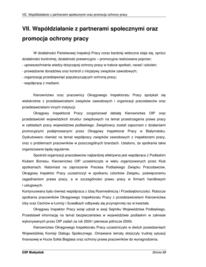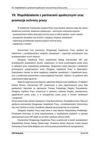 VII. Współdziałanie z partnerami społecznymi oraz promocja ochrony pracy W działalno ci Pa stwowej Inspekcji Pracy coraz bardziej widoczna staje si , oprócz działalno ci kontrolnej, działalno prewencyjno – promocyjna realizowana poprzez: - upowszechnianie wiedzy dotycz cej ochrony pracy w trakcie spotka , narad i szkole ; - prowadzenie doradztwa oraz kontroli z inicjatywy zwi zków zawodowych; - organizacj przedsi wzi popularyzuj cych ochron pracy; - współprac z mediami. Kierownictwo oraz pracownicy Okr gowego Inspektoratu Pracy spotykali si wielokrotnie z przedstawicielami zwi zków zawodowych i organizacji pracodawców oraz przedstawicielami innych instytucji. Okr gowy Inspektorat Pracy zorganizował debat Kierownictwa OIP oraz przedstawicieli wojewódzkich struktur zwi zkowych na temat przestrzegania prawa pracy w zakładach pracy województwa podlaskiego. Zwi zkowcy zostali zapoznani z działaniami promocyjnymi podejmowanymi przez Okr gowy Inspektorat Pracy w Białymstoku. Dyskutowano równie na temat współpracy zwi zków zawodowych z inspektorami pracy, oraz o problemach pracowników w poszczególnych bran ach. Ustalono, e spotkania takie organizowane b d regularnie. Spo ród organizacji pracodawców najbardziej efektywna jest współpraca z Podlaskim Klubem Biznesu. Kierownictwo OIP uczestniczyło w wielu organizowanych przez Klub spotkaniach. Natomiast na zaproszenie Prezesa Podlaskiego Zwi zku Pracodawców, Okr gowy Inspektor Pracy uczestniczył w spotkaniu członków Zwi zku, po wi conemu zagadnieniom prawa pracy, a w szczególno ci prawu pracy w firmach handlowych i usługowych. Kontynuowana była równie współpraca z Izb Rzemie lnicz i Przedsi biorczo ci. Robocze spotkania pracowników Okr gowego Inspektoratu Pracy z przedstawicielami Kierownictwa Izby oraz Cechów w Łom y i Suwałkach odbywały si przynajmniej raz w kwartale. Okr gowy Inspektor Pracy wzi ł udział w sesji Sejmiku Województwa Podlaskiego. Przedstawił informacj na temat bezpiecze stwa w województwie podlaskim w zakresie wykonywanych przez OIP zada za rok 2004 i pierwsze półrocze 2005r. Kierownictwo Okr gowego Inspektoratu Pracy uczestniczyło w dwóch posiedzeniach Wojewódzkiej Komisji Dialogu Społecznego. Omawiane tematy dotyczyły trudnej sytuacji finansowej w Hucie Szkła Biaglass oraz ochrony prawa pracowników do wynagrodzenia. W ramach prac nad popraw bezpiecze stwa w budownictwie czterokrotnie obradowała Podlaska Rada ds. Bezpiecze stwa Pracy w Budownictwie przy Okr gowym Inspektorze Pracy w Białymstoku. Z dniem 30 wrze nia zako czyła si pierwsza kadencja Rady, a poniewa spotkania osób zaanga owanych w popraw warunków bezpiecze stwa pracy w budownictwie okazały si celowe, powołano nowy skład Rady na drug kadencj . Jej pierwsze posiedzenie odbyło si 16 grudnia 2005r. W ramach wymiany informacji kierownictwo Okr gowego Inspektoratu Pracy spotykało si wielokrotnie z instytucjami oraz organizacjami działaj cymi w regionie, m.in. Pa stwow Stra Po arn , przedstawicielami starostw powiatowych i urz dów miasta, Wojewódzkiej Stacji Sanitarno – Epidemiologicznej. W roku 2005 pracownicy Okr gowego Inspektoratu w Białymstoku przeprowadzili 39 szkole dla działaczy zwi zkowych, społecznych inspektorów pracy, pracodawców oraz instytucji samorz dowych. Jest to o 13 szkole wi cej ni w roku 2004 i o 22 wi cej ni w roku 2003. W ród nich przeprowadzono 12 szkole dla 372 działaczy zwi zków zawodowych, przede wszystkim NSZZ ”Solidarno ”, z czego 6 szkole adresowanych było do społecznych inspektorów pracy zrzeszonych w Klubie Społecznego Inspektora Pracy przy Zarz dzie Regionu Podlaskiego NSZZ „Solidarno ”. Tematyka tych szkole ró norodna, od ogólnych zagadnie omówienie zagadnie była bardzo zwi zanych z prawem pracy, po szczegółowe dotycz cych wymogów unijnych do rodków ochrony indywidualnej, czy hałasu w miejscu pracy. Organizacje pracodawców zwracały si do OIP rzadziej ni organizacje zrzeszaj ce pracowników. Przeprowadzono 3 szkolenia dla członków organizacji pracodawców, w których przeszkolono 146 osób. W tematyce tych szkole dominowały zagadnienia dotycz ce bezpiecze stwa i higieny pracy w zakładach pracy, podczas jednego szkolenia omówiono zagadnienia prawa pracy w firmach handlowych i usługowych. Najliczniejsz grup osób przeszkolono na wniosek Kuratorium O wiaty. W czterech spotkaniach z inspektorem pracy uczestniczyło ok. 280 osób. Natomiast w ród innych instytucji zgłaszaj cych si do Okr gowego Inspektoratu Pracy, 7 szkole przeprowadzono na wniosek Zakładu Doskonalenia Zawodowego. Uczestniczyło w nich 197 osób. Poza tym przeprowadzono równie szkolenia dla pracowników Izby Celnej oraz Prokuratury Apelacyjnej w Białymstoku. Prowadzenie doradztwa dla partnerów społecznych, to kolejny obszar współpracy ze zwi zkami zawodowymi i organizacjami pracodawców. W 2005r. zwi zkom zawodowym udzielono 305 porad prawnych i technicznych, w tym trzykrotnie z pytaniami zwracali si społeczni inspektorzy pracy. Z pytaniami najcz ciej zwracały si : Zwi zek Nauczycielstwa Polskiego, Zakładowe Organizacje Zwi zkowe NSZZ „SOLIDARNO „SOLIDARNO „SOLIDARNO ” Baizet S.A., NSZZ 80” w Białymstoku, KM Pracowników O wiaty i Wychowania NSZZ ”, Ogólnopolski Zwi zek Zawodowy Piel gniarek i Poło nych w Białymstoku. W ród zadawanych pyta najwi cej, bo ponad 40% (124) dotyczyło zasad wynagradzania pracowników. Zwi zkowcy du e zainteresowanie wykazywali tak e tematami zwi zanymi z czasem pracy, a zwłaszcza z zasadami rekompensaty pracy w godzinach nadliczbowych. Tych spraw dotyczyły 82 porady udzielone przez pracowników OIP (ok. 27%). 37 porad, czyli około 12% zwi zanych było z Zakładowym Funduszem wiadcze Socjalnych, a 24 udzielone porady (8%) dotyczyły przepisów bezpiecze stwa i higieny pracy. 21 porad (7%) zwi zanych było z zagadnieniami Zakładowych Układów Zbiorowych Pracy. Natomiast pracodawcom w roku 2005 udzielono 9481 p