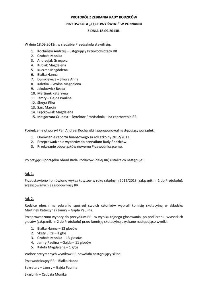 PROTOKÓŁ Z ZEBRANIA RADY RODZICÓW PRZEDSZKOLA „TĘCZOWY ŚWIAT” W POZNANIU Z DNIA 18.09.2013R. W dniu 18.09.2013r. w siedzibie Przedszkola stawili się: 1. 2. 3. 4. 5. 6. 7. 8. 9. 10. 11. 12. 13. 14. 15. Kochaoski Andrzej – ustępujący Przewodniczący RR Czubała Monika Andrzejak Grzegorz Kubiak Magdalena Kuczma Magdalena Białka Hanna Dumkiewicz – Sikora Anna Kaletka – Wolna Magdalena Jakubowicz Beata Martinek Katarzyna Jamry – Gajda Paulina Skręta Eliza Sass Marcin Frąckowiak Magdalena Małgorzata Czubała – Dyrektor Przedszkola – na zaproszenie RR Posiedzenie otworzył Pan Andrzej Kochaoski i zaproponował następujący porządek: 1. Omówienie raportu finansowego za rok szkolny 2012/2013. 2. Przeprowadzenie wyborów do prezydium Rady Rodziców. 3. Przekazanie obowiązków nowemu Przewodniczącemu. Po przyjęciu porządku obrad Rada Rodziców (dalej RR) ustaliła co następuje: Ad. 1. Przedstawiono i omówiono wykaz kosztów w roku szkolnym 2012/2013 (załącznik nr 1 do Protokołu), zrealizowanych z zasobów kasy RR. Ad. 2. Rodzice obecni na zebraniu spośród swoich członków wybrali komisję skutacyjną w składzie: Martinek Katarzyna i Jamry – Gajda Paulina. Przeprowadzono wybory do prezydium RR i w wyniku tajnego głosowania, po podliczeniu wszystkich głosów (załącznik nr 2 do Protokołu) przez komisję skutacyjną uzyskano następujące wyniki: 1. 2. 3. 4. 5. Białka Hanna – 12 głosów Skęty Eliza – 1 głos Czubała Monika – 13 głosów Jamry Paulina – Gajda – 11 głosów Kaleta Magdalena – 1 głos Wobec otrzymanych wyników RR powołała następujący skład: Przewodniczący RR – Białka Hanna Sekretarz – Jamry – Gajda Paulina Skarbnik – Czubała Monika Ad. 3. Dotychczasowy Przewodniczący RR przekazał swoje kompetencje nowej Przewodniczącej, która poza przyjętym porządkiem obrad zaproponowała następujące tematy do omówienia: 1. 2. 3. 4. 5. 6. Ustalenie wysokości składki dobrowolnej na RR. Publikacja dokumentów RR na stronie www Przedszkola; Zmiana regulaminu RR; Konto bankowe RR i wpłata składek na RR; Zajęcia edukacyjne ze szczególnym zwróceniem uwagi na najmłodsze dzieci z grupy I. Przedstawienie i zatwierdzenie programu profilaktyki i programu wychowawczego na rok szkolny 2013/2014. Ad. 3.1. RR ustaliła na rok szkolny 2013/2014 składkę dobrowolną w wysokości 15zł / dziecko/ m-c. Ad. 3.2. Ustalono, że począwszy od bieżącego roku szkolnego strona www Przedszkola zostanie rozbudowana o kolejną zakładkę „Rada Rodziców”, w której będą publikowane wszelkie informacje dotyczące RR. Ewentualne koszty rozbudowy strony www RR postanowiła pokryd z własnego budżetu. Osobą odpowiedzialną za realizację tematu jest Hanna Białka. Ad. 3.3. Hanna Białka zaproponowała uproszczenie regulaminu RR. Temat postanowiono kontynuowad na kolejnym zebraniu RR. Ad.3.4. Hanna Białka zaproponowała zmianę rachunku bankowego RR na rachunek bardziej nowoczesny i mniej kosztowny. Omówiono propozycję i po burzliwej dyskusji RR postanowiła wrócid do tematu na kolejnym zebraniu, a do tego czasu kontynuowad posiadanie rachunku w PKO BP na dotychczasowych zasadach. Jednocześnie RR ustaliła, że wpłata składek na RR w roku bieżącym będzie następowała tylko i wyłącznie na rachunek bankowy. Ad.3.5. Rozpoczęto dyskusję na temat zajęd edukacyjnych dla dzieci, ze szczególnym zwróceniem uwagi na dzieci z gr. I. Biorąc pod uwagę fakt, iż w kasie RR pozostały niewykorzystane w ubiegłym roku szkolnym środki, Hanna Białka zaproponowała wykorzystanie części środków na jednorazowy pokaz naukowy pt. „Fizyka dla Smyka” realizowany przez Akademię Nauki w siedzibie Przedszkola. Przeprowadzono burzliwą dyskusję, w tym również na temat wykorzystania wpłacanych na RR środków przez dzieci z gr. I. Nie podjęto żadnej decyzji. Temat będzie kontynuowany na kolejnym zebraniu. Ad.3.6. Dyrektor Przedszkola – Pani Małgorzata Czubała przedstawiła program profilaktyki i program wychowawczy na rok szkolny 2013/2014. Członkowie RR zapoznali się z treścią przedstawionych programów i jednogłośnie postanowili przyjąd do realizacji program profilaktyki i program wychowawczy na rok szkolny 2013/2014. Na tym zebranie zakooczono. Załączniki do Protokołu: Załącznik nr 1 – wykaz poniesionych kosztów przez RR w roku szkolnym 2013/2013. Załącznik nr 2 – karty głosowania Protokół sporządziła: Białka Hanna __________________ Białka Hanna