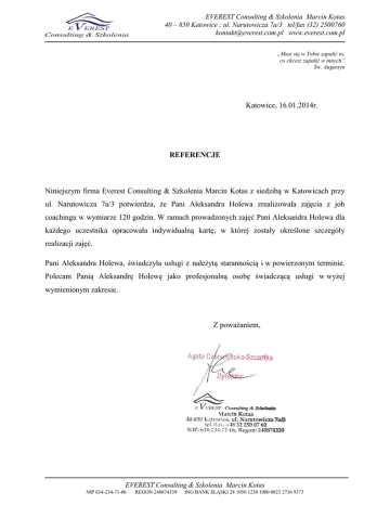 EVEREST Consulting & Szkolenia Marcin Kotas 40 – 850 Katowice ; ul. Narutowicza 7a/3 tel/fax (32) 2500760 [email protected] www.everest.com.pl „Musi się w Tobie zapalić to, co chcesz zapalić w innych” Św. Augustyn Katowice, 16.01.2014r. REFERENCJE Niniejszym firma Everest Consulting & Szkolenia Marcin Kotas z siedzibą w Katowicach przy ul. Narutowicza 7a/3 potwierdza, że Pani Aleksandra Holewa zrealizowała zajęcia z job coachingu w wymiarze 120 godzin. W ramach prowadzonych zajęć Pani Aleksandra Holewa dla każdego uczestnika opracowała indywidualną kartę, w której zostały określone szczegóły realizacji zajęć. Pani Aleksandra Holewa, świadczyła usługi z należytą starannością i w powierzonym terminie. Polecam Panią Aleksandrę Holewę jako profesjonalną osobę świadczącą usługi w wyżej wymienionym zakresie. Z poważaniem, EVEREST Consulting & Szkolenia Marcin Kotas NIP 634-234-71-06 REGON 240874339 ING BANK ŚLĄSKI 28 1050 1230 1000 0023 2736 9373