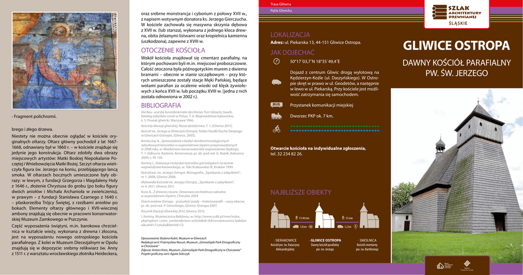 Trasa Główna oraz srebrne monstrancja i cyborium z połowy XVII w., z napisem wotywnym donatora ks. Jerzego Gierczucha. W kościele zachowała się masywna skrzynia dębowa z XVII w. (lub starsza), wykonana z jednego kloca drewna, obita żelaznymi listwami oraz kropielnica kamienna (uszkodzona), zapewne z XVIII w. OTOCZENIE KOŚCIOŁA Wokół kościoła znajdował się cmentarz parafialny, na którym pochowani byli m.in. miejscowi proboszczowie. Całość otoczona była późnogotyckim murem z dwiema bramami – obecnie w stanie szczątkowym – przy których umieszczone zostały stacje Męki Pańskiej, będące wotami parafian za ocalenie wioski od klęsk żywiołowych z końca XVII w. lub początku XVIII w. (jedna z nich została odnowiona w 2002 r.). • Fragment polichromii. brego i złego drzewa. Niestety nie można obecnie oglądać w kościele oryginalnych ołtarzy. Ołtarz główny pochodził z lat 16671668, odnawiany był w 1860 r. – w kościele znajduje się jedynie jego konstrukcja. Ołtarz zdobiły dwa obrazy miejscowych artystów: Matki Boskiej Niepokalanie Poczętej i Wniebowzięcia Matki Bożej. Szczyt ołtarza wieńczyła figura św. Jerzego na koniu, przebijającego lancą smoka. W ołtarzach bocznych umieszczone były obrazy: w lewym, z fundacji Grzegorza i Magdaleny Holy z 1646 r., złożenie Chrystusa do grobu (po boku figury dwóch aniołów i Michała Archanioła w zwieńczeniu), w prawym – z fundacji Stanisława Czarnego z 1640 r. – płaskorzeźba Trójcy Świętej, z rzeźbami aniołów po bokach. Elementy ołtarzy głównego i XVII-wiecznej ambony znajdują się obecnie w pracowni konserwatorskiej Muzeum Zamkowego w Pszczynie. Część wyposażenia świątyni, m.in. barokowa chrzcielnica w kształcie wieży, wykonana z drewna i złocona, jest na wyposażeniu nowego ostropskiego kościoła parafialnego. Z kolei w Muzeum Diecezjalnym w Opolu znajdują się w depozycie: srebrny relikwiarz św. Anny z 1511 r. z warsztatu wrocławskiego złotnika Heideckera, Pętla Gliwicka ŚLĄSKIE LOKALIZACJA Adres: ul. Piekarska 13, 44-151 Gliwice Ostropa. JAK DOJECHAĆ 50°17´03,7˝N 18°35´49,4˝E Dojazd z centrum Gliwic drogą wylotową na Kędzierzyn-Koźle (ul. Daszyńskiego). W Ostropie skręt w prawo w ul. Geodetów, a następnie w lewo w ul. Piekarską. Przy kościele jest możliwość zatrzymania się samochodem. BIBLIOGRAFIA Przystanek komunikacji miejskiej Die Bau- und die Kunstdenkmäler des Kreises Tost-Gleiwitz, bearb. Katalog zabytków sztuki w Polsce. T. 6: Województwo katowickie, z. 5: Powiat gliwicki, Warszawa 1966. Dworzec PKP ok. 7 km. Kościoły diecezji gliwickiej. Nasze dziedzictwo, T. 1, [Gliwice 2011]. Kościół św. Jerzego w Gliwicach Ostropie, folder Parafii Ducha Świętego w Gliwicach Ostropie, [Gliwice, 2005]. Konieczny A., Sprawozdanie z badań dendrochronologicznych zabytkowych kościołów w województwie śląskim przeprowadzonych w 2008 roku, w: Wiadomości konserwatorskie województwa śląskiego, T. 1: Odkrycia. Badania. Konserwacje, pr. zb. pod red. G. Bożek, Katowice 2009, s. 95-126. Otwarcie kościoła na indywidualne zgłoszenia, tel. 32 234 82 26. Kontny I., Dekoracje malarskie kościołów górnośląskich na terenie województwa katowickiego, w: Teki Krakowskie IX, Kraków 1999. Kościół pw. św. Jerzego Ostropa. Monografia, „Spotkanie z zabytkiem”, nr 1: 2008, Gliwice 2008. Malowidła kościoła św. Jerzego Ostropa, „Spotkanie z zabytkiem”, nr 4: 2011, Gliwice 2011. Kreis A., Z drewna ciosane. Drewniana architektura sakralna w województwie śląskim, Chorzów 2004 NAJBLIŻSZE OBIEKTY Osiem wieków Ostropy – przeszłość osady – historia parafii – czasy obecne, pr. zb. pod red. P. Góreckiego, Gliwice-Ostropa 2007. Rocznik Diecezji Gliwickiej 2012, Gliwice 2012. I. Kontny, Wszetecznica Babilonu, w: http://www.scdk.pl/new/index. php?option =com_content&view=article&id=843:wszetecznica-babilon u&catid=7:sztuka&Itemid=12. Opracowanie: Bożena Kubit, Muzeum w Gliwicach Redakcja serii: Przemysław Nocuń, Muzeum „Górnośląski Park Etnograficzny w Chorzowie” Zdjecia: Antoni Kreis, Muzeum „Górnośląski Park Etnograficzny w Chorzowie” Projekt graficzny serii: Agata Sobczyk 1 h 40 min 7,8 km • SIERAKOWICE Kościół pw. św. Katarzyny Aleksandryjskiej 55 min 5,2 km • GLIWICE OSTROPA Dawny kościół parafialny pw. św. Jerzego • SMOLNICA Kościół cmentarny pw. św. Bartłomieja GLIWICE OSTROPA DAWNY KOŚCIÓŁ PARAFIALNY PW. ŚW. JERZEGO HISTORIA PARAFII I KOŚCIOŁA Wieś Ostropa, przez wieki ściśle związana z pobliskimi Gliwicami, a od 1975 r. stanowiąca dzielnicę miasta, po raz pierwszy została wymieniona w dokumencie z 1286 r. Parafia w Ostropie istniała już z pewnością w 1335 r., kiedy to została ujęta w wykazach kościelnych, a pierwszy kościół wzmiankowany był w dokumentach z 1340 r. Został on spalony w czasie wojen husyckich w latach 1430-1433. Wkrótce kościół odbudowano, co odnotowane zostało w spisie kościelnym z 1447 r. Około 1640 r. przeprowadzono gruntowny remont świątyni oraz dodano ołtarz boczny pw. Trójcy Świętej fundacji Stanisława Czarnego. W 1643 r. kościół został częściowo spalony przez Szwedów i w 1667 r. odbudowany. Z tego czasu (1667-1668) pochodzi także polichromia zachowana do dzisiaj. Świątynię poświęcono w 1719 r. dedykując ją nie tylko św. Jerzemu, ale także św. Karolowi Boromeuszowi. Starszą od kościoła jest usytuowana od zachodu wieża, której konstrukcja – jak wynika z badań dendrochronologicznych – wzniesiona została z drewna dębowego i jodłowego z lat 1541-1544, natomiast iglica z drewna jodłowego z 1543-1544. Przez wieki kościół był wielokrotnie odnawiany, m.in. gruntowny remont przeprowadzono w latach 1874-1887, a w 1908 r. pokryto go nowym dachem z blachy cynkowej. W połowie XVII w. Ostropa utraciła samodzielność kościelną stając się filią parafii Wszystkich Świętych w Gliwicach. Sta