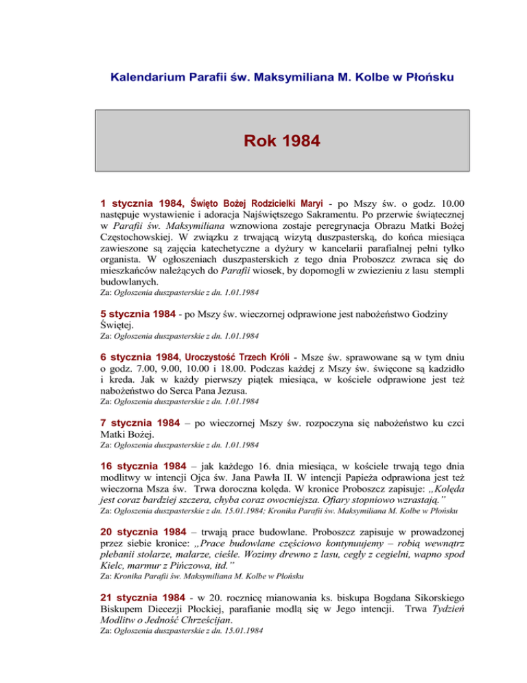 Kalendarium Parafii św. Maksymiliana M. Kolbe w Płońsku Rok 1984 1 stycznia 1984, Święto BoŜej Rodzicielki Maryi - po Mszy św. o godz. 10.00 następuje wystawienie i adoracja Najświętszego Sakramentu. Po przerwie świątecznej w Parafii św. Maksymiliana wznowiona zostaje peregrynacja Obrazu Matki BoŜej Częstochowskiej. W związku z trwającą wizytą duszpasterską, do końca miesiąca zawieszone są zajęcia katechetyczne a dyŜury w kancelarii parafialnej pełni tylko organista. W ogłoszeniach duszpasterskich z tego dnia Proboszcz zwraca się do mieszkańców naleŜących do Parafii wiosek, by dopomogli w zwiezieniu z lasu stempli budowlanych. Za: Ogłoszenia duszpasterskie z dn. 1.01.1984 5 stycznia 1984 - po Mszy św. wieczornej odprawione jest naboŜeństwo Godziny Świętej. Za: Ogłoszenia duszpasterskie z dn. 1.01.1984 6 stycznia 1984, Uroczystość Trzech Króli - Msze św. sprawowane są w tym dniu o godz. 7.00, 9.00, 10.00 i 18.00. Podczas kaŜdej z Mszy św. święcone są kadzidło i kreda. Jak w kaŜdy pierwszy piątek miesiąca, w kościele odprawione jest teŜ naboŜeństwo do Serca Pana Jezusa. Za: Ogłoszenia duszpasterskie z dn. 1.01.1984 7 stycznia 1984 – po wieczornej Mszy św. rozpoczyna się naboŜeństwo ku czci Matki BoŜej. Za: Ogłoszenia duszpasterskie z dn. 1.01.1984 16 stycznia 1984 – jak kaŜdego 16. dnia miesiąca, w kościele trwają tego dnia modlitwy w intencji Ojca św. Jana Pawła II. W intencji PapieŜa odprawiona jest teŜ wieczorna Msza św. Trwa doroczna kolęda. W kronice Proboszcz zapisuje: „Kolęda jest coraz bardziej szczera, chyba coraz owocniejsza. Ofiary stopniowo wzrastają.” Za: Ogłoszenia duszpasterskie z dn. 15.01.1984; Kronika Parafii św. Maksymiliana M. Kolbe w Płońsku 20 stycznia 1984 – trwają prace budowlane. Proboszcz zapisuje w prowadzonej przez siebie kronice: „Prace budowlane częściowo kontynuujemy – robią wewnątrz plebanii stolarze, malarze, cieśle. Wozimy drewno z lasu, cegły z cegielni, wapno spod Kielc, marmur z Pińczowa, itd.” Za: Kronika Parafii św. Maksymiliana M. Kolbe w Płońsku 21 stycznia 1984 - w 20. rocznicę mianowania ks. biskupa Bogdana Sikorskiego Biskupem Diecezji Płockiej, parafianie modlą się w Jego intencji. Trwa Tydzień Modlitw o Jedność Chrześcijan. Za: Ogłoszenia duszpasterskie z dn. 15.01.1984 82 22 stycznia 1984 - podczas Mszy św. o godz. 10.00 udzielony jest sakrament Chrztu św. W Parafii trwa peregrynacja Obrazu Matki BoŜej. W ogłoszeniach duszpasterskich Proboszcz informuje, iŜ dotychczasowy Biskup pomocniczy w Lublinie, ks. bp Zbigniew Kamiński, został mianowany koadiutorem Biskupa Diecezji Płockiej, Bogdana Sikorskiego. Za: Ogłoszenia duszpasterskie z dn. 22.01.1984 29 stycznia 1984 - w związku z zakończeniem dorocznej wizyty duszpasterskiej, Proboszcz Parafii mówi: "Odwiedziliśmy rodziny, które sobie tego Ŝyczyły. Wydaje się, Ŝe coraz więcej osób Ŝyczy sobie kolędy. Ogólnie - kolęda jest coraz bardziej szczera, w niektórych przypadkach - serdeczna i chyba owocna. Unikaliśmy dwóch skrajności nie powinna to być wizyta towarzyska, a z drugiej strony, przez wypytywanie o praktyki religijne - niezbyt dla rodziny przyjemna. Trudno utrafić - gdy nie pyta się na temat uczestnictwa we Mszy św. czy spowiedzi, ktoś moŜe wysnuć wniosek, Ŝe nam na tym nie zaleŜy. Ktoś inny, gdy go mobilizować do uczestnictwa, przyjmuje to jako nacisk, który wywiera odwrotny skutek. Zostawialiśmy informacje, by kaŜdy był zorientowany w tym, o co nam chodzi. Zostawialiśmy pamiątkę z poświęcenia dzwonów - jest tam miejsce na wpisanie nazwiska i adresu, po wypełnieniu stanie się ona dokumentem dla potomnych. Zostawialiśmy deklaracje, prosimy wpisać prace fachowe, jeśli kto moŜe - hydraulicy, elektrycy - te prace będziemy wykonywać zimą i powinni to wykonać parafianie pod jednym kierownictwem. Zbieraliśmy ofiary na kościół, były one większe niŜ w roku ubiegłym." Proboszcz informuje teŜ, Ŝe w lutym Parafia przyjmuje zapisy do Ruchu Trzeźwości św. Maksymiliana Kolbe. "Zapisanie się mobilizuje - mówi - Kościół ma pod tym względem bogaty dorobek - w 1857 roku w Płońsku wstąpiło do bractwa trzeźwości 1.198 osób zobowiązując się do całkowitej wstrzemięźliwości. My taką postawę traktujemy jako ofiarę - na zawsze lub na jakiś okres. śe ktoś nie będzie uŜywał alkoholu ani nim częstował. Oby jak najwięcej się zapisało. Inni - Ŝe zachowują trzeźwość i będą trzeźwość szerzyć w otoczeniu. Będziemy starali się takŜe otoczyć opieką rodziny alkoholików. Grzechem jest nie samo uŜycie lecz naduŜycie, które moŜe mieć róŜne formy - za duŜo, za często, ze szkodą dla zdrowia czy kieszeni, podczas pracy, szczególnie pracy odpowiedzialnej, będąc młodym. Przemyślmy sprawę. Księga juŜ jest przygotowana." W kronice zapisze:„Zorganizował się niby Klub Inteligencji Katolickiej. Formalnie występuje jako Ruch Trzeźwości św. Maksymiliana. Spotykamy się raz na dwa tygodnie o godz. 20.00. RozwaŜamy jakiś problem biblijny, czytamy Pismo św., dzielimy się wraŜeniami. Na koniec ja czytam moje rozwaŜania na temat poszczególnych wezwań Litanii Loretańskiej. Przychodzi około 20 osób. Sporo starszych.” Za: Ogłoszenia duszpasterskie z dn. 29.01.1984; Kronika Parafii św. Maksymiliana M. Kolbe w Płońsku 30 stycznia 1984 – w budynku nowo wybudowanej plebanii otwarta zostaje kancelaria parafialna. Przed południem czynna jest od godz. 9.00 do 10.00, po południu - w godz. 16.00 – 18.00. „PoniewaŜ wszystkie księgi zostają przeniesione do plebanii, dlatego w kościele Ŝadnych spraw zasadniczo nie załatwiamy" – ogłasza Proboszcz w niedzielę poprzedzającą otwarcie nowej kancelarii. W kronice odnotuje: „Kancelarię przenieśliśmy z kościoła do plebanii. Mamy dobrą kartotekę i kaŜdego załatwiamy z kartą w ręku.” Za: Ogłoszenia duszpasters