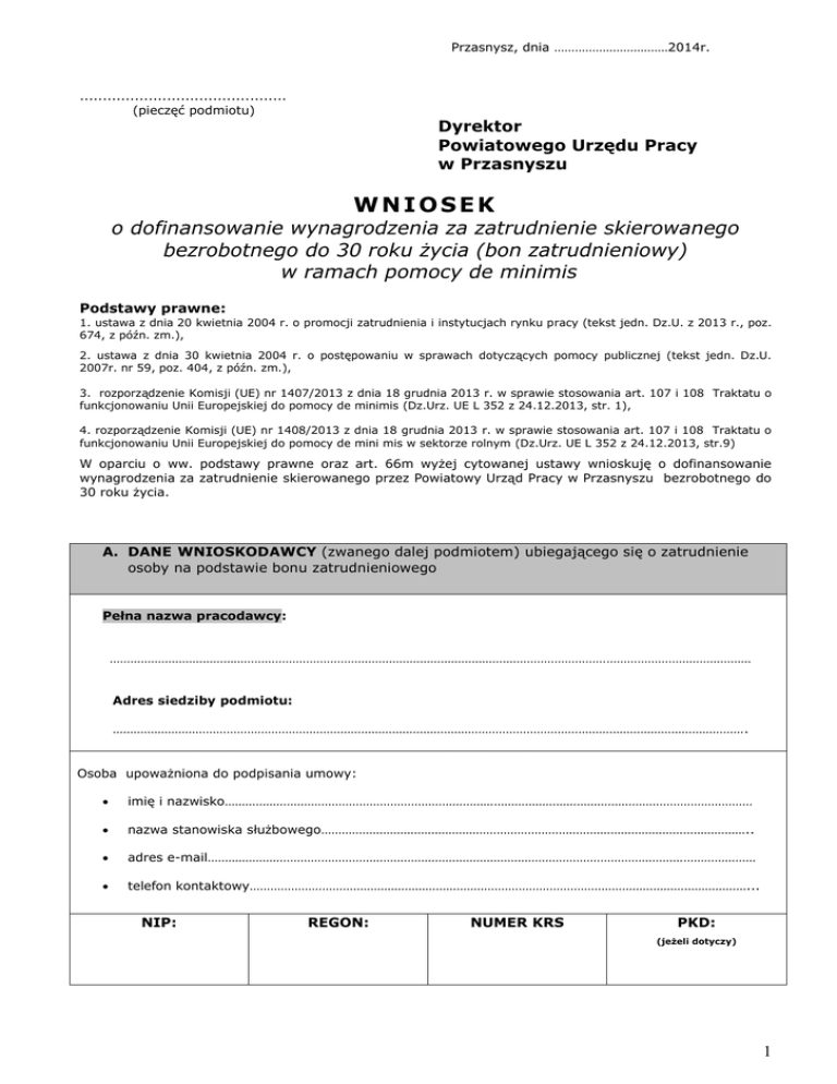Przasnysz, dnia ……………………………2014r. ............................................. (pieczęć podmiotu) Dyrektor Powiatowego Urzędu Pracy w Przasnyszu WNIOSEK o dofinansowanie wynagrodzenia za zatrudnienie skierowanego bezrobotnego do 30 roku życia (bon zatrudnieniowy) w ramach pomocy de minimis Podstawy prawne: 1. ustawa z dnia 20 kwietnia 2004 r. o promocji zatrudnienia i instytucjach rynku pracy (tekst jedn. Dz.U. z 2013 r., poz. 674, z późn. zm.), 2. ustawa z dnia 30 kwietnia 2004 r. o postępowaniu w sprawach dotyczących pomocy publicznej (tekst jedn. Dz.U. 2007r. nr 59, poz. 404, z późn. zm.), 3. rozporządzenie Komisji (UE) nr 1407/2013 z dnia 18 grudnia 2013 r. w sprawie stosowania art. 107 i 108 Traktatu o funkcjonowaniu Unii Europejskiej do pomocy de minimis (Dz.Urz. UE L 352 z 24.12.2013, str. 1), 4. rozporządzenie Komisji (UE) nr 1408/2013 z dnia 18 grudnia 2013 r. w sprawie stosowania art. 107 i 108 Traktatu o funkcjonowaniu Unii Europejskiej do pomocy de mini mis w sektorze rolnym (Dz.Urz. UE L 352 z 24.12.2013, str.9) W oparciu o ww. podstawy prawne oraz art. 66m wyżej cytowanej ustawy wnioskuję o dofinansowanie wynagrodzenia za zatrudnienie skierowanego przez Powiatowy Urząd Pracy w Przasnyszu bezrobotnego do 30 roku życia. A. DANE WNIOSKODAWCY (zwanego dalej podmiotem) ubiegającego się o zatrudnienie osoby na podstawie bonu zatrudnieniowego Pełna nazwa pracodawcy: …………………………………………………………………………………………………………………………………………………………………… Adres siedziby podmiotu: …………………………………………………………………………………………………………………………………………………………………. Osoba upoważniona do podpisania umowy: imię i nazwisko……………………………………………………………………………………………………………………………………… nazwa stanowiska służbowego…………………………………………………………………………………………………………….. adres e-mail…………………………………………………………………………………………………………………………………………… telefon kontaktowy………………………………………………………………………………………………………………………………... NIP: REGON: NUMER KRS PKD: (jeżeli dotyczy) 1 Forma prawna prowadzonej działalności: □ osoba fizyczna prowadząca działalność gospodarczą □ spółka cywilna spółki osobowe: □ jawna □ partnerska □ komandytowa spółki kapitałowe: □ spółka z ograniczoną odpowiedzialnością □ spółka akcyjna Wielkość przedsiębiorstwa: □ Mikroprzedsiębiorstwo: w co najmniej jednym z dwóch ostatnich lat obrotowych zatrudniające średniorocznie mniej niż 10 pracowników oraz osiągnięty roczny obrót netto ze sprzedaży towarów, wyrobów i usług oraz operacji finansowych nie przekraczający równowartości w złotych 2 mln euro lub sumy aktywów jego bilansu sporządzonego na koniec jednego z tych 2 lat nie przekraczający równowartości w złotych 2 mln euro. □ Małe przedsiębiorstwo: w co najmniej jednym z dwóch ostatnich lat obrotowych zatrudniał średniorocznie mniej niż 50 pracowników oraz osiągnął roczny obrót netto ze sprzedaży towarów, wyrobów i usług oraz operacji finansowych nie przekraczający równowartości w złotych 10 mln euro lub sumy aktywów jego bilansu sporządzonego na koniec jednego z tych 2 lat nie przekraczający równowartości w złotych 10 mln euro. □ Średnie przedsiębiorstwo: w co najmniej jednym z dwóch ostatnich lat obrotowych zatrudniał średniorocznie mniej niż 250 pracowników oraz osiągnął roczny obrót netto ze sprzedaży towarów, wyrobów i usług oraz operacji finansowych nie przekraczający równowartości w złotych 50 mln euro lub sumy aktywów jego bilansu sporządzonego na koniec jednego z tych 2 lat nie przekraczający równowartości w złotych 43 mln euro Data rozpoczęcia prowadzenia działalności: (zgodnie z dokumentem rejestracyjnym): Rodzaj prowadzonej działalności: (branża) Forma opodatkowania: Stawka opodatkowania: Stopa składek na ubezpieczenie wypadkowe Nazwa banku i numer rachunku bankowego podmiotu: 2 B. DANE DOTYCZĄCE PROWADZONEJ DZIAŁALNOŚCI 1. Liczba zatrudnionych pracowników w przeliczeniu na pełny wymiar czasu pracy w poszczególnych 12 miesiącach poprzedzających złożenie wniosku, a w przypadku prowadzenia działalności przez okres krótszy niż 12 m-cy należy podać zatrudnienie w poszczególnych miesiącach tej działalności Lp. Miesiąc i rok Liczba zatrudnionych pełen etat 1 2 Na dzień złożenia wniosku 1. 3 Niepełny wymiar (podać jaki) 1/2 4 5 6 Umowy zlecenie Pracownicy młodociani, pracownicy na urlopie macierzyńskim, wychowawczym Osoba prowadząca działalność podlegająca ubezpiecz. 7 8 9 2. 3. 4. 5. 6. 7. 8. 9. 10. 11. 12. Objaśnienia do tabeli: Wyliczenia stanu zatrudnienia w etatach należy dokonać ze wskazaniem do dwóch miejsc po przecinku. Przy wypełnianiu tabeli nie uwzględnia się osób bezrobotnych skierowanych przez powiatowy urząd pracy do odbycia stażu i przygotowania zawodowego. Uwaga!: Do stanu zatrudnienia nie wlicza się: osób wykonujących pracę nakładczą uczniów, którzy zawarli z zakładem pracy umowę o naukę zawodu lub przyuczenie do wykonywania określonej pracy; osób zatrudnionych na podstawie umowy o dzieło lub umowy zlecenia, osób przebywających na urlopach macierzyńskich, wychowawczych oraz bezpłatnych 3 2 Stan zatrudnienia na dzień złożenia wniosku w przeliczeniu na pełny etat 3 Średni stan zatrudnienia pracowników w przeliczeniu na pełne etaty z okresu ostatnich 12 m-cy przed złożeniem wniosku ………….