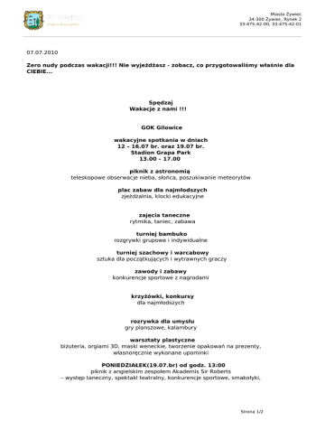 Miasto Żywiec 34-300 Żywiec, Rynek 2 33-475-42-00, 33-475-42-01 07.07.2010 Zero nudy podczas wakacji!!! Nie wyjeżdżasz - zobacz, co przygotowaliśmy właśnie dla CIEBIE... Spędzaj Wakacje z nami !!! GOK Gilowice wakacyjne spotkania w dniach 12 – 16.07 br. oraz 19.07 br. Stadion Grapa Park 13.00 – 17.00 piknik z astronomią teleskopowe obserwacje nieba, słońca, poszukiwanie meteorytów plac zabaw dla najmłodszych zjeżdżalnia, klocki edukacyjne zajęcia taneczne rytmika, taniec, zabawa turniej bambuko rozgrywki grupowe i indywidualne turniej szachowy i warcabowy sztuka dla początkujących i wytrawnych graczy zawody i zabawy konkurencje sportowe z nagrodami krzyżówki, konkursy dla najmłodszych rozrywka dla umysłu gry planszowe, kalambury warsztaty plastyczne biżuteria, orgiami 3D, maski weneckie, tworzenie opakowań na prezenty, własnoręcznie wykonane upominki PONIEDZIAŁEK(19.07.br) od godz. 13:00 piknik z angielskim zespołem Akademis Sir Roberts – występ taneczny, spektakl teatralny, konkurencje sportowe, smakołyki, Strona 1/2 Miasto Żywiec 34-300 Żywiec, Rynek 2 33-475-42-00, 33-475-42-01 zabawa taneczna dla wszystkich do godz. 22:00. Zaprasza Gminny Ośrodek Kultury w Gilowicach oraz Parafialny Klub Sportowy OLIMPIJCZYK Strona 2/2 Powered by TCPDF (www.tcpdf.org)