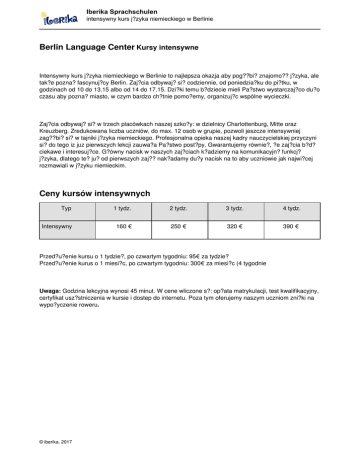 Iberika Sprachschulen intensywny kurs j?zyka niemieckiego w Berlinie Berlin Language Center Kursy intensywne Intensywny kurs j?zyka niemieckiego w Berlinie to najlepsza okazja aby pog??bi? znajomo?? j?zyka, ale tak?e pozna? fascynuj?cy Berlin. Zaj?cia odbywaj? si? codziennie, od poniedzia?ku do pi?tku, w godzinach od 10 do 13.15 albo od 14 do 17.15. Dzi?ki temu b?dziecie mieli Pa?stwo wystarczaj?co du?o czasu aby pozna? miasto, w czym bardzo ch?tnie pomo?emy, organizuj?c wspólne wycieczki. Zaj?cia odbywaj? si? w trzech placówkach naszej szko?y: w dzielnicy Charlottenburg, Mitte oraz Kreuzberg. Zredukowana liczba uczniów, do max. 12 osob w grupie, pozwoli jeszcze intensywniej zag??bi? si? w tajniki j?zyka niemieckiego. Profesjonalna opieka naszej kadry nauczycielskiej przyczyni si? do tego iz juz pierwszych lekcji zauwa?a Pa?stwo post?py. Gwarantujemy równie?, ?e zaj?cia b?d? ciekawe i interesuj?ce. G?ówny nacisk w naszych zaj?ciach k?adziemy na komunikacyjn? funkcj? j?zyka, dlatego te? ju? od pierwszych zaj?? nak?adamy du?y nacisk na to aby uczniowie jak najwi?cej rozmawiali w j?zyku niemieckim. Ceny kursów intensywnych Typ 1 tydz. 2 tydz. 3 tydz. 4 tydz. Intensywny 160 € 250 € 320 € 390 € Przed?u?enie kursu o 1 tydzie?, po czwartym tygodniu: 95€ za tydzie? Przed?u?enie kurus o 1 miesi?c, po czwartym tygodniu: 300€ za miesi?c (4 tygodnie Uwaga: Godzina lekcyjna wynosi 45 minut. W cene wliczone s?: op?ata matrykulacji, test kwalifikacyjny, certyfikat usz?stniczenia w kursie i dostep do internetu. Poza tym oferujemy naszym uczniom zni?ki na wypo?yczenie roweru. © iberika. 2017 Powered by TCPDF (www.tcpdf.org)