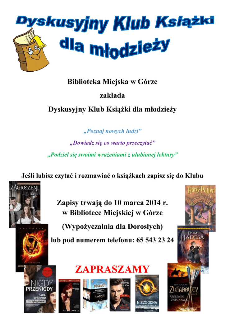 Biblioteka Miejska w Górze zakłada Dyskusyjny Klub KsiąŜki dla młodzieŜy „Poznaj nowych ludzi” „Dowiedz się co warto przeczytać” „Podziel się swoimi wraŜeniami z ulubionej lektury” Jeśli lubisz czytać i rozmawiać o ksiąŜkach zapisz się do Klubu Zapisy trwają do 10 marca 2014 r. w Bibliotece Miejskiej w Górze (WypoŜyczalnia dla Dorosłych) lub pod numerem telefonu: 65 543 23 24 ZAPRASZAMY