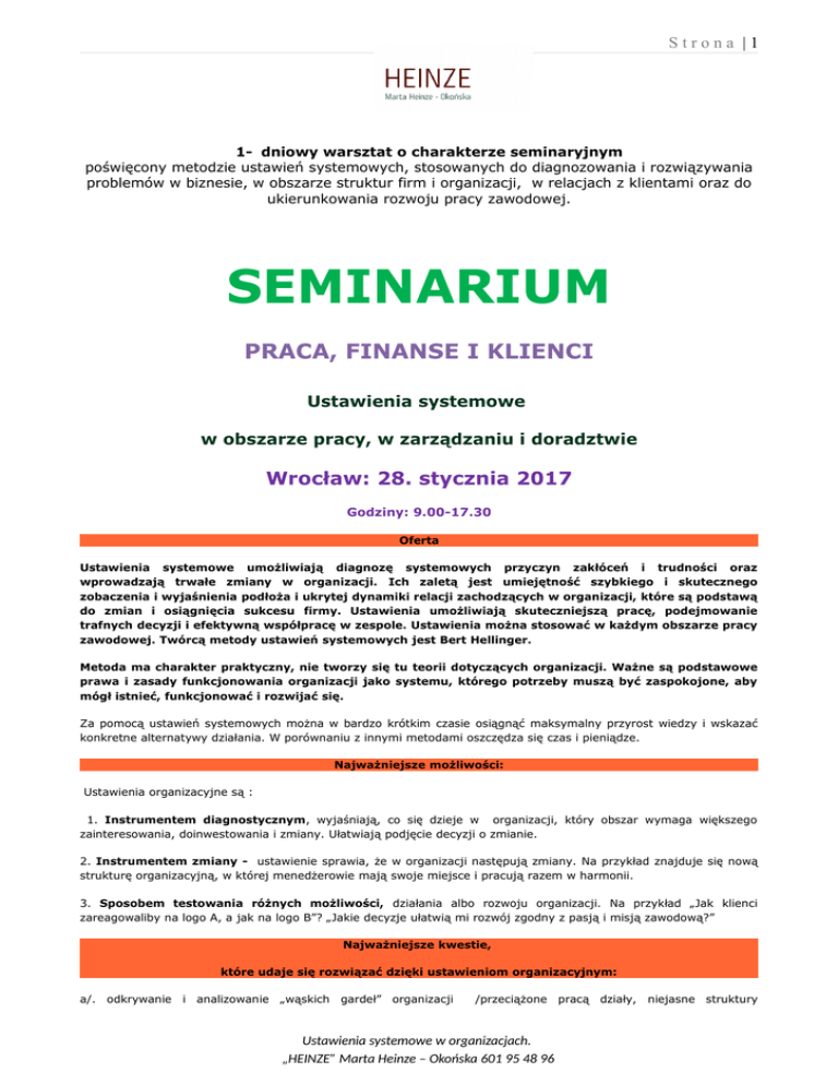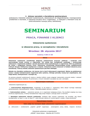 Strona |1 1- dniowy warsztat o charakterze seminaryjnym poświęcony metodzie ustawień systemowych, stosowanych do diagnozowania i rozwiązywania problemów w biznesie, w obszarze struktur firm i organizacji, w relacjach z klientami oraz do ukierunkowania rozwoju pracy zawodowej. SEMINARIUM PRACA, FINANSE I KLIENCI Ustawienia systemowe w obszarze pracy, w zarządzaniu i doradztwie Wrocław: 28. stycznia 2017 Godziny: 9.00-17.30 Oferta Ustawienia systemowe umożliwiają diagnozę systemowych przyczyn zakłóceń i trudności oraz wprowadzają trwałe zmiany w organizacji. Ich zaletą jest umiejętność szybkiego i skutecznego zobaczenia i wyjaśnienia podłoża i ukrytej dynamiki relacji zachodzących w organizacji, które są podstawą do zmian i osiągnięcia sukcesu firmy. Ustawienia umożliwiają skuteczniejszą pracę, podejmowanie trafnych decyzji i efektywną współpracę w zespole. Ustawienia można stosować w każdym obszarze pracy zawodowej. Twórcą metody ustawień systemowych jest Bert Hellinger. Metoda ma charakter praktyczny, nie tworzy się tu teorii dotyczących organizacji. Ważne są podstawowe prawa i zasady funkcjonowania organizacji jako systemu, którego potrzeby muszą być zaspokojone, aby mógł istnieć, funkcjonować i rozwijać się. Za pomocą ustawień systemowych można w bardzo krótkim czasie osiągnąć maksymalny przyrost wiedzy i wskazać konkretne alternatywy działania. W porównaniu z innymi metodami oszczędza się czas i pieniądze. Najważniejsze możliwości: Ustawienia organizacyjne są : 1. Instrumentem diagnostycznym, wyjaśniają, co się dzieje w organizacji, który obszar wymaga większego zainteresowania, doinwestowania i zmiany. Ułatwiają podjęcie decyzji o zmianie. 2. Instrumentem zmiany - ustawienie sprawia, że w organizacji następują zmiany. Na przykład znajduje się nową strukturę organizacyjną, w której menedżerowie mają swoje miejsce i pracują razem w harmonii. 3. Sposobem testowania różnych możliwości, działania albo rozwoju organizacji. Na przykład „Jak klienci zareagowaliby na logo A, a jak na logo B”? „Jakie decyzje ułatwią mi rozwój zgodny z pasją i misją zawodową?” Najważniejsze kwestie, które udaje się rozwiązać dzięki ustawieniom organizacyjnym: a/. odkrywanie i analizowanie „wąskich gardeł” organizacji /przeciążone pracą działy, niejasne struktury Ustawienia systemowe w organizacjach. „HEINZE” Marta Heinze – Okońska 601 95 48 96 Strona |2 organizacyjne, zatarte różnice między rolami, brak koordynacji i komunikacji lub niedostateczna koordynacja i komunikacja/ b/. kierowanie organizacją /jak można lepiej podejmować decyzje, jak stworzyć lepszą strukturę zarządzania, jak poprawić przepływ informacji do i od lidera/ c/. źródła potencjalnych konfliktów d/. zachowania powodujące niepotrzebne napięcia /brak szacunku, tworzenie koalicji i impasu terytorialnego, nie oddzielanie spraw prywatnych od spraw zawodowych, zachowania aroganckie i buntownicze, nieobjęte stanowiska lub obowiązki, „czarne owce”, duża fluktuacja kadr/ e/. szukanie celów, które można osiągnąć, i realistycznych strategii f/. tworzenie organizacji, nowej firmy g/. wyznaczanie następcy w biznesie rodzinnym h/. badanie swojej pozycji w organizacji, firmie i/. podejmowanie decyzji /czy powinienem zostać, czy odejść, czy możemy podjąć to wyzwanie, czy nie; kto z chętnych nadaje się na to stanowisko, czy stanowisko jest potrzebne/ j/. tworzenie dobrej atmosfery pracy /czy brakuje wsparcia dla jakiejś osoby albo zespołu/ k/. określanie zagrożeń dla zdrowia i zapobieganie wypaleniu zawodowemu/ l/. kwestie dotyczące marketingu, sprzedaży, produktów, relacji z klientami m/. kwestie dotyczące kariery i rozwoju zawodowego zgodnego z misją lub pasją zawodową Do kogo kierowana jest oferta: Właścicieli i pracowników firm różnej wielkości Właścicieli firm rodzinnych Osób zarządzających zespołami, kadry menedżerskiej wysokiego i niższego szczebla Pracowników firm i organizacji samorządowych i budżetowych, a także prywatnych Osób, które zajmują się doradztwem i szkoleniami w biznesie Osób indywidualnych poszukujących rozwiązań w kwestii decyzji zawodowych lub swojego funkcjonowania w pracy, chcących: Poznać metodę ustawień , ich potencjał i możliwości stosowania Zyskać większą świadomość zachodzących procesów w środowisku zawodowym Poznać głębsze źródła motywacji, wynikające z uwarunkowań systemowych Rozpoznać prawidłowości rządzące sukcesami i porażkami firm, projektów, zespołów, relacji PLAN SEMINARIUM I USTAWIEŃ I/. WYKŁAD: Podczas wykładu wyjaśnię Państwu na czym polegają ustawienia zawodowe i jak można z nich korzystać Zakres wykładu przedstawiam poniżej w 10 punktach. Ustawienia systemowe w organizacjach. „HEINZE” Marta Heinze – Okońska 601 95 48 96 Strona |3 1. Obszary stosowania ustawień systemowych 2. Reguły porządku systemowego 3. Miejsce i zasoby jako szefa i/lub pracownika 4. Hierarchie w firmie 5. Warunki dobrego funkcjonowania zespołu 6. Rozpoznawanie podłoża konfliktów i ukrytej dynamiki relacji 7. Struktura formalna i nieformalna w firmie 8. Poszukiwanie optymalnych rozwiązań 9. Coaching i doradztwo w sprawach zawodowych i biznesowych 10. Rozwój osobisty szefa i/lub pracownika II/. USTAWIENIA Będzie można zadawać pytania, ustawiać własne tematy i dyskutować o tzw „wąskich gardłach” w obszarze pracy, relacji w zespołach oraz z szefami a także swoich decyzjach i zamiarach Otrzymacie Państwo najnowsze materiały dotyczące zastosowania tej metody w organizacjach, artykuły i konkretne case’y – opisy ustawień zawodowych Temat konsultacji, doradztwa, sesji i ustawienia objęty jest pełną dyskrecją. Obowiązuje mnie zasada poufności. INWESTYCJA Udział w seminarium i ustawieniach 350,- zł (*) możliwość wystawienia faktury VAT /+23% do ceny/ O us