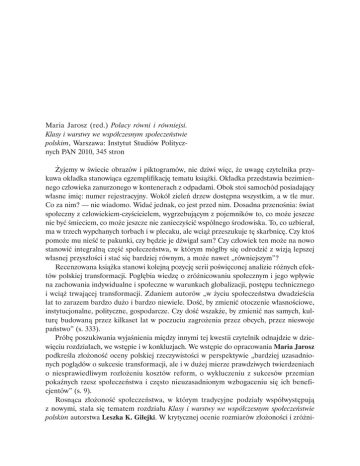 Maria Jarosz (red.) Polacy równi i równiejsi. Klasy i warstwy we współczesnym społeczeństwie polskim, Warszawa: Instytut Studiów Politycznych PAN 2010, 345 stron Żyjemy w świecie obrazów i piktogramów, nie dziwi więc, że uwagę czytelnika przykuwa okładka stanowiąca egzemplifikację tematu książki. Okładka przedstawia bezimiennego człowieka zanurzonego w kontenerach z odpadami. Obok stoi samochód posiadający własne imię: numer rejestracyjny. Wokół zieleń drzew dostępna wszystkim, a w tle mur. Co za nim? — nie wiadomo. Widać jednak, co jest przed nim. Dosadna przenośnia: świat społeczny z człowiekiem-czyścicielem, wygrzebującym z pojemników to, co może jeszcze nie być śmieciem, co może jeszcze nie zanieczyścić wspólnego środowiska. To, co uzbierał, ma w trzech wypchanych torbach i w plecaku, ale wciąż przeszukuje tę skarbnicę. Czy ktoś pomoże mu nieść te pakunki, czy będzie je dźwigał sam? Czy człowiek ten może na nowo stanowić integralną część społeczeństwa, w którym mógłby się odrodzić z wizją lepszej własnej przyszłości i stać się bardziej równym, a może nawet „równiejszym”? Recenzowana książka stanowi kolejną pozycję serii poświęconej analizie różnych efektów polskiej transformacji. Pogłębia wiedzę o zróżnicowaniu społecznym i jego wpływie na zachowania indywidualne i społeczne w warunkach globalizacji, postępu technicznego i wciąż trwającej transformacji. Zdaniem autorów „w życiu społeczeństwa dwadzieścia lat to zarazem bardzo dużo i bardzo niewiele. Dość, by zmienić otoczenie własnościowe, instytucjonalne, polityczne, gospodarcze. Czy dość wszakże, by zmienić nas samych, kulturę budowaną przez kilkaset lat w poczuciu zagrożenia przez obcych, przez nieswoje państwo” (s. 333). Próbę poszukiwania wyjaśnienia między innymi tej kwestii czytelnik odnajdzie w dziewięciu rozdziałach, we wstępie i w konkluzjach. We wstępie do opracowania Maria Jarosz podkreśla złożoność oceny polskiej rzeczywistości w perspektywie „bardziej uzasadnionych poglądów o sukcesie transformacji, ale i w dużej mierze prawdziwych twierdzeniach o niesprawiedliwym rozłożeniu kosztów reform, o wykluczeniu z sukcesów przemian pokaźnych rzesz społeczeństwa i często nieuzasadnionym wzbogaceniu się ich beneficjentów” (s. 9). Rosnąca złożoność społeczeństwa, w którym tradycyjne podziały współwystępują z nowymi, stała się tematem rozdziału Klasy i warstwy we współczesnym społeczeństwie polskim autorstwa Leszka K. Gilejki. W krytycznej ocenie rozmiarów złożoności i zróżni- 142 Recenzje cowania społeczeństwa, przejawiających się głownie w powiększaniu sfery ubóstwa, autor wskazuje na istnienie procesów strukturotwórczych, w tym rozwoju nowych klas społecznych, towarzyszących marginalizacji i zjawiskom wykluczenia społecznego. Zdaniem autora głównymi czynnikami zróżnicowania społecznego była kiedyś władza, a obecnie są nimi zasoby oraz władza ekonomiczna. Wpływają one na powstawanie nowej klasy, czemu sprzyja „rewolucja dochodowa, gwałtowne zróżnicowanie poziomu dochodów i ich polaryzacja” (s. 25). Marginalizacja i zwiększenie rozmiarów sfery ubóstwa oraz ryzyko znalezienia się w jego obszarze powodują anomię i nasilenie napięć społecznych, tym bardziej że wykluczeni, nie czując się związani ze społeczeństwem, nie respektują jego praw, co w konsekwencji stanowi niebezpieczeństwo dla społeczeństwa. Zróżnicowanie procesów rozwojowych (w tym dochodowych) w wymiarze horyzontalnym, terytorialnym, stało się tematem rozdziału Dysproporcje materialne i edukacyjne w układzie terytorialnym Marka W. Kozaka. Autor zauważa, iż Polska, podobnie jak Węgry, Słowacja, Irlandia i Wielka Brytania, charakteryzuje się wysokim i rosnącym zróżnicowaniem różnych regionów kraju, czemu towarzyszy natężenie ubóstwa w układzie przestrzennym. Zróżnicowanie dochodowe widoczne jest w metropoliach, w których koncentrują działalność nowe kadry o wysokich kwalifikacjach, utrwalając podział na lepsze i gorsze dzielnice. Kozak, pisząc o dylemacie polityki rozwojowej UE dotyczącym wyboru celu: równości lub efektywności, wskazuje na konieczność inwestowania w tak zwane miękkie czynniki rozwoju: kapitał ludzki i społeczny oraz środowisko sprzyjające innowacjom. Odwrócenie proporcji wydatków na niekorzyść infrastruktury, będącej elementem wsparcia dla rozwijającej się aktywności ekonomicznej, skutkuje dryfem rozwojowym i dalszą utratą konkurencyjności Polski i UE. Tezę o postępującym wzroście zróżnicowań materialnych potwierdza Krzysztof Jasiecki w rozdziale O nieznanych, z reguły nie badanych kręgach bogactwa, w którym wskazuje na efekt kumulacji zasobów materialnych w dłuższym czasie i w kręgu bliskich krewnych wskutek dywersyfikacji źródeł ich dochodów. Badania rozkładu samych dochodów pomijające „analizę zasobów materialnych w tzw. elicie bogactwa1, zmniejszają zakres wykazywanych nierówności i spłaszczają skalę zróżnicowań ekonomicznych” (s. 74). Zdaniem autora „brak rzetelnej wiedzy o rozmiarach kontrastów dochodowych ułatwia legitymizację istniejącego ustroju” (s. 73) i jest wygodny dla beneficjentów zmian ustrojowych: kadr kierowniczych administracji państwowej i gospodarki, części inteligencji i prywatnych przedsiębiorców tworzących nową klasę średnią oraz liczących się partii politycznych” (s. 75). Najnowszy kryzys finansowy i gospodarczy wpłynął na zmniejszenie w Polsce liczby osób bogatych (25,3%, s. 101), ale najbardziej uderzył w aktywa finansowe rodzin w Stanach Zjednoczonych, zmniejszając je o 21,8% (w Europie o 5,8%, s. 102). W 2008 roku klienci o wysokiej zamożności, posiadający wolne aktywa o wartości co najmniej Główny Urząd Statystyczny nie rejestruje dochodów ludzi najlepiej zarabiających