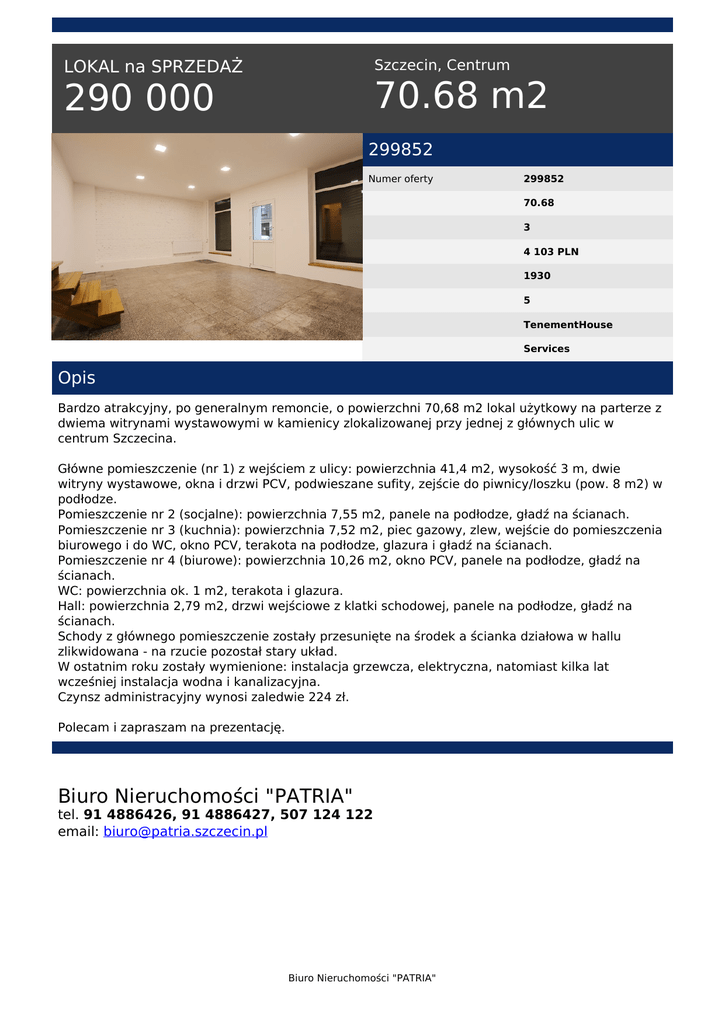Szczecin, Centrum LOKAL na SPRZEDAŻ 70.68 m2 290 000 299852 Numer oferty 299852 70.68 3 4 103 PLN 1930 5 TenementHouse Services Opis Bardzo atrakcyjny, po generalnym remoncie, o powierzchni 70,68 m2 lokal użytkowy na parterze z dwiema witrynami wystawowymi w kamienicy zlokalizowanej przy jednej z głównych ulic w centrum Szczecina. Główne pomieszczenie (nr 1) z wejściem z ulicy: powierzchnia 41,4 m2, wysokość 3 m, dwie witryny wystawowe, okna i drzwi PCV, podwieszane sufity, zejście do piwnicy/loszku (pow. 8 m2) w podłodze. Pomieszczenie nr 2 (socjalne): powierzchnia 7,55 m2, panele na podłodze, gładź na ścianach. Pomieszczenie nr 3 (kuchnia): powierzchnia 7,52 m2, piec gazowy, zlew, wejście do pomieszczenia biurowego i do WC, okno PCV, terakota na podłodze, glazura i gładź na ścianach. Pomieszczenie nr 4 (biurowe): powierzchnia 10,26 m2, okno PCV, panele na podłodze, gładź na ścianach. WC: powierzchnia ok. 1 m2, terakota i glazura. Hall: powierzchnia 2,79 m2, drzwi wejściowe z klatki schodowej, panele na podłodze, gładź na ścianach. Schody z głównego pomieszczenie zostały przesunięte na środek a ścianka działowa w hallu zlikwidowana - na rzucie pozostał stary układ. W ostatnim roku zostały wymienione: instalacja grzewcza, elektryczna, natomiast kilka lat wcześniej instalacja wodna i kanalizacyjna. Czynsz administracyjny wynosi zaledwie 224 zł. Polecam i zapraszam na prezentację. Biuro Nieruchomości "PATRIA" tel. 91 4886426, 91 4886427, 507 124 122 email: [email protected] Biuro Nieruchomości "PATRIA" Powered by TCPDF (www.tcpdf.org)