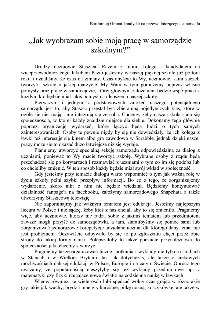 Bartłomiej Granat-kandydat na przewodniczącego samorządu „Jak wyobrażam sobie moją pracę w samorządzie szkolnym?” Drodzy uczniowie Staszica! Razem z moim kolegą i kandydatem na wiceprzewodniczącego Jakubem Pazio jesteśmy w naszej pięknej szkole już półtora roku i uznaliśmy, że czas na zmiany. Czas abyście to Wy, uczniowie, sami zaczęli tworzyć szkołę o jakiej marzycie. My Wam w tym pomożemy poprzez własne pomysły oraz pracę w samorządzie, której głównym założeniem będzie współpraca z każdym kto będzie miał jakiś pomysł na ulepszenia naszej szkoły. Pierwszym i jednym z podstawowych założeń naszego potencjalnego samorządu jest to, aby Staszic przestał być zbieraniną pojedynczych klas, które w ogóle się nie znają i nie integrują się ze sobą. Chcemy, żeby nasza szkoła stała się społecznością, w której każdy znajdzie miejsce dla siebie. Dokonamy tego głównie poprzez organizację wydarzeń, które łączyć będą ludzi o tych samych zainteresowaniach. Osoby te pewnie nigdy by się nie dowiedziały, że ich kolega z ławki też interesuje się kinem albo gra zawodowo w Scrabble, jednak dzięki naszej pracy może się to okazać dużo łatwiejsze niż się wydaje. Planujemy utworzyć specjalną sekcję samorządu odpowiedzialną za dialog z uczniami, ponieważ to Wy macie tworzyć szkołę. Wybrane osoby z rządu będą przechadzać się po korytarzach i rozmawiać z uczniami o tym co im się podoba lub co chcieliby zmienić. W ten sposób każdy będzie miał swój wkład w społeczność. Gdy jesteśmy przy temacie dialogu warto wspomnieć o tym jak ważną rolę w życiu szkoły pełni szybki przepływ informacji. Bo co z tego, że zorganizujemy wydarzenie, skoro nikt o nim nie będzie wiedział. Będziemy kontynuować działalność fanpage'a na facebooku, założymy samorządowego Snapchata a także utworzymy Staszicową telewizję. Nie zapominajmy jak ważnym tematem jest edukacja. Jesteśmy najlepszym liceum w Polsce i nie sądzę, żeby ktoś z nas chciał, aby to się zmieniło. Pragniemy więc, aby uczniowie, którzy nie radzą sobie z jakimś tematem lub przedmiotem zawsze mogli przyjść do samorządówki, a tam, staralibyśmy się pomóc sami lub zorganizować jednorazowe korepetycje udzielane ucznia, dla którego dany temat nie jest problemem. Oczywiście odbywało by się to po zgłoszeniu chęci przez obie strony do takiej formy nauki. Polepszałoby to także poczucie przynależności do społeczności jaką chcemy stworzyć. Pragniemy także organizować liczne spotkania i wykłady nie tylko o studiach w Stanach i w Wielkiej Brytanii, tak jak dotychczas, ale także o ciekawych możliwościach dalszej edukacji w Polsce, Europie i na całym Świecie. Oprócz tego uważamy, że popularnością cieszyłyby się też wykłady przedmiotowe np. z matematyki czy fizyki rzucające nowe światło na codzienną naukę w ławkach. Wiemy również, że wiele osób lubi spędzać wolny czas grając w różnorakie gry takie jak szachy, brydż i inne gry karciane, piłkę nożną, koszykówkę, ale także w gry komputerowe(LoL,Dota,CS:GO,Starcraft i wiele innych). Co, gdyby samorząd tworzył możliwości porównania swoich umiejętności z ludźmi z całej szkoły i w dodatku oferował symboliczne nagrody dla zwycięzców? Naszym zdaniem byłaby to świetna rzecz, której jeszcze nigdy w naszej szkole nie było. Chcielibyśmy także aby najmniejsze rzeczy irytujące nas każdego dnia, a łatwe do rozwiązania nie były zamiatane pod dywan czy odkładane na później, ale jak najszybciej wyjaśniane. Przykładami takich spraw, które mi, jako osobie spędzającej w ciepłe dni długie przerwy na boisku, doskwierały były np. zamykane podczas przerwy drzwi na boisko czy brak ogólnodostępnych kubeczków przy dozownikach z wodą. Podsumowując uważam, że w naszej szkole potrzebny jest samorząd, który będzie głosem całej szkoły, a nie tylko kilku najbliższych przyjaciół przewodniczącego. W rządzie moim i Kuby Pazio każdy będzie mógł się udzielać i wszystkie propozycje zostaną wysłuchane. Proponujemy dialog i racjonalne obietnice, które sprawią, że każdy kolejny dzień w Staszicu będzie coraz lepszy.