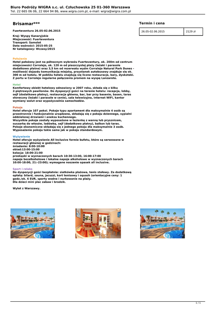 Biuro Podróży WIGRA s.c. ul. Człuchowska 25 01-360 Warszawa Tel. 22 665 06 06, 22 664 94 86, www.wigra.com.pl, e-mail: [email protected] Brisamar*** Fuerteventura 26.05-02.06.2015 Termin i cena 26.05-02.06.2015 2129 zł Kraj: Wyspy Kanaryjskie Miejscowość: Fuerteventura Transport: Samolot Data ważności: 2015-05-25 Nr katalogowy: Wczasy/2015 Położenie Hotel położony jest na północnym wybrzeżu Fuerteventury, ok. 200m od centrum miejscowości Corralejo, ok. 120 m od piaszczystej plaży (leżaki i parasole dodatkowo płatne) oraz 3,5 km od rezerwatu wydm Corralejo Natural Park Dunes możliwość dojazdu komunikacją miejską, przystanek autobusowy znajduje się ok. 300 m od hotelu. W pobliżu hotelu znajdują się liczne restauracje, bary, dyskoteki. Z portu w Corralejo regularne połączenia promem na wyspę Lanzarote. Hotel Komfortowy obiekt hotelowy odnowiony w 2007 roku, składa się z kilku 2-piętrowych pawilonów. Do dyspozycji gości na terenie hotelu: recepcja, lobby, sejf (dodatkowo płatny), restauracja główna, bar, bar przy basenie, basen, taras słoneczny (leżaki i parasole w cenie), sala telewizyjna, internet WiFi, kantor wymiany walut oraz wypożyczalnia samochodów. Pokoje Hotel oferuje 107 pokoi. Pokoje typu apartament dla maksymalnie 4 osób są przestronnie i funkcjonalnie urządzone, składają się z pokoju dziennego, sypialni oddzielonej drzwiami i aneksu kuchennego. Wszystkie pokoje zostały wyposażone w łazienkę z wanną lub prysznicem, suszarkę do włosów, lodówkę, sejf (dodatkowo płatny), balkon lub taras. Pokoje ekonomiczne składają się z jednego pokoju dla maksymalnie 3 osób. Wyposażenie pokoju takie same jak w pokoju standardowym. Wyżywienie Hotel oferuje wyżywienie All Inclusive formie bufetu, które są serwowane w restauracji głównej w godzinach: śniadanie: 8:00-10:00 obiad:13:00-15:00 kolacja: 18:00-21:00 przekąski w wyznaczonych barach 10:30-13:00, 16:00-17:00 napoje bezalkoholowe i lokalne napoje alkoholowe w wyznaczonych barach 10:00-18:00, 21:-23:00); wymagane noszenie opasek all inclusive. Sport i relaks Do dyspozycji gości bezpłatnie: siatkówka plażowa, tenis stołowy. Za dodatkową opłatą: bilard, sauna, jacuzzi, kort tenisowy i squash (orientacyjne ceny: 1 godz./ok. 6 EUR, sporty wodne i nurkowanie na plaży. Dla dzieci mini plac zabaw i brodzik. Wylot z Warszawy. 1/1 Powered by TCPDF (www.tcpdf.org)