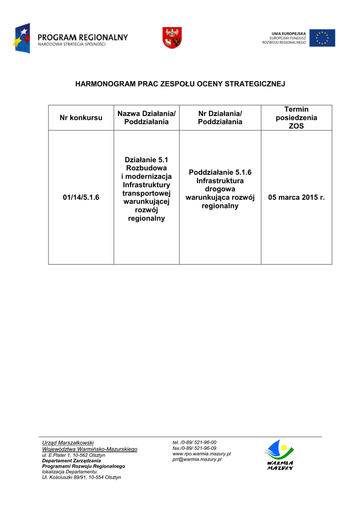 HARMONOGRAM PRAC ZESPOŁU OCENY STRATEGICZNEJ Nr konkursu 01/14/5.1.6 Nazwa Działania/ Poddziałania Nr Działania/ Poddziałania Działanie 5.1 Rozbudowa i modernizacja Infrastruktury transportowej warunkującej rozwój regionalny Poddziałanie 5.1.6 Infrastruktura drogowa warunkująca rozwój regionalny Urząd Marszałkowski Województwa Warmińsko-Mazurskiego ul. E.Plater 1, 10-562 Olsztyn Departament Zarządzania Programami Rozwoju Regionalnego lokalizacja Departamentu: Ul. Kościuszki 89/91, 10-554 Olsztyn tel. /0-89/ 521-96-00 fax./0-89/ 521-96-09 www.rpo.warmia.mazury.pl [email protected] Termin posiedzenia ZOS 05 marca 2015 r.