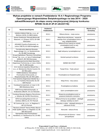 Wykaz projektów w ramach Poddziałania 10.4.1 Regionalnego Programu Operacyjnego Województwa Świętokrzyskiego na lata 2014 - 2020 zakwalifikowanych do etapu oceny merytorycznej (dotyczy konkursu RPSW.10.04.01-IP.01-26-037/16) Lp 1 2 3 4 5 6 7 8 9 10 Nazwa beneficjenta VISION CONSULTING Sp. z o.o., pl. Wolnica 13/10, 31-060 Kraków Asesor Ewaluacja i Rozwój Balcerzak Sławomir, ul. Grażyny 13/15, 02-548 Warszawa ADVANCE Ewelina Podziomek, os. Leśne 15B/78, 62-028 Koziegłowy Tarnobrzeska Agencja Rozwoju Regionalnego S.A., ul. Sandomierska 25, 39-400 Tarnobrzeg Grupa Kapitałowa "Business Consulting Group" Sp. z o.o., ul. Jana II Sobieskiego 102A/U7, 00-764 Warszawa Środkowopomorska Rada Naczelnej Organizacji Technicznej, ul. Jana z Kolna 38, 75-204 Koszalin O.K. Centrum Języków Obcych Sp. z o.o., ul. Bohaterów Monte Cassino 53, 20-706 Lublin TERRA Szkolenia i Doradztwo Przemysław Omieczyoski, ul. Wojciechowska 7M, 20-704 Lublin Puls Systemy Organizacji Szkoleo Sp. z o.o., ul. Franklina Roosevelta 18, 60829 Poznao Fundacja Europomost, ul. Łazy 3, 26085 Miedziana Góra Działanie/ Poddziałanie Tytuł projektu Wynik oceny formalnej 10.4.1 Własny biznes - moja szansa pozytywny 10.4.1 10.4.1 Moja firma mój biznes - wsparcie rozwoju firm i przedsiębiorczości w woj. świętokrzyskim Własna firma szansą na rozwój przedsiębiorczości w woj. świętokrzyskim pozytywny pozytywny 10.4.1 Bądź aktywny i przedsiębiorczy! pozytywny 10.4.1 Zamieo pomysł na biznes pozytywny 10.4.1 BIZNES NA START pozytywny 10.4.1 Twoja firma - Twój sukces! pozytywny 10.4.1 Przedsiębiorcze Świętokrzyskie pozytywny 10.4.1 Moja firma - mój sukces pozytywny 10.4.1 Przedsiębiorcza kobieta pozytywny 11 AMD Group Michał Drymajło, ul. Krakowska 18G/54. 35-111 Rzeszów 10.4.1 Zysk z przedsiębiorczości pozytywny 12 Fundacja Rozwoju Regionu Pierzchnica, u. Szkolna 28, 26-015 Pierzchnica 10.4.1 Wsparcie przedsiębiorczości w powiecie kieleckim ziemskim pozytywny 13 MTD Consulting Marcin Król, ul. Garbary 100/11, 61-757 Poznao 10.4.1 Własna firma to nie problem - zdobądź dotację i wiedzę na start! pozytywny 10.4.1 Zdecyduj o sobie - zdobądź dotację na założenie firmy! pozytywny 10.4.1 Kierunek - własna firma pozytywny 10.4.1 Od pomysłu do biznesu - nowa perspektywa pozytywny 14 15 16 DC Centrum Sp. z o.o., ul. Reglowa 3, 60-113 Poznao "Business School" Hanna Polak, Marcin Polak Spółka Jawna, ul. Bagatela 13, 00585 Warszawa Staropolska Izba Przemysłowo Handlowa, ul. Sienkiewicza 53, 25-002 Kielce Wojewódzki Urząd Pracy w Kielcach ul.Witosa 86, 25-561 Kielce, tel.: (048) 41-364-16-00, fax: (048) 41-364-16-66, e-mail: [email protected], www.wup.kielce.pl 10.4.1 Moja firma - moje możliwości - mój sukces pozytywny 10.4.1 Na swoim - nowa perspektywa zawodowa pozytywny 10.4.1 Puls biznesu świętokrzyskiego pozytywny 10.4.1 Twój biznes, Twój sukces, Twoja przyszłośd! pozytywny 10.4.1 Moja firma - mój sukces pozytywny 10.4.1 Biznes po mojemu pozytywny 10.4.1 Świętokrzyski sen - kreowanie aktywności gospodarczej osób bezrobotnych pozytywny 10.4.1 Kobieta sukcesu pozytywny 10.4.1 Własny biznes pozytywny 10.4.1 TAK! Dla samozatrudnienia! pozytywny 10.4.1 Dotacja na start! pozytywny 10.4.1 Klucz do sukcesu pozytywny 10.4.1 Nowy start pozytywny 10.4.1 Wsparcie na Starcie pozytywny 10.4.1 WYSTARTUJ w świętokrzyskim pozytywny 32 WYG Consulting Sp. z o.o., ul. Bitwy Warszawskiej 1920 r. 7, 02-366 Warszawa 10.4.1 SAM STWORZĘ SOBIE MIEJSCE PRACY projekt dotacyjny dla pozostających bez pracy mieszkaoców woj. świętokrzyskiego chcących rozpocząd działalnośd gospodarczą pozytywny 33 DGA S.A., ul. Towarowa 35, 61-896 Poznao 10.4.1 Nowa firma - nowe perspektywy pozytywny 17 18 19 20 21 22 23 24 25 26 27 28 29 30 31 Fundacja MULTIREGION, ul. Karola Lewakowskiego 6, 35-125 Rzeszów Stowarzyszenie "Centrum Wspierania Przedsiębiorczości", ul. Piłsudskiego 95, 50-016 Wrocław Fundacja na Rzecz Promocji Zdrowia "PULS", ul. Wesoła 19/3, 25-305 Kielce Wektor Consulting s.c. Mariusz Lipioski, Wiktor Cichoo, ul. Sienkiewicza 1, 39300 Mielec Ośrodek Promowania i Wspierania Przedsiębiorczości Rolnej, Pl. Józefa Poniatowskiego 2, 27-600 Sandomierz Michał Cichoo PRO STUDIO, ul. Władysława Łokietka 344, 31-334 Kraków Instytut Turystyki w Krakowie Sp. z o.o., ul. Łężce 23, 30-614 Kraków BROST Centrum Edukacji i Technologii Komputerowej Beata Ostrowska, Robert Ostrowski, ul. Kutnowska 11, 93-485 Łódź F.H.U. JAR-MAR Centrum Kształcenia "Wiedza dla Wszystkich" Rębiasz Jarosław, ul. Broniewskiego 16, 74-300 Myślibórz (miasto) Fundacja Inicjatyw "AKTYWNI", ul. Małopolska 8, 60-616 Poznao Wielkopolska Grupa Prawnicza Kozłowski, Maźwa, Sendrowski i Wspólnicy SP.K., ul. Małopolska 8, 60616 Poznao Fundacja Instytut Rozwoju Zasobów Ludzkich, ul. Nałęczowska 300/IIIp., 20701 Lublin Instytut Rozwoju i Innowacji EUROKONSULT Sp. z o.o., ul. Narutowicza 57/8, 20-016 Lublin SKILLS ACADEMY Sp. z o.o., ul. Jana III Sobieskiego 102A/U7, 00-764 Warszawa Krajowa Izba Gospodarcza, ul. Trębacka 4, 00-074 Warszawa Wojewódzki Urząd Pracy w Kielcach ul.Witosa 86, 25-561 Kielce, tel.: (048) 41-364-16-00, fax: (048) 41-364-16-66, e-mail: [email protected], www.wup.kielce.pl 34 35 Prywatne Przedsiębiorstwo Obsługi Regionów Zdzisław Kochanowicz, ul. Żeromskiego 88/2, 07-417 Ostrołęka Fundacja na Rzecz Integracji Zawodowej, Społecznej oraz Rozwoju Przedsiębiorczości VIA, ul. Generała Zygmunta Berlinga 10/26, 15-814 Białystok 10.4.1 Nowa Przedsiębiorczośd pozytywny 10.4.1 Własna firma - moja droga do inkluzji zawodowej pozytywny 36 European Financial Stability Fund Sp. z o.o., ul. Duoska 13, 54-427 Wrocław 10.4.1 PEWNYM KROKIEM do samodzielności pozytywny 37 Fundacja "RADOSNA IZBA", ul. Łazy 3, 26-085 Miedziana Góra 10.4.1 Nowe możliwości z własną firmą pozytywny 38 Grupa Doradcza Projekt Sp. z o.o., ul. Sokołowskiego 6, 31-436 Kraków 10.4.1 Startuj w przedsiębiorcz