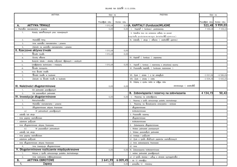 BILANS NA DZIEŃ 31.12.2008r. AKTYWA A. AKTYWA TRWAŁE I. Wartości niematerialne i prawne 1. Koszty zakończonych prac rozwojowych 2. Wartość firmy 3. Inne wartości niematerialne i prawne 4. Zaliczki na wartości niematerialne i prawne II. Rzeczowe aktywa trwałe 1. Środki trwałe a. Grunty własne b. Budynki lokale i obiekty inżynierii lądowych i wodnych c. Urządzenia techniczne i maszyny d. Środki transportu e. Inne środki trwałe 2. Środki trwałe w budowie 3. Zaliczki na środki trwałe w budowie III. Należności długoterminowe 1. Od jednostek powiązanych 2. Od pozostałych jednostek IV. Inwestycje długoterminowe 1. Nieruchomości 2. Wartości niematerialne i prawne 3. Długoterminowe aktywa finansowe a) W jednostkach powiązanych - udziały lub akcje - inne papiery wartościowe - udzelone pożyczki - inne długoterminowe aktywa finansowe b) W pozostałych jednostkach - udziały lub akcje - inne papiery wartościowe - udzelone pożyczki - inne długoterminowe aktywa finansowe 4. Inne Inwestycje długoterminowe V. Długoterminowe rozliczenie międzyokresowe 1. Aktywa z tytułu odroczonego podatku dochodowego 2. Inne rozliczenia międzyokresowe B. AKTYWA OBROTOWE I. Zapasy PASYWA Stan na Stan na Początek roku Koniec roku 1 015,64 0,00 A. KAPITAŁY (fundusze)WŁASNE 0,00 0,00 I. Kapitał ( fundusz) podstawowy II. Należne lecz nie wniesione wkłady na poczet k a p ita łu p o d s ta w o w e g o (w ie lk o ść u je m n a ) Początek roku Koniec roku 523,48 5 959,03 7 109,54 7 109,54 n III. Udziały ( akcje ) własne ( wielkość ujemna) 1 015,64 1 015,64 0,00 0,00 1 015,64 0,00 V. Kapitał ( fundusz ) rezerwowy z aktualizacji wyceny VI. Pozostałe kapitały ( fundusze rezerwowe ) IV. Kapitał ( fundusz ) zapasowy VII. Zysk ( strata ) z lat ubiegłych VIII. Zysk ( strata ) netto IX. Odpisy z zysku netto w ciągu roku 0,00 0,00 j obrotowego ( wielkość u je m n a ) B. Zobowiązania i rezerwy na zobwiazania 0,00 I. Rezerwy na zobwiązania 3 641,99 0,00 -6 586,06 5 435,55 4 134,15 50,42 0,00 1. Rezerwy z tytułu odroczonego podatku dochodowego 0,00 -3 031,96 -3 554,10 2. Rezerwy na świadczenia emerytalne i rentowe - długoterminowe - krótkoterminowe 3. Pozostałe rezerwy - długoterminowe - krótkoterminowe II. Zobwiazania długoterminowe 1. Wobec jednostek powiazanych 2. Wobec pozostałych jednostek a) kredyty i pożyczki b) Zysk z tytułu dłużnych papierów wartościowych c) Inne zobowiazania finansowe d) inne 0,00 III. Zobowiazania krótkoterminowe 1. wobec jednostek powiązanych a) Z tytułu dostaw i usług o okresie wymagalności : 6 009,45 - do 12 miesięcy 0,00 - powyżej 12 miesiecy 1. Materiały 2. Półprodukty i produkty w toku 3. Produkty gotowe 4. Towary 5. Zaliczki na poczet dostaw II. Należności krótkoterminowe 1. Należności od jednostek powiązanych a). Z tytułu dostaw i usług o okresie spłaty - do 12 miesięcy - powyżej 12 miesięcy b). Inne 2. Należności od pzostałych jednostek a). Z tytułu dostaw i usług o okresie spłaty - do 12 miesięcy - powyżej 12 miesięcy b). Z tytułu podatków, dotacji, ceł, ubezpieczeń i społecznych i zdrowotnych oraz innych świadczeń c). Inne d). Dochodzone na drodze sądowej III. Inwestycje krótkoterminowe 1. Krótkoterminowe aktywa trwałe a). W jednostkach powiązanych - udziały lub akcje - inne papiery wartościowe - udzelone pożyczki - inne długoterminowe aktywa finansowe b). W pozostałych jednostkach - udziały lub akcje - inne papiery wartościowe - udzelone pożyczki - inne długoterminowe aktywa finansowe c). Środki pieniężne i inne aktywa finansowe - środki pieniężne w kasie i na rachunkach bankowych - inne środki pieniężne - inne aktywa pieniężne (np. odsetki od lokat terminowych) 2. Inne inwestytcje krótkoterminowe IV. F KRÓTKOTERMINOWE ROZLICZENIA MIĘDZYOKRESOWE SUMA AKTYWÓW …………………… / miejscowość, data / 0,00 b) Inne 2. Wobec pozostałych jednostek a) kredyty i pożyczki b) Z tytułu emisji dłużnych papierów wartościowych c) Inne zobowiazania finansowe 0,00 d) Inne tytułu dostaw i usług o okresie wymagalności : - do 12 miesięcy - powyżej 12 miesiecy e) zaliczki otrzymane od dostawcy f) zobwiązania wekslowe g) z tytułu podatków, ceł, ubezpieczeń i nnych świadczeń h) z tytułu wynagrodzeń i) inne 3. fundusze specjalne IV. Rozliczenia międzyokresowe 3 641,99 3 641,99 0,00 643,71 3 477,69 0,00 0,00 12,75 50,42 4 657,63 6 009,45 6 009,45 1. Ujemne wartości firmy 6 009,45 2. Inne rozliczenia międzyokresowe 0,00 - długoterminowe - krótkoterminowe 0,00 0,00 3 641,99 3 629,24 12,75 6 009,45 5 959,03 50,42 4 657,63 6 009,45 ………………………………….. /data i podpis osoby , której powierzono prowadzenie ksiąg rachunkowych / SUMA PASYWÓW ……………………….. / data i podpis kierownika jednostki/