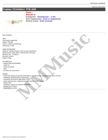 Informacje o produkcie Utworzono 08-03-2017 Trąbka TUYAMA® TTR-500 Cena : 850,00 zł Dostępność : Dostępność - 3 dni Stan magazynowy : brak w magazynie Średnia ocena : brak recenzji Opis produktu: us W KOMPLECIE: - twardy futerał EASTMAN® - ustnik 7C - oliwka do tłoków - smar - szmatka do czyszczenia M DANE TECHNICZNE: Materiał: mosiężny korpus, tłoki ze stali szlachetnej Wykończenie: złoty lakier z elementami red brass Menzura: ML - 11,65mm Roztrąb: 124mm Waga: 1070g ic INFO: Instrument: trąbka Bb Model: TTR-500 Poziom: szkolno-orkiestrowy Gwarancja: 2 lata M M WAŻNE: - instrument gotowy do grania (sprawdzony, wyregulowany, przygotowany przez serwis) - możliwość przetestowania instrumentu - możliwość otrzymania zdjęć REAL FOTO - serwis gwarancyjny i pogwarancyjny na terenie Polski i Europy - faktury VAT - możliwość zakupu w systemie RATALNYM - dostawa już w 24h!!! - GWARANCJA 2 LATA! Wygenerowano w programie www.oscGold.com