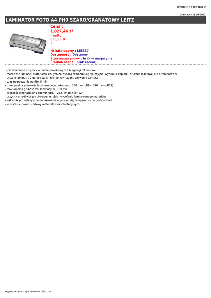 Informacje o produkcie Utworzono 08-03-2017 LAMINATOR FOTO A4 PH9 SZARO/GRANATOWY LEITZ Cena : 1.027,46 zł (netto: 835,33 zł ) Nr katalogowy : LE5337 Dostępność : Dostępny Stan magazynowy : brak w magazynie Średnia ocena : brak recenzji - przeznaczone do pracy w biurze projektowym lub agencji reklamowej - możliwość laminacji materiałów czułych na wysoką temperaturę np. zdjęcia, wydruki z kopiarki, drukarki laserowej lub atramentowej - system laminacji: 2 gorące wałki nie jest wymagane używanie carriera - czas nagrzewania poniżej 5 min - maksymalna szerokość laminowanego dokumentu 230 mm (pH9) i 320 mm (pH12) - maksymalna grubość folii laminacyjnej 150 mic. - prędkość laminacji 29,5 cm/min (pH9), 25,5 cm/min (pH12) - przycisk umożliwiający otworzenie rolek i wycofanie laminowanego materiału - wskaźnik pozwalający na dopasowanie odpowiedniej temperatury do grubości folii - w zestawie pakiet startowy materiałów eksploatacyjnych Wygenerowano w programie www.oscGold.com