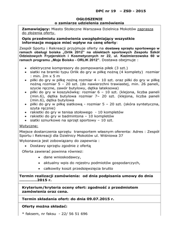 DPC nr 19 – ZSD - 2015 OGŁOSZENIE o zamiarze udzielenia zamówienia Zamawiający: Miasto Stołeczne Warszawa Dzielnica Mokotów zaprasza do złożenia oferty. Opis przedmiotu zamówienia uwzględniający wszystkie informacje mogące mieć wpływ na cenę oferty: Zespół Sportu i Rekreacji przyjmuje oferty na dostawę sprzętu sportowego w ramach obsługi boiska „Orlik 2012” na obiektach sportowych Zespołu Szkół Odzieżowych Fryzjerskich i Kosmetycznych nr 22, ul. Kazimierzowska 60 w ramach programu „Moje Boisko - ORLIK 2012”. Dostawa obejmuje : elektryczne kompresory do pompowania piłek (3 szt.) siatki na bramki typu Orlik do gry w piłkę nożną (4 komplety) rozmiar : min. 2m x 5 m piłki do gry w piłkę nożną rozmiar 4 – 10 szt. oraz piłki do gry w piłkę nożną rozmiar 5 – 20 szt. (do nawierzchni trawiastej, min. 26 paneli, szycie ręczne, zawór butylowy, dętka lateksowa) piłki do gry w koszykówkę: rozmiar 6 – 10 szt. (klejona, liczba paneli (min.6), dętka butylowa rozmiar 7– 20 szt. (klejona, liczba paneli (min.6), dętka butylowa piłki do gry w piłkę siatkową - rozmiar 5 – 20 szt. (skóra syntetyczna, szyta ręcznie) rakietki do gry w tenisa stołowego - 10 kompletów rakietki do gry w badmintona – 10 kompletów siatki sznurkowe na sprzęt sportowy – 10 szt. Wytyczne: Miejsce dostarczenia sprzętu transportem własnym oferenta: Adres : Zespół Sportu i Rekreacji dla Dzielnicy Mokotów ul. Wiśniowa 37 Wykonawca jest zobowiązany do zapewnia : Dostawy sprzętu zgodnie z ofertą Oferta zawierać powinna również: dane wnioskodawcy, aktualny wpis do rejestru podmiotów gospodarczych, całkowity koszt przedsięwzięcia brutto Termin realizacji zamówienia: od dnia podpisania umowy do dnia …………..2015 r. Kryterium/kryteria oceny ofert: zgodność z przedmiotem zamówienia oraz cena. Termin składania ofert: do dnia 09.07.2015 r. Oferty można składać: * faksem, nr faksu - 22/ 56 51 696 * drogą elektroniczną na adres - [email protected] * pisemnie na adres lub osobiście: Zespół Sportu i Rekreacji Dzielnica Mokotów m.st. Warszawy, ul. Wiśniowa 37, 02-545 Warszawa Pokój 206 Oferty złożone po terminie określonym w ogłoszeniu nie będą rozpatrywane przez Zamawiającego. Komórka organizacyjna Urzędu Dzielnicy Mokotów m.st. Warszawy realizująca wydatek: Zespół Sportu i Rekreacji. Osoba do kontaktu: Krzysztof Gampel tel: 22/ 56 51 689 Informacje dodatkowe: 1. Zamawiający będzie rozpatrywał oferty złożone zgodnie z ogłoszeniem. 2. Zamawiający udzieli zamówienia wykonawcy, którego oferta zostanie wybrana jako najkorzystniejsza. 3. Niezwłocznie po rozpatrzeniu ofert, w przypadku braku decyzji o unieważnieniu postępowania, informacja o wyborze wykonawcy zostanie zamieszczona na stronie internetowej Urzędu, na której zostało zamieszczone ogłoszenie. 4. Zamawiający zastrzega sobie prawo do zmiany ogłoszenia bez podania przyczyn. 5. Zamawiający zastrzega sobie prawo odwołania ogłoszenia w każdym czasie bez podawania przyczyn. 6. W sprawach nie ujętych w ogłoszeniu mają zastosowanie przepisy kodeksu cywilnego. Załączniki 1. wzór/projekt umowy* 2 ( inne o ile są wymagane)……………….. Kierownik Zespołu Sportu i Rekreacji dla Dzielnicy Mokotów 30.06.2015 /-/ Lech Kwasiborski data, podpis i pieczątka kierownika komórki organizacyjnej realizującej wydatek * wzór umowy winien być parafowany przez Radcę Prawnego, przedstawiciela WBK oraz Kierownika komórki