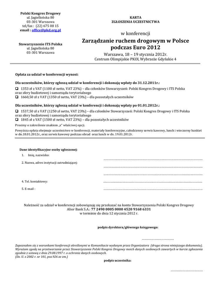 Polski Kongres Drogowy ul. Jagiellońska 80 03-301 Warszawa tel/fax : (22) 675 08 15 email : [email protected] Stowarzyszenie ITS Polska ul. Jagiellońska 80 03-301 Warszawa KARTA ZGŁOSZENIA UCZESTNICTWA w konferencji Zarządzanie ruchem drogowym w Polsce podczas Euro 2012 Warszawa, 18 – 19 stycznia 2012r. Centrum Olimpijskie PKOl, Wybrzeże Gdyńskie 4 Opłata za udział w konferencji wynosi: Dla uczestników, którzy zgłoszą udział w konferencji i dokonają wpłaty do 31.12.2011r.: 1353 zł z VAT (1100 zł netto, VAT 23%) – dla członków Stowarzyszeń: Polski Kongres Drogowy i ITS Polska oraz sfery budżetowej i samorządu terytorialnego 1660,50 zł z VAT (1350 zł netto, VAT 23%) – dla pozostałych uczestników Dla uczestników, którzy zgłoszą udział w konferencji i dokonają wpłaty po 01.01.2012r.: 1537,50 zł z VAT (1250 zł netto, VAT 23%) – dla członków Stowarzyszeń: Polski Kongres Drogowy i ITS Polska oraz sfery budżetowej i samorządu terytorialnego 1845 zł z VAT (1500 zł netto, VAT 23%) – dla pozostałych uczestników Prosimy o zakreślenie znakiem „x” właściwej opcji. Powyższa opłata obejmuje uczestnictwo w konferencji, materiały konferencyjne, całodzienny serwis kawowy, lunch i wieczorny bankiet w dn.18.01.2012r., oraz serwis kawowy podczas obrad oraz lunch w dn. 19.01.2012r. Dane identyfikacyjne osoby zgłoszonej: 1. Imię, nazwisko: …………………………………………………………………………………………………………… 2. Nazwa, adres instytucji zatrudniającej: …………………………………………………………………………………………………………… …………………………………………………………………………………………………………… 4. Tel. kontaktowy: …………………………………………………………………………………………………………… 5. E-mail : …………………………………………………………………………………………………………… Należność za udział w konferencji zobowiązuję się przekazać na konto Stowarzyszenia Polski Kongres Drogowy Alior Bank S.A.: 77 2490 0005 0000 4520 9168 6331 w terminie do dnia 12 stycznia 2012 r. podpis dyrektora/głównego księgowego: …………………………………. Zapoznałem się z warunkami konferencji określonymi w Komunikacie wydanym przez Organizatora (druga strona niniejszego dokumentu). Wyrażam zgodę na przetwarzanie przez Stowarzyszenie Polski Kongres Drogowy moich danych osobowych zawartych w karcie zgłoszenia zgodnie z ustawą z dnia 29.08.1997 r. o ochronie danych osobowych. (Dz. U. z 2002 r. nr 101, poz.926 ze zm.) podpis uczestnika: …………………………………. Komunikat organizacyjny Warunkiem uczestnictwa w konferencji jest przesłanie wypełnionej karty zgłoszenia (poprzednia strona) oraz dokonanie wpłaty środków finansowych - zgodnie z terminarzem oraz posiadanymi zniżkami. Obniżona opłata za udział w konferencji dotyczy członków fizycznych Stowarzyszeń: Polski Kongres Drogowy i ITS Polska oraz wszystkich pracowników firm i instytucji samorządowych będących członkami Stowarzyszeń (pod warunkiem braku zaległości z tytułu składek członkowskich), a także przedstawicieli instytucji sfery budżetowej i samorządu terytorialnego. W tytule przelewu prosimy koniecznie podać nazwisko(a) uczestnika(ów) konferencji lub nr faktury VAT. W przypadku rezygnacji z uczestnictwa w konferencji w terminie późniejszym niż 12.01.2012r., Organizatorzy obciążą Uczestnika kosztami udziału w pełnej wysokości. Szczegółowe informacje: www.pkd.org.pl www.itspolska.pl Przyjmowanie zgłoszeń i kontakt: Stowarzyszenie Polski Kongres Drogowy ul. Jagiellońska 80, 03-301 Warszawa tel/fax : 0 22 675 08 15; tel. kom. 605 200 214 e-mail : [email protected]