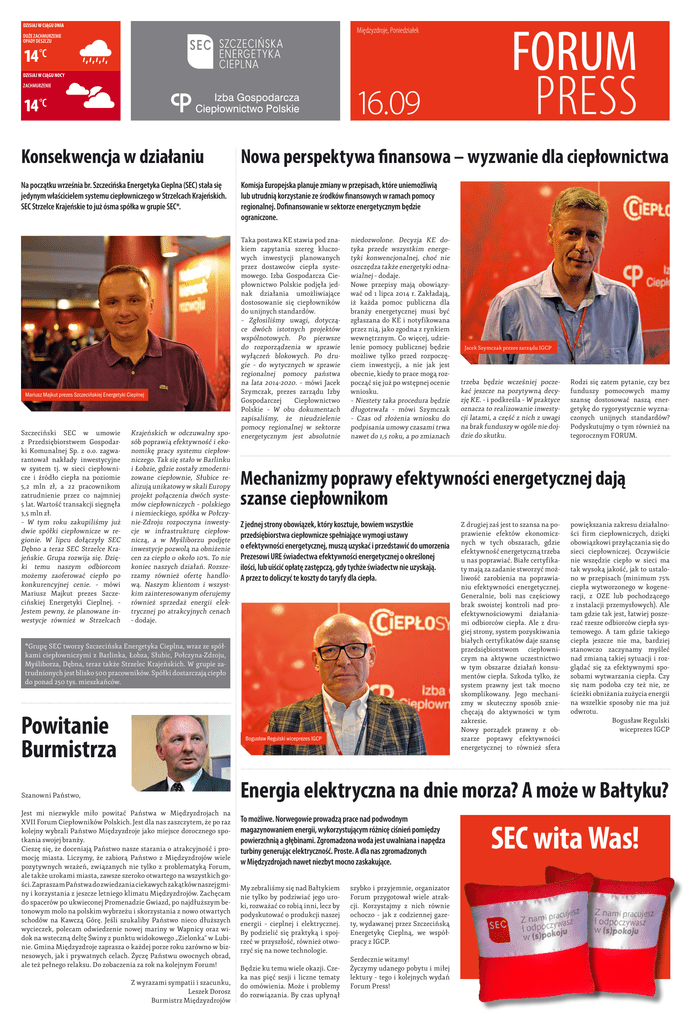 DZISIAJ W CIĄGU DNIA Międzyzdroje, Poniedziałek DUŻE ZACHMURZENIE OPADY DESZCZU 14°C DZISIAJ W CIĄGU NOCY ZACHMURZENIE 16.09 14°C FORUM PRESS Konsekwencja w działaniu Nowa perspektywa finansowa – wyzwanie dla ciepłownictwa Na początku września br. Szczecińska Energetyka Cieplna (SEC) stała się jedynym właścicielem systemu ciepłowniczego w Strzelcach Krajeńskich. SEC Strzelce Krajeńskie to już ósma spółka w grupie SEC*. Komisja Europejska planuje zmiany w przepisach, które uniemożliwią lub utrudnią korzystanie ze środków finansowych w ramach pomocy regionalnej. Dofinansowanie w sektorze energetycznym będzie ograniczone. Mariusz Majkut prezes Szczecińskiej Energetyki Cieplnej Szczeciński SEC w umowie z Przedsiębiorstwem Gospodarki Komunalnej Sp. z o.o. zagwarantował nakłady inwestycyjne w system tj. w sieci ciepłownicze i źródło ciepła na poziomie 5,2 mln zł, a 22 pracownikom zatrudnienie przez co najmniej 5 lat. Wartość transakcji sięgnęła 3,5 mln zł. – W tym roku zakupiliśmy już dwie spółki ciepłownicze w regionie. W lipcu dołączyły SEC Dębno a teraz SEC Strzelce Krajeńskie. Grupa rozwija się. Dzięki temu naszym odbiorcom możemy zaoferować ciepło po konkurencyjnej cenie. – mówi Mariusz Majkut prezes Szczecińskiej Energetyki Cieplnej. – Jestem pewny, że planowane inwestycje również w Strzelcach Krajeńskich w odczuwalny sposób poprawią efektywność i ekonomikę pracy systemu ciepłowniczego. Tak się stało w Barlinku i Łobzie, gdzie zostały zmodernizowane ciepłownie, Słubice realizują unikatowy w skali Europy projekt połączenia dwóch systemów ciepłowniczych – polskiego i niemieckiego, spółka w Połczynie-Zdroju rozpoczyna inwestycje w infrastrukturę ciepłowniczą, a w Myśliborzu podjęte inwestycje pozwolą na obniżenie cen za ciepło o około 10%. To nie koniec naszych działań. Rozszerzamy również ofertę handlową. Naszym klientom i wszystkim zainteresowanym oferujemy również sprzedaż energii elektrycznej po atrakcyjnych cenach – dodaje. Taka postawa KE stawia pod znakiem zapytania szereg kluczowych inwestycji planowanych przez dostawców ciepła systemowego. Izba Gospodarcza Ciepłownictwo Polskie podjęła jednak działania umożliwiające dostosowanie się ciepłowników do unijnych standardów. – Zgłosiliśmy uwagi, dotyczące dwóch istotnych projektów wspólnotowych. Po pierwsze do rozporządzenia w sprawie wyłączeń blokowych. Po drugie – do wytycznych w sprawie regionalnej pomocy państwa na lata 2014-2020. – mówi Jacek Szymczak, prezes zarządu Izby Gospodarczej Ciepłownictwo Polskie – W obu dokumentach zapisaliśmy, że nieudzielenie pomocy regionalnej w sektorze energetycznym jest absolutnie niedozwolone. Decyzja KE dotyka przede wszystkim energetyki konwencjonalnej, choć nie oszczędza także energetyki odnawialnej – dodaje. Nowe przepisy mają obowiązywać od 1 lipca 2014 r. Zakładają, iż każda pomoc publiczna dla branży energetycznej musi być zgłaszana do KE i notyfikowana przez nią, jako zgodna z rynkiem wewnętrznym. Co więcej, udzielenie pomocy publicznej będzie możliwe tylko przed rozpoczęciem inwestycji, a nie jak jest obecnie, kiedy to prace mogą rozpocząć się już po wstępnej ocenie wniosku. – Niestety taka procedura będzie długotrwała – mówi Szymczak – Czas od złożenia wniosku do podpisania umowy czasami trwa nawet do 1,5 roku, a po zmianach Szanowni Państwo, Jest mi niezwykle miło powitać Państwa w Międzyzdrojach na XVII Forum Ciepłowników Polskich. Jest dla nas zaszczytem, że po raz kolejny wybrali Państwo Międzyzdroje jako miejsce dorocznego spotkania swojej branży. Cieszę się, że doceniają Państwo nasze starania o atrakcyjność i promocję miasta. Liczymy, że zabiorą Państwo z Międzyzdrojów wiele pozytywnych wrażeń, związanych nie tylko z problematyką Forum, ale także urokami miasta, zawsze szeroko otwartego na wszystkich gości. Zapraszam Państwa do zwiedzania ciekawych zakątków naszej gminy i korzystania z jeszcze letniego klimatu Międzyzdrojów. Zachęcam do spacerów po ukwieconej Promenadzie Gwiazd, po najdłuższym betonowym molo na polskim wybrzeżu i skorzystania z nowo otwartych schodów na Kawczą Górę. Jeśli szukaliby Państwo nieco dłuższych wycieczek, polecam odwiedzenie nowej mariny w Wapnicy oraz widok na wsteczną deltę Świny z punktu widokowego „Zielonka” w Lubinie. Gmina Międzyzdroje zaprasza o każdej porze roku zarówno w biznesowych, jak i prywatnych celach. Życzę Państwu owocnych obrad, ale też pełnego relaksu. Do zobaczenia za rok na kolejnym Forum! Z wyrazami sympatii i szacunku, Leszek Dorosz Burmistrz Międzyzdrojów trzeba będzie wcześniej poczekać jeszcze na pozytywną decyzję KE. – i podkreśla – W praktyce oznacza to realizowanie inwestycji latami, a część z nich z uwagi na brak funduszy w ogóle nie dojdzie do skutku. Rodzi się zatem pytanie, czy bez funduszy pomocowych mamy szansę dostosować naszą energetykę do rygorystycznie wyznaczonych unijnych standardów? Podyskutujmy o tym również na tegorocznym FORUM. Mechanizmy poprawy efektywności energetycznej dają szanse ciepłownikom Z jednej strony obowiązek, który kosztuje, bowiem wszystkie przedsiębiorstwa ciepłownicze spełniające wymogi ustawy o efektywności energetycznej, muszą uzyskać i przedstawić do umorzenia Prezesowi URE świadectwa efektywności energetycznej o określonej ilości, lub uiścić opłatę zastępczą, gdy tychże świadectw nie uzyskają. A przez to doliczyć te koszty do taryfy dla ciepła. *Grupę SEC tworzy Szczecińska Energetyka Cieplna, wraz ze spółkami ciepłowniczymi z Barlinka, Łobza, Słubic, Połczyna-Zdroju, Myśliborza, Dębna, teraz także Strzelec Krajeńskich. W grupie zatrudnionych jest blisko 500 pracowników. Spółki dostarczają ciepło do ponad 250 tys. mieszkańców. Powitanie Burmistrza Jacek Szymczak prez
