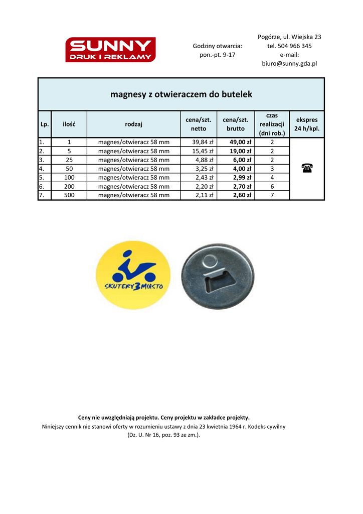 Godziny otwarcia: pon.-pt. 9-17 Pogórze, ul. Wiejska 23 tel. 504 966 345 e-mail: [email protected] magnesy z otwieraczem do butelek Lp. ilość rodzaj 1. 2. 3. 4. 5. 6. 7. 1 5 25 50 100 200 500 magnes/otwieracz 58 mm magnes/otwieracz 58 mm magnes/otwieracz 58 mm magnes/otwieracz 58 mm magnes/otwieracz 58 mm magnes/otwieracz 58 mm magnes/otwieracz 58 mm cena/szt. netto 39,84 zł 15,45 zł 4,88 zł 3,25 zł 2,43 zł 2,20 zł 2,11 zł cena/szt. brutto 49,00 zł 19,00 zł 6,00 zł 4,00 zł 2,99 zł 2,70 zł 2,60 zł czas realizacji (dni rob.) 2 2 2 3 4 6 7 Ceny nie uwzględniają projektu. Ceny projektu w zakładce projekty. Niniejszy cennik nie stanowi oferty w rozumieniu ustawy z dnia 23 kwietnia 1964 r. Kodeks cywilny (Dz. U. Nr 16, poz. 93 ze zm.). ekspres 24 h/kpl.