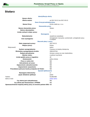 Powiatowy Urząd Pracy w Opolu http://pup.opole.pl/oferta/115358/stolarz Stolarz Identyfikacja oferty Numer oferty: Oferta ważna: od 2017-02-21 do 2017-03-21 Dane firmy/przedsiębiorstwa Nazwa firmy: Emilia meble sp. z o.o. Stanowisko pracy Nazwa stanowiska pracy: Stolarz Zakres obowiązków: Liczba wolnych miejsc pracy: 5 Wymagania Wykształcenie: zasadnicze zawodowe Umiejętności manualne; sumienność; umiejętność pracy w zespole Inne wymagania: Warunki płacy i pracy Data rozpoczęcia pracy: 2017-02-21 Miejsce pracy: Polska Miejscowość: Łękno System wynagrodzenia: Czasowy ze stawką miesięczną Minimalne wynagrodzenie brutto: Rodzaj zatrudnienia: 2000.00 PLN Umowa o pracę na czas nieokreślony Wymiar etatu: w pełnym wymiarze Liczba godzin pracy w tygodniu: Zmianowość: 40 jedna zmiana Praca w wolne dni: NIE Zatrudnienie od zaraz: NIE Zapewnienie zakwaterowania: NIE Zapewnienie wyżywienia: NIE Pracodawca pokrywa koszty przejazdu do Polski: NIE Sposób Aplikowania Wymagane dokumenty: Język składania aplikacji: Telefon: cv polski 612852460 Adres e-mail: pokaż adres Czy oferta jest subsydiowana: NIE Czy oferta jest finansowana z PFRON: NIE Upowszechnienie krajowej oferty pracy na terenie państw EOG: NIE