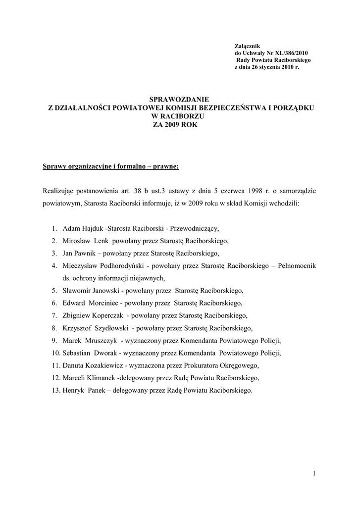 Załącznik do Uchwały Nr XL/386/2010 Rady Powiatu Raciborskiego z dnia 26 stycznia 2010 r. SPRAWOZDANIE Z DZIAŁALNOŚCI POWIATOWEJ KOMISJI BEZPIECZEŃSTWA I PORZĄDKU W RACIBORZU ZA 2009 ROK Sprawy organizacyjne i formalno – prawne: Realizując postanowienia art. 38 b ust.3 ustawy z dnia 5 czerwca 1998 r. o samorządzie powiatowym, Starosta Raciborski informuje, iż w 2009 roku w skład Komisji wchodzili: 1. Adam Hajduk -Starosta Raciborski - Przewodniczący, 2. Mirosław Lenk powołany przez Starostę Raciborskiego, 3. Jan Pawnik – powołany przez Starostę Raciborskiego, 4. Mieczysław Podhorodyński - powołany przez Starostę Raciborskiego – Pełnomocnik ds. ochrony informacji niejawnych, 5. Sławomir Janowski - powołany przez Starostę Raciborskiego, 6. Edward Morciniec - powołany przez Starostę Raciborskiego, 7. Zbigniew Koperczak - powołany przez Starostę Raciborskiego, 8. Krzysztof Szydłowski - powołany przez Starostę Raciborskiego, 9. Marek Mruszczyk - wyznaczony przez Komendanta Powiatowego Policji, 10. Sebastian Dworak - wyznaczony przez Komendanta Powiatowego Policji, 11. Danuta Kozakiewicz - wyznaczona przez Prokuratora Okręgowego, 12. Marceli Klimanek -delegowany przez Radę Powiatu Raciborskiego, 13. Henryk Panek – delegowany przez Radę Powiatu Raciborskiego. 1 Działalność merytoryczna Komisji W okresie sprawozdawczym Komisja odbyła dwa posiedzenia: I posiedzenie odbyło się w dniu 19 czerwca 2009 r. II posiedzenie odbyło się w dniu 19 listopada 2009 r. Na pierwszym posiedzeniu, które odbyło się w dniu 19 czerwca br. Komisja omawiała stan realizacji Powiatowego programu zapobiegania przestępczości oraz ochrony bezpieczeństwa obywateli i porządku publicznego przyjętego Uchwałą Rady Powiatu Nr XXV/249/08 z dnia 25 listopada 2008 r. Omawiano prowadzenie spotkań z uczniami szkół ponadgimnazjalnych na temat wykroczeń i przestępstw popełnianych przez nieletnich. Spotkania prowadzone były przez przedstawicieli Prokuratury Rejonowej oraz Komendy Powiatowej Policji w Raciborzu. Po przedstawieniu spostrzeżeń dyrektorów szkół oraz samych prowadzących prelekcje stwierdzono konieczność prowadzenia dalszych spotkań w szkołach. Jednostką wiodącą w prowadzeniu spotkań była prokuratura rejonowa w Raciborzu. Efektem posiedzenia Komisji był wniosek aby prokuratura Rejonowa w Raciborzu opracowała materiał stanowiący syntezę podstawowych przepisów prawa w zakresie najczęściej popełnianych przestępstw i wykroczeń przez młodzież szkolną z uwzględnieniem sankcji prawno-karnych. Zadanie powyższe Komisja zleciła Prokuraturze Rejonowej w Raciborzu. Opracowanie zostało by następnie rozesłane Dyrektorom szkół. Na posiedzeniu omawiano również materiał otrzymany z Ministerstwa Spraw Wewnętrznych i Administracji zat. Funkcjonowanie Komisji Bezpieczeństwa i Porządku. Opracowanie przedstawiało faktyczne funkcjonowanie Komisji Powiatowych w Polsce. Na tle powyższego opracowania przedstawiono funkcjonowanie Powiatowej Komisji Bezpieczeństwa i Porządku w Raciborzu. II posiedzenie Komisji odbyło się 19 listopada 2009 r. Starosta Raciborski - Przewodniczący Komisji na wniosek Komendanta Powiatowego Policji w Raciborzu wniósł do porządku obrad punkt dotyczący zasad bezpieczeństwa w ruchu drogowym w powiecie raciborskim z uwzględnieniem problematyki pomiaru prędkości oraz egzekwowania od kierowców przestrzegania przepisów ruchu drogowego. Na posiedzeniu obecny Naczelnik Wydziału Ruchu Drogowego Komendy Powiatowej Policji w Raciborzu P. Sebastian Dworak przedstawił problematykę w oparciu o działania prewencyjne, statystyki oraz bieżącą działalność tut. Komendy. Na posiedzeniu przedstawiono nowoczesne metody pomiaru prędkości na drogach przy pomocy laserowych mierników prędkości. Z uwagi na ostatnie zainteresowanie Rady Powiatu Raciborskiego tematyką pomiaru prędkości na drogach 2 powiatu raciborskiego Starosta poprosił o przybliżenie tematu Radnym Powiatowym, co miało miejsce 24 listopada 2009 r. Ponadto Komisja pozytywnie wypowiedziała się o możliwości zakupu nowoczesnego mobilnego miernika prędkości, który byłby wykorzystywany na drogach powiatu raciborskiego jako skutecznie działającego mechanizmu pod względem prewencji ogólnej jak i szczególnej. Na posiedzeniu Prokurator Rejonowy P. Danuta Kozakiewicz przedstawiła opracowany materiał w zakresie podstawowych przepisów prawnych z zakresu ustawy Kodeks Karny oraz ustawy o postępowaniu w sprawach nieletnich. Materiał jest dopełnieniem prowadzonych spotkań z uczniami szkół ponadgimnazjalnych na temat zachowań przestępnych, patologicznych, aspołecznych. Materiał zostanie rozpropagowany wśród dyrektorów szkół na obszarze powiatu. Podsumowanie: W okresie obejmującym sprawozdanie Komisja złożyła następujące wnioski, które zostały zrealizowane bądź są w trakcie realizacji przez Powiatowe Centrum Zarządzania Kryzysowego w Raciborzu: 1) Ponownie skierować do Śląskiego Urzędu Wojewódzkiego opracowany Projekt zapobiegania przestępczości zat. „siła mocy przeciwko przemocy” oraz opracować kolejny zat. „bezpieczniej do celu, zwolnij przyjacielu” w ramach ogólnopolskiego programu „Razem Bezpieczniej” na 2010 rok, niezależnie od obowiązku posiadania własnego programu wynikającego z art. 12 ustawy o samorządzie powiatowym, 2) Rozpropagować wśród dyrektorów szkół opracowany przez Prokuraturę Rejonową w Raciborzu materiał na temat zbioru przepisów prawnych oraz grożących sankcji za zachowania przestępne nieletnich. 3) Z uwagi na pozytywne efekty oraz zainteresowanie ze strony uczniów i nauczycieli, kontynuować spotkania z przedstawicielami policji oraz prokuratury na tematy związane z profilaktyką oraz zapobieganiem zachowaniom przestępnym wśród młodzieży. Kierownik Powiatowego Centrum Zarządzania Kryzysowego w Raciborzu Krzysztof Szydłowski Przewodniczący Rady No