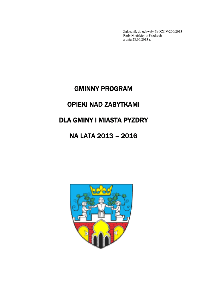 Załącznik do uchwały Nr XXIV/200/2013 Rady Miejskiej w Pyzdrach z dnia 28.06.2013 r. GMINNY PROGRAM OPIEKI NAD ZABYTKAMI DLA GMINY I MIASTA MIASTA PYZDRY NA LATA 2013 – 2016 Pyzdry 2013 Spis treści: 1.Wstęp___________________________________________________________________4 2.Podstawa prawna opracowania gminnego programu opieki nad zabytkami.____________ 5 3.Uwarunkowania prawne ochrony i opieki nad zabytkami w Polsce___________________5 4.Uwarunkowania zewnętrzne ochrony zasobów dziedzictwa kulturowego______________7 4.1.Strategiczne cele polityki państwa gminnego zakresie ochrony zabytków gminnego opieki nad zabytkami___________________________________________________________7 4.1.1 Narodowa Strategia Rozwoju Kultury na lata 2004-2013________________________7 4.1.2 Uzupełnienie Narodowej Strategii Rozwoju Kultury na lata 2004-2020_____________8 4.1.3 Tezy krajowego programu ochrony zabytków_________________________________9 4.2. Relacje gminnego programu opieki nad zabytkami z dokumentami wykonanymi na poziomie województwa i powiatu________________________________________10 4.2.1.Strategią rozwoju województwa wielkopolskiego_____________________________10 4.2.2 Planem zagospodarowania przestrzennego województwa wielkopolskiego._________10 4.2.3.Wielkopolskim Regionalnym Programem Operacyjnym na lata 2007-2013_________14 4.2.4.Program Rozwoju Kultury w Wielkopolsce na lata 2012-2020___________________14 4.2.5 Wielkopolskim Wojewódzkim programem Opieki nad Zabytkami na lata 2008-2011_15 4.2.6.Planem rozwoju lokalnego powiatu wrzesińskiego na lata 2007-2013_____________16 5.Uwarunkowania wewnętrzne ochrony dziedzictwa kulturowego____________________17 5.1.Relacje gminnego programu opieki nad zabytkami z dokumentami wykonanymi na poziomie gminy_________________________________________________________17 5.1.1 Uwarunkowania wynikające ze studium uwarunkowań i kierunków zagospodarowania przestrzennego gminy Pyzdry______________________________________________17 5.1.2 Uwarunkowania wynikające z Planu Rozwoju Lokalnego Gminy i Miasta Pyzdry na lata 2008-2013________________________________________________________20 5.1.3 Uwarunkowania wynikające z Planu Odnowy Miejscowości Pyzdry na lata 20102017__________________________________________________________________20 5.1.4 Uwarunkowania wynikające z miejscowych planów zagospodarowania przestrzennego gminy_________________________________________________________________ 21 5.1.5 Uwarunkowania wynikające z ochrony przyrody i równowagi ekologicznej________25 5.1.6 Uwarunkowania wewnętrzne ochrony zabytków archeologicznych._______________27 5.2. Charakterystyka zasobów i analiza stanu dziedzictwa i krajobrazu kulturowego gminy_28 2 5.2.1.Zarys historii obszaru gminy______________________________________________28 5.2.2 Zabytki nieruchome. Charakterystyka zasobów kulturowych Gminy Pyzdry________30 5.2.3 Zabytki ruchome_______________________________________________________36 5.2.4.Zabytki archeologiczne__________________________________________________36 5.2.5 Zabytki wskazane przez WWKZ do ujęcia w gminnej ewidencji zabytków __ ______39 5.2.6 Muzeum Ziemi Pyzdrskiej w Pyzdrach ____________________________________52 5.2.7 Największe zagrożenia zabytków nieruchomych _____________________________53 5.2.8 Istotne zagrożenia zabytków archeologicznych_______________________________ 55 6. Cele gminnego programu opieki nad zabytkami_________________________________58 7. Kierunki działań programu opieki nad zabytkami________________________________59 7.1. Cele gminnego programu opieki nad zabytkami _______________________________59 7.1.1 Sporządzenie gminnej ewidencji zabytków nieruchomych. ________________ _____59 7.1.2 Weryfikacja i aktualizacja gminnej ewidencji zabytków nieruchomych ____________59 7.1.3 Sporządzenie gminnej ewidencji zabytków archeologicznych. ___________________59 7.1.4 Udostępnienie i promocja zabytków nieruchomych____________________________60 7.1.5 Edukacja w zakresie ochrony dziedzictwa kulturowego ________________________60 7.1.6 Zahamowanie procesu degradacji zabytków i doprowadzenie do poprawy stanu ich zachowania ________________________________________________________61 7.1.7 Włączenie zabytków w procesy gospodarcze_________________________________62 7.2 Określenie sposobu realizacji poszczególnych celów gminnego programu___________63 8. Instrumentarium realizacji gminnego programu opieki nad zabytkami ______________ 64 9. Monitoring działania gminnego programu opieki nad zabytkami ___________________65 10. Zewnętrzne źródła finansowania programu opieki nad zabytkami_________________ 63 3 1. WSTĘP Postanowienia ogólne Ilekroć w niniejszym programie mowa o : a) ustawie – rozumie się przez to ustawę z dnia 23 lipca 2003 r. o ochronie zabytków i opiece nad zabytkami (Dz. U. Nr 162, poz. 1568 z późn. zmianami), b) Gminie – rozumie się przez to Gminę i Miasto Pyzdry, c) Programie - rozumie się przez to Gminny Program Opieki nad Zabytkami dla Gminy i Miasta Pyzdry na lata 2013-2016, d) Konserwatorze – rozumie się przez to Wielkopolskiego Wojewódzkiego Konserwatora Zabytków, e) Planie – rozumie się przez to zmianę Planu Zagospodarowania Przestrzennego Województwa Wielkopolskiego z dnia 26 kwietnia 2010 r. f) Strategii – rozumie się przez to Strategię Rozwoju Województwa Wielkopolskiego do roku 2020 z dnia 19 grudnia 2005 r. g) Programie Operacyjnym – rozumie się przez to Wielkopolski Regionalny Program Operacyjny na lata 2007-2013, h) Narodowej Strategii – rozumie się przez to Narodową Strategię Rozwoju Kultury na lata 2004-2013. CEL OPRACOWANIA GMINNEGO PROGRAMU OPIEKI NAD ZABYTKAMI. Celem „Gminnego Programu Opieki nad Zabytkami Gminy i Miasta Pyzdry” jest: - wzmocnienie ochrony i opieki nad materialną części dziedzictwa kulturowego oraz poprawa stanu zabytków poprzez zahamowanie procesów ich degradacji, a w dalszej kolejności p
