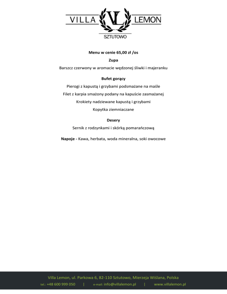 Menu w cenie 65,00 zł /os Zupa Barszcz czerwony w aromacie wędzonej śliwki i majeranku Bufet gorący Pierogi z kapustą i grzybami podsmażane na maśle Filet z karpia smażony podany na kapuście zasmażanej Krokiety nadziewane kapustą i grzybami Kopytka ziemniaczane Desery Sernik z rodzynkami i skórką pomarańczową Napoje - Kawa, herbata, woda mineralna, soki owocowe Villa Lemon, ul. Parkowa 6, 82-110 Sztutowo, Mierzeja Wiślana, Polska tel.: +48 600 999 050 | e-mail: [email protected] | www.villalemon.pl Menu w cenie 85,00 zł /os Przekąski Rolada z karpia z bakaliami Dorsz w pikantnym sosie po grecku Tradycyjna sałatka jarzynowa w sosie majonezowym Pieczywo, masło Zupa Barszcz czerwony w aromacie wędzonej śliwki i majeranku podany z uszkami Bufet gorący Pierogi z kapustą i grzybami podsmażane na maśle Filet z karpia smażony podany na kapuście zasmażanej Krokiety nadziewane kapustą i grzybami Kopytka ziemniaczane Desery Mus piernikowy z kruszonką orzechową Sernik z rodzynkami i skórką pomarańczową Napoje - Kawa, herbata, woda mineralna, soki owocowe, kompot z suszu Villa Lemon, ul. Parkowa 6, 82-110 Sztutowo, Mierzeja Wiślana, Polska tel.: +48 600 999 050 | e-mail: [email protected] | www.villalemon.pl Menu w cenie 110,00 zł/os Przystawki zimne Śledzie w śmietanie z jabłkiem i cebulką Filety śledziowe z piklami Dorsz z warzywami po grecku Sałatka jarzynowa z majonezem Pieczywo, masło Zupa Barszcz czerwony na naturalnym zakwasie, z czosnkiem i suszonymi owocami Bufet gorący Krokiety faszerowane kapustką i grzybami Pierogi z kapustą i grzybami okraszone cebulą i śmietaną Karp smażony na maśle Ziemniaki smażone z cebulką Gołąbki z suszonymi grzybami Kapusta z prawdziwkami Dodatki Zestaw tradycyjnych polskich marynat Zimne sosy: chrzanowy i tatarski Desery Mus piernikowy Wybór ciast wigilijnych Napoje - Kawa, herbata, woda mineralna, soki owocowe, kompot z suszu Villa Lemon, ul. Parkowa 6, 82-110 Sztutowo, Mierzeja Wiślana, Polska tel.: +48 600 999 050 | e-mail: [email protected] | www.villalemon.pl