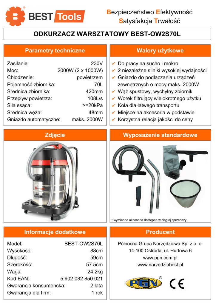 Bezpieczeństwo Efektywność Satysfakcja Trwałość ODKURZACZ WARSZTATOWY BEST-OW2S70L Parametry techniczne Zasilanie: 230V Moc: 2000W (2 x 1000W) Chłodzenie: powietrzem Pojemność zbiornika: 70L Średnica zbiornika: 420mm Przepływ powietrza: 108L/s Siła ssąca: >=20kPa Średnica węża: 48mm Gniazdo automatyczne: maks. 2000W Zdjęcie Walory użytkowe ü Do pracy na sucho i mokro ü 2 niezależne silniki wysokiej wydajności ü Gniazdo do podłączania urządzeń ü ü ü ü ü zewnętrznych o mocy maks. 2000W Wąż spustowy, wychylny zbiornik Worek filtrujący wielokrotnego użytku Koła dla łatwego transportu Miejsce na akcesoria w podstawie Korzystna relacja jakości do ceny Wyposażenie standardowe * wymienne akcesoria dostępne w ciągłej sprzedaży Informacje dodatkowe Producent Model: BEST-OW2S70L Wysokość: 88cm Długość: 59cm Szerokość: 57.5cm Waga: 24.2kg Kod EAN: 5 902 082 850 021 Gwarancja konsumencka: 2 lata Gwarancja dla firm: 1 rok Północna Grupa Narzędziowa Sp. z o. o. 14-100 Ostróda, ul. Hurtowa 6 www.pgn.com.pl www.narzedziabest.pl
