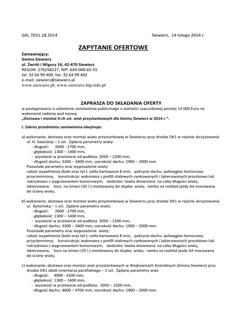 GKL.7031.18.2014 Siewierz, 14 lutego 2014 r. ZAPYTANIE OFERTOWE Zamawiający: Gmina Siewierz ul. Żwirki i Wigury 16, 42-470 Siewierz REGON: 276258227, NIP: 649-000-65-55 tel. 32 64 99 400, fax. 32 64 99 402 e-mail: [email protected] www.siewierz.pl; www.siewierz.bip.info.pl ZAPRASZA DO SKŁADANIA OFERTY w postępowaniu o udzielenie zamówienia publicznego o wartości szacunkowej poniżej 14 000 Euro na wykonanie zadania pod nazwą: „Dostawa i montaż 4-ch szt. wiat przystankowych dla Gminy Siewierz w 2014 r.”. I. Zakres przedmiotu zamówienia obejmuje: a) wykonanie, dostawa oraz montaż wiaty przystankowej w Siewierzu przy drodze DK1 w rejonie skrzyżowania ul. H. Sawickiej – 1 szt. Żądane parametry wiaty: - długość: 2600 - 2700 mm, - głębokość: 1300 – 1400 mm, - wysokość w prześwicie od podłoża: 2050 – 2200 mm, - długość dachu: 3300 – 3400 mm, szerokość dachu: 1900 – 2000 mm. Pozostałe parametry oraz wyposażenie wiaty: całość wypełnienia (boki oraz tył ): szkło hartowane 8 mm; pokrycie dachu: poliwęglan komorowy przyciemniony; konstrukcja: wykonana z profili stalowych cynkowanych i lakierowanych proszkowo lub natryskowo z wygrzewaniem komorowym; siedzisko: ławka drewniana na całej długości wiaty, lakierowana; kosz na śmieci (35 l.) montowany do słupka wiaty, ramka na rozkład jazdy A4 mocowana do ściany wiaty, b) wykonanie, dostawa oraz montaż wiaty przystankowej w Siewierzu przy drodze DK1 w rejonie skrzyżowania ul. Bytomską – 1 szt. Żądane parametry wiaty: - długość: 2600 - 2700 mm, - głębokość: 1300 – 1400 mm, - wysokość w prześwicie od podłoża: 2050 – 2200 mm, - długość dachu: 3300 – 3400 mm, szerokość dachu: 1900 – 2000 mm. Pozostałe parametry oraz wyposażenie wiaty: całość wypełnienia (boki oraz tył ): szkło hartowane 8 mm; pokrycie dachu: poliwęglan komorowy przyciemniony; konstrukcja: wykonana z profili stalowych cynkowanych i lakierowanych proszkowo lub natryskowo z wygrzewaniem komorowym; siedzisko: ławka drewniana na całej długości wiaty, lakierowana; kosz na śmieci (35 l.) montowany do słupka wiaty; ramka na rozkład jazdy A4 mocowana do ściany wiaty, c) wykonanie, dostawa oraz montaż wiat przystankowych w Wojkowicach Kościelnych (Gmina Siewierz) przy drodze DK1 obok cmentarza parafialnego – 2 szt. Żądane parametry wiat: - długość: 4000 - 4200 mm, - głębokość: 1300 – 1400 mm, - wysokość w prześwicie od podłoża: 2050 – 2200 mm, - długość dachu: 4600 – 4700 mm, szerokość dachu: 1900 – 2000 mm. Pozostałe parametry oraz wyposażenie wiat: całość wypełnienia (boki oraz tył ): szkło hartowane 8 mm; pokrycie dachu: poliwęglan komorowy przyciemniony; konstrukcja: wykonana z profili stalowych cynkowanych i lakierowanych proszkowo lub natryskowo z wygrzewaniem komorowym; siedzisko: ławka drewniana na całej długości wiaty, lakierowana; kosz na śmieci (35 l.) montowany do słupka wiaty; ramka na rozkład jazdy A4 mocowana do ściany wiaty. II. Termin realizacji zamówienia: do dnia 31 maja 2014 roku. III. Miejsce i czas oraz forma składania oferty: ofertę należy składać w formie pisemnej przesyłki pocztowej przesłanej na adres Zamawiającego lub osobiście w sekretariacie Urzędu Miasta i Gminy Siewierz - pokój nr 11 (z dopiskiem na kopercie: „Oferta GKL – dostawa wiat”) w terminie do dnia 04 marca 2014 r. do godz. 14.00. W przypadku przesyłek pocztowych decyduje data i godzina wpływu do Urzędu Miasta i Gminy Siewierz. IV. Zawartość oferty: oferta powinna być złożona w postaci wypełnionego Formularza ofertowego, który stanowi załącznik nr 1 do niniejszego zapytania ofertowego. Na formularzu ofertowym należy wpisać cenę brutto za wykonanie pełnego zakresu usług , zgodnie z zakresem przedmiotu zamówienia opisanym w pkt I powyżej. V. Informacje dodatkowe: płatność będzie dokonana przelewem, jednorazowo, po wykonaniu usługi i po podpisaniu przez Zamawiającego protokołu odbioru, na podstawie wystawionej faktury VAT. Termin płatności: 30 dni od daty wpływu faktury do Zamawiającego. VI. Kryterium wyboru ofert: najniższa cena brutto. Osoba do kontaktu: Zbigniew Wylężek, Referat Gospodarki Komunalnej i Lokalowej, tel. 32 64 99 459, e-mail: [email protected]. Zamawiający ma prawo do odstąpienia od realizacji zamówienia bez podania przyczyny. Zamawiający zastrzega sobie także prawo do zmiany zakresu zamówienia (zmniejszenia ilości zamawianych wiat przystankowych – w szczególności do rezygnacji z dostawy i montażu jednej wiaty przystankowej w Wojkowicach Kościelnych). Kierownik Referatu Gospodarki Komunalnej i Lokalowej mgr inż. Małgorzata Zdeb