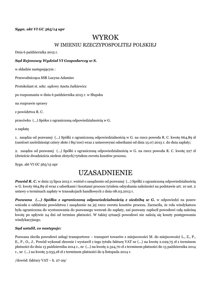 Sygn. akt VI GC 565/14 upr WYROK W IMIENIU RZECZYPOSPOLITEJ POLSKIEJ Dnia 6 października 2015 r. Sąd Rejonowy Wydział VI Gospodarczy w S. w składzie następującym : Przewodnicząca SSR Lucyna Adamiec Protokolant st. sekr. sądowy Aneta Jaśkiewicz po rozpoznaniu w dniu 6 października 2015 r. w Słupsku na rozprawie sprawy z powództwa R. C. przeciwko (...) Spółce z ograniczoną odpowiedzialnością w G. o zapłatę 1. zasądza od pozwanej (...) Spółki z ograniczoną odpowiedzialnością w G. na rzecz powoda R. C. kwotę 664,89 zł (sześćset sześćdziesiąt cztery złote i 89/100) wraz z ustawowymi odsetkami od dnia 15.07.2015 r. do dnia zapłaty; 2. zasądza od pozwanej (...) Spółki z ograniczoną odpowiedzialnością w G. na rzecz powoda R. C. kwotę 227 zł (dwieście dwadzieścia siedem złotych) tytułem zwrotu kosztów procesu. Sygn. akt VI GC 565/15 upr UZASADNIENIE Powód R. C. w dniu 15 lipca 2015 r. wniósł o zasądzenie od pozwanej (...) Spółki z ograniczoną odpowiedzialnością w G. kwoty 664,89 zł wraz z odsetkami i kosztami procesu tytułem odzyskania należności na podstawie art. 10 ust. 2 ustawy o terminach zapłaty w transakcjach handlowych z dnia 08.03.2013 r. Pozwana (...) Spółka z ograniczoną odpowiedzialnością z siedzibą w G. w odpowiedzi na pozew wniosła o oddalenie powództwa i zasądzenie na jej rzecz zwrotu kosztów procesu. Zarzuciła, że rola windykatora była ograniczona do wystosowania do pozwanego wezwań do zapłaty, zaś pozwany zapłacił powodowi całą należną kwotę po upływie 24 dni od terminu płatności. W takiej sytuacji powodowi nie należą się koszty postępowania windykacyjnego. Sąd ustalił, co następuje: Pozwana zleciła powodowi usługi transportowe – transport towarów z miejscowości M. do miejscowości L., Z., P., E., P., O., J.. Powód wykonał zlecenie i wystawił z tego tytułu fakturę VAT nr (...) na kwotę 2.029,75 zł z terminem płatności do dnia 13 października 2014 r., nr (...) na kwotę 2.324,70 zł z terminem płatności do 13 października 2014 r., nr (...) na kwotę 3.033,18 zł z terminem płatności do 9 listopada 2014 r. /dowód: faktury VAT – k. 27-29/ Z uwagi na brak płatności w zakreślonym terminie, powód skorzystał z pomocy firmy windykacyjnej, która wysłała do pozwanej najpierw upomnienie, a następnie wezwania do zapłaty. /dowód: faktura VAT wraz z potwierdzeniem przelewu – k. 23-24, upomnienie – k. 14-15, wezwanie do zapłaty – k. 16-17, wezwanie do zapłaty – k. 20-21/ W dniu 5 stycznia 2015 r. pozwana wpłaciła po3wodowi kwotę 7.387,63 zł. Następnie, w dniu 8 stycznia 2015 r. powód wystawił notę księgową na kwotę 664,89 zł tytułem kosztów odzyskiwania należności i wezwał pozwaną do zapłaty wyżej wskazanej kwoty. Pozwana wskazała, iż żądanie powoda jest bezzasadne. /dowód: nota księgowa nr (...) – k. 25, wezwanie do zapłaty – k. 30, pismo pozwanej – k. 43-45/ Sąd zważył, co następuje: Powództwo zasługuje na uwzględnienie. W przedmiotowej sprawie powód dochodził od pozwanej kwoty 664,89 zł stanowiącej koszty dochodzonej należności niezapłaconej przez pozwaną. Bezspornym między stronami było zarówno istnienie należności, jak i jej uregulowanie z opóźnieniem. Bezspornym jest również, że powód dochodzi swojego roszczenia w oparciu o art. 10 ust. 1 ustawy z dnia 8 marca 2013 r. o terminach zapłaty w transakcjach handlowych (Dz.U. 2013 r., poz. 403), zgodnie z którym wierzycielowi, od dnia nabycia uprawnienia do odsetek, o którym mowa w art. 7 ust. 1 lub art. 8 ust. 1, bez wezwania, przysługuje od dłużnika z tytułu rekompensaty za koszty odzyskiwania należności równowartość kwoty 40 Euro przeliczonych na złote według średniego kursu Euro ogłoszonego przez Narodowy Bank Polski ostatniego dnia roboczego miesiąca poprzedzającego miesiąc, w którym świadczenie pieniężne stało się wymagalne. Warunkiem sine qua non powstania roszczenia jest upływ terminu zapłaty, od którego należne są odsetki. Oczywiście nabycie uprawnienia do odsetek zależne jest od niespełnienia świadczenia przez dłużnika w terminie 30 bądź 60 dni – w zależności kto jest dłużnikiem. Nadto, ustawa stanowi, że w razie braku płatności w terminie ekwiwalent 40 Euro należny jest bez wezwania. Co istotne, przepisy zarówno ustawy o terminach zapłaty w transakcjach handlowych jak i dyrektywy (...), mówią o stałej kwocie 40 Euro jako o rekompensacie za koszty odzyskania należności. Wykładnia historyczna wyraźnie zatem wskazuje, że roszczenie to jest zależne od dochodzenia należności przez wierzyciela. Jest ono należne tylko w przypadku podjęcia przez wierzyciela jakichkolwiek działań w celu odzyskania należności (np. przekazanie sprawy organizacji zrzeszającej przedsiębiorców – art. 14 ustawy o terminach zapłaty w transakcjach handlowych)(więcej w: Sz. Gołębiowski, Nowe instrumenty zwalczania opóźnień płatności w ustawie o terminach zapłaty w transakcjach handlowych, Przegląd prawa handlowego nr 1/2015, s. 38-44). Zatem, by uznać, że kwota 40 Euro jest należna powodowi Sąd zbadał, czy rzeczywiście doszło u wierzyciela do poniesienia kosztów w związku z odzyskaniem należności, gdyż jak wskazano powyżej, kwota taka może być dochodzona tylko w przypadku podjęcia przez wierzyciela działań w celu odzyskania należności jako rekompensata za te działania. Utarte orzecznictwo sądowe wskazuje, że zgodnie z zasadami procesu cywilnego ciężar gromadzenia materiału dowodowego spoczywa na stronach (art. 232 k.p.c., art. 3 k.p.c., art. 6 k.c.). Jego istota sprowadza się do ryzyka poniesienia przez stronę ujemnych konsekwencji braku wywiązania się z powinności przedstawienia dowodów. Skutkiem braku wykazania przez stronę prawdziwości twierdzeń o faktach istotnych dla sprawy jest tylko to, że twierdzenia takie zasadniczo nie będą mogły leżeć u podst