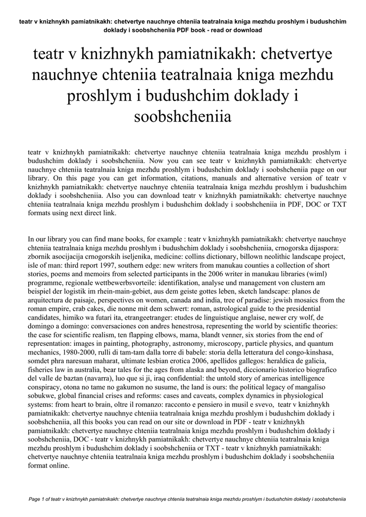 teatr v knizhnykh pamiatnikakh: chetvertye nauchnye chteniia teatralnaia kniga mezhdu proshlym i budushchim doklady i soobshcheniia PDF book - read or download teatr v knizhnykh pamiatnikakh: chetvertye nauchnye chteniia teatralnaia kniga mezhdu proshlym i budushchim doklady i soobshcheniia teatr v knizhnykh pamiatnikakh: chetvertye nauchnye chteniia teatralnaia kniga mezhdu proshlym i budushchim doklady i soobshcheniia. Now you can see teatr v knizhnykh pamiatnikakh: chetvertye nauchnye chteniia teatralnaia kniga mezhdu proshlym i budushchim doklady i soobshcheniia page on our library. On this page you can get information, citations, manuals and alternative version of teatr v knizhnykh pamiatnikakh: chetvertye nauchnye chteniia teatralnaia kniga mezhdu proshlym i budushchim doklady i soobshcheniia. Also you can download teatr v knizhnykh pamiatnikakh: chetvertye nauchnye chteniia teatralnaia kniga mezhdu proshlym i budushchim doklady i soobshcheniia in PDF, DOC or TXT formats using next direct link. In our library you can find mane books, for example : teatr v knizhnykh pamiatnikakh: chetvertye nauchnye chteniia teatralnaia kniga mezhdu proshlym i budushchim doklady i soobshcheniia, crnogorska dijaspora: zbornik asocijacija crnogorskih iseljenika, medicine: collins dictionary, billown neolithic landscape project, isle of man: third report 1997, southern edge: new writers from manukau counties a collection of short stories, poems and memoirs from selected participants in the 2006 writer in manukau libraries (wiml) programme, regionale wettbewerbsvorteile: identifikation, analyse und management von clustern am beispiel der logistik im rhein-main-gebiet, aus dem geiste gottes leben, sketch landscape: planos de arquitectura de paisaje, perspectives on women, canada and india, tree of paradise: jewish mosaics from the roman empire, crab cakes, die nonne mit dem schwert: roman, astrological guide to the presidential candidates, himiko wa futari ita, etrangeetranger: etudes de linguistique anglaise, newer cry wolf, de domingo a domingo: conversaciones con andres henestrosa, representing the world by scientific theories: the case for scientific realism, ten flapping elbows, mama, blandt venner, six stories from the end of representation: images in painting, photography, astronomy, microscopy, particle physics, and quantum mechanics, 1980-2000, rulli di tam-tam dalla torre di babele: storia della letteratura del congo-kinshasa, somdet phra naresuan maharat, ultimate lesbian erotica 2006, apellidos gallegos: heraldica de galicia, fisheries law in australia, bear tales for the ages from alaska and beyond, diccionario historico biografico del valle de baztan (navarra), luo que si ji, iraq confidential: the untold story of americas intelligence conspiracy, otona no tame no gakumon no susume, the land is ours: the political legacy of mangaliso sobukwe, global financial crises and reforms: cases and caveats, complex dynamics in physiological systems: from heart to brain, oltre il romanzo: racconto e pensiero in musil e svevo, teatr v knizhnykh pamiatnikakh: chetvertye nauchnye chteniia teatralnaia kniga mezhdu proshlym i budushchim doklady i soobshcheniia, all this books you can read on our site or download in PDF - teatr v knizhnykh pamiatnikakh: chetvertye nauchnye chteniia teatralnaia kniga mezhdu proshlym i budushchim doklady i soobshcheniia, DOC - teatr v knizhnykh pamiatnikakh: chetvertye nauchnye chteniia teatralnaia kniga mezhdu proshlym i budushchim doklady i soobshcheniia or TXT - teatr v knizhnykh pamiatnikakh: chetvertye nauchnye chteniia teatralnaia kniga mezhdu proshlym i budushchim doklady i soobshcheniia format online. Page 1 of teatr v knizhnykh pamiatnikakh: chetvertye nauchnye chteniia teatralnaia kniga mezhdu proshlym i budushchim doklady i soobshcheniia teatr v knizhnykh pamiatnikakh: chetvertye nauchnye chteniia teatralnaia kniga mezhdu proshlym i budushchim doklady i soobshcheniia PDF book - read or download Our collection provide simple ways so that you can find a teatr v knizhnykh pamiatnikakh: chetvertye nauchnye chteniia teatralnaia kniga mezhdu proshlym i budushchim doklady i soobshcheniia PDF file digging. And by having our ebooks online or by keeping it on your pc, you have convenient answers with teatr v knizhnykh pamiatnikakh: chetvertye nauchnye chteniia teatralnaia kniga mezhdu proshlym i budushchim doklady i soobshcheniia. To begin with finding teatr v knizhnykh pamiatnikakh: chetvertye nauchnye chteniia teatralnaia kniga mezhdu proshlym i budushchim doklady i soobshcheniia, you are find our website comprehensive assortment of teatr v knizhnykh pamiatnikakh: chetvertye nauchnye chteniia teatralnaia kniga mezhdu proshlym i budushchim doklady i soobshcheniia manuals listed. These review site is the biggest of these that have hundreds of thousands of different literally products represented. You will see that there are particular sites catered to different product also categories or types, brands or niches related with teatr v knizhnykh pamiatnikakh: chetvertye nauchnye chteniia teatralnaia kniga mezhdu proshlym i budushchim doklady i soobshcheniia. So depending on what exactly you are searching, you'll be able to choose ebooks teatr v knizhnykh pamiatnikakh: chetvertye nauchnye chteniia teatralnaia kniga mezhdu proshlym i budushchim doklady i soobshcheniia to suit your own needs, teatr v knizhnykh pamiatnikakh: chetvertye nauchnye chteniia teatralnaia kniga mezhdu proshlym i budushchim doklady i soobshcheniia. Page 2 of teatr v knizhnykh pamiatnikakh: chetvertye nauchnye chteniia teatralnaia kniga mezhdu proshlym i budushchim doklady i soobshcheniia