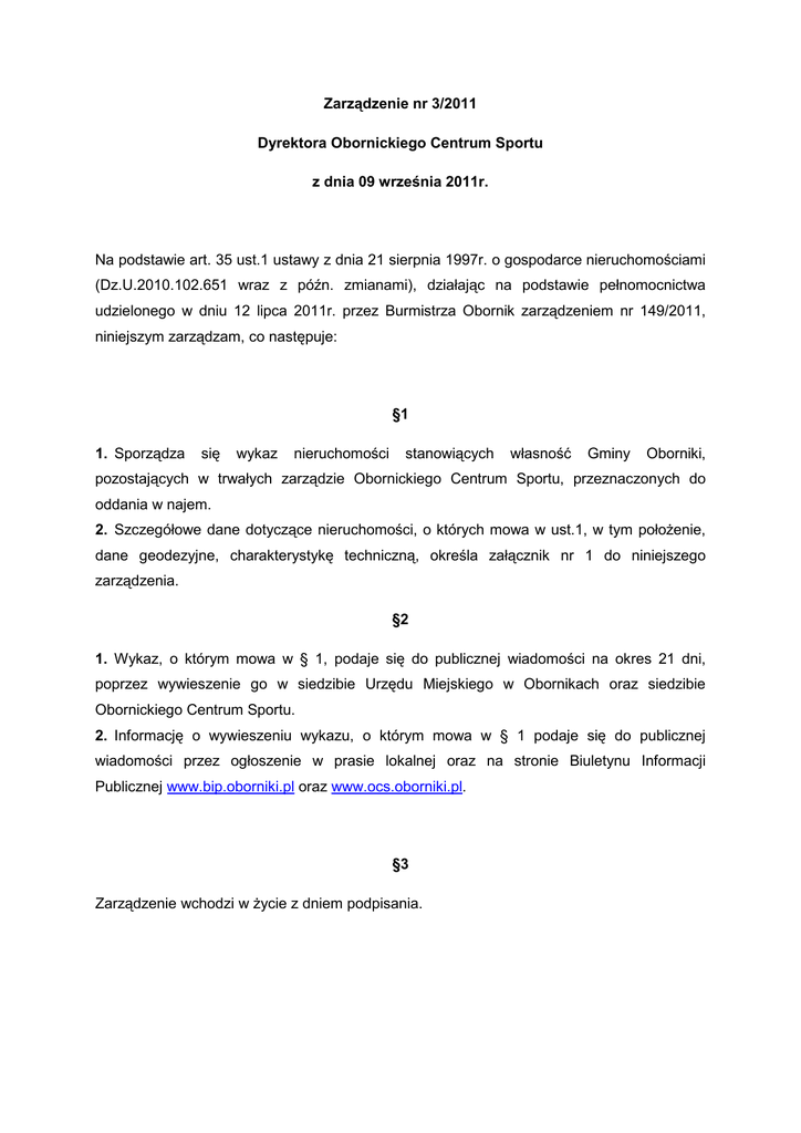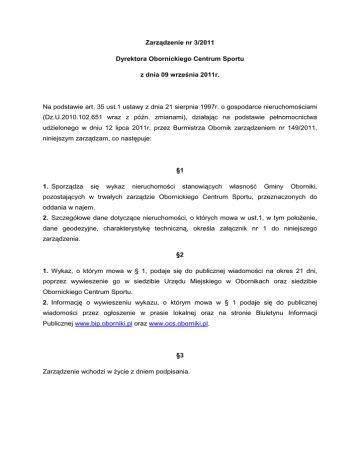 Zarządzenie nr 3/2011 Dyrektora Obornickiego Centrum Sportu z dnia 09 września 2011r. Na podstawie art. 35 ust.1 ustawy z dnia 21 sierpnia 1997r. o gospodarce nieruchomościami (Dz.U.2010.102.651 wraz z późn. zmianami), działając na podstawie pełnomocnictwa udzielonego w dniu 12 lipca 2011r. przez Burmistrza Obornik zarządzeniem nr 149/2011, niniejszym zarządzam, co następuje: §1 1. Sporządza się wykaz nieruchomości stanowiących własność Gminy Oborniki, pozostających w trwałych zarządzie Obornickiego Centrum Sportu, przeznaczonych do oddania w najem. 2. Szczegółowe dane dotyczące nieruchomości, o których mowa w ust.1, w tym położenie, dane geodezyjne, charakterystykę techniczną, określa załącznik nr 1 do niniejszego zarządzenia. §2 1. Wykaz, o którym mowa w § 1, podaje się do publicznej wiadomości na okres 21 dni, poprzez wywieszenie go w siedzibie Urzędu Miejskiego w Obornikach oraz siedzibie Obornickiego Centrum Sportu. 2. Informację o wywieszeniu wykazu, o którym mowa w § 1 podaje się do publicznej wiadomości przez ogłoszenie w prasie lokalnej oraz na stronie Biuletynu Informacji Publicznej www.bip.oborniki.pl oraz www.ocs.oborniki.pl. §3 Zarządzenie wchodzi w życie z dniem podpisania. Załącznik nr 1 do Zarządzenia nr 3/2011 Dyrektora Obornickiego Centrum Sportu Dyrektor Obornickiego Centrum Sportu działający na podstawie pełnomocnictwa udzielonego w dniu 12 lipca 2011r. przez Burmistrza Obornik zarządzeniem nr 149/2011, zgodnie z art. 35 ust.1 ustawy z dnia 21 sierpnia 1997r. o gospodarce nieruchomościami (Dz.U.2010.102.651 wraz z późn.) zmianami podaje do publicznej wiadomości WYKAZ NIERUCHOMOŚCI Przeznaczonych do oddania w najem 1. Sala gimnastyczna mała I Oznaczenie nieruchomości według księgi PO1O/00017368/2 wieczystej/katastru nieruchomości Adres/położenie nieruchomości Oborniki, ul. Obrzycka 88 (Hala 1 piętro; 101) 64-600 Oborniki Powierzchnia nieruchomości Powierzchnia Sali gimnastycznej małej I: 88m2 Opis nieruchomości Sala gimnastyczna mała I stanowi części budynku Hali Sportowej kondygnacyjny), energia (budynek uzbrojonego elektryczna, w wod. dwu media: – kan., ogrzewanego za pomocą CO Przeznaczenie nieruchomości, sposób jej Działalność rekreacyjno – sportowa, jak np. zagospodarowania organizacja zajęć tańca nowoczesnego itp. Zastrzega się prawo do korzystania z przedmiotowej nieruchomości w godzinach 08:00- 15:00 Obornikach przez ul. Zespół Obrzycka 88; Szkół w Najemcy przysługiwać będzie prawo do korzystania z nieruchomości od poniedziałku do piątku w godzinach: 15:00-21:00. Szczegółowe zasady najmu zostaną określone w umowie najmu Przewidywany okres, na który zawarta 3 lata będzie umowa najmu Wysokość opłat Minimalna wartość: 1300 zł (netto) za miesiąc; zostanie ostateczna określona w wartość czynszu drodze przetargu ustnego. Termin wnoszenia opłat Miesięcznie do 10 dnia każdego miesiąca; Wyposażenie Sala wyposażona jest w lustra na całej, jednej ze ścian; podłoga wykończona panelami 2. Sala fitness wraz z pomieszczeniami przyległymi Oznaczenie nieruchomości według księgi PO1O/00016256/7 wieczystej/katastru nieruchomości Adres/położenie nieruchomości Oborniki, ul. Czarnkowska 84, 64-600 Oborniki Powierzchnia nieruchomości Powierzchnia całkowita: 212 m2 Powierzchnia poszczególnych pomieszczeń: Sala areobik: 45,72m2 Sala fitness: 76,95 m2 Część socjalna: 13,31 m2 Część socjalna dla klientów: 7,62 m2 Szatnia dla klientów: 8,15 m2 Recepcja: 50,03 m2 Magazynek I: 5,82 m2 Magazynek II: 4,85 m2 Opis nieruchomości Sala fitness, wraz z pomieszczeniami przyległymi stanowią część obiektu pływalni, położonej w Czarnkowskiej Obornikach 84. Budynek przy ul. pływalni uzbrojony jest w media: energia elektryczna, wod. – kan. oraz ogrzewany za pomocą CO Przeznaczenie nieruchomości, sposób jej Działalność zagospodarowania rekreacyjno – sportowa przeznaczona dla kobiet jak np. organizacja zajęć tańca nowoczesnego, zajęć fitness itp. Szczegółowe zasady najmu zostaną określone w umowie najmu Przewidywany okres, na który będzie umowa najmu; warunki najmu zawarta Do 3 lat; Najemca obowiązany będzie wykupić od wynajmującego sprzęt sportowy określony w wykazie zawartym w załączniku nr 1 do niniejszego wykazu nieruchomości. Wynajmujący dopuszcza możliwość zapłaty ceny za przedmiotowe wyposażenie w sposób ratalny. Pozostałe warunki sprzedaży w/w sprzętu zostaną określone w odrębnej umowie sprzedaży. Wysokość opłat Minimalna wartość: 2 500,00 zł (netto) za miesiąc; zostanie ostateczna ustalona w wartość czynszu drodze przetargu ustnego. Termin wnoszenia opłat Miesięcznie do 10 dnia każdego miesiąca Wyposażenie Lustra, sprzęt sportowy – zgodnie z wykazem zawartym w załączniku nr 1, wyposażenie pomieszczeń socjalnych oraz szatni (szafki, krzesła itp.) według wykazu zawartego w załączniku nr 1; w/w wykazy wyposażenia stanowią załącznik niniejszego wykazu nieruchomości. do