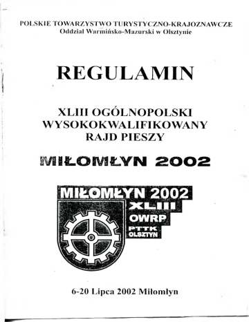 POLSKIE TOWARZYSTWO TURYSTYCZNO-KRAJOZNAWCZE Oddział Warmińsko-Mazurski w Olsztynie REGULAMIN ХLIП OGÓLNOPOLSKI WYSOKOKWALIFIKOWANY RAJD PIESZY M IŁ O M Ł Y N 2 0 0 2 6-20 Lipca 2002 Miłomłyn KALENDARIUM OWRP ] 11 III IV V VI VII VIII IX X XI XII XIII XIV XV XVI XVII XVIII XIX XX XXI XXII XXIII XXIV XXV XXVI XXVII XXVIII XXIX XXX XXXI XXXII XXXIII XXXIV XXXV XXXVI XXXVII XXXVIII XXXIX XL XL1 Xl.ll XLI1I 1960 1961 1962 1963 1964 1965 1966 1967 1968 1969 1970 1971 1972 1973 1974 1975 1976 1977 1978 1979 1980 1981 1982 1983 1984 1985 1986 1987 1988 1989 1990 1991 1992 1993 1994 1995 1996 1997 1998 1999 2000 2001 2002 Wyżyna Krakowsko-Częstochowska Roztocze Mazury Garbate Pojezierze Suwalsko-Augustowskie Ziemia Lubelska Dolny Śląsk Kaszuby Ziemia Łódzka Pogórze Dynowskie Wyżyna Ińska Pojezierze Trzcianeckie Kurpie Bory Dolnośląskie Wysoczyzna Elbląska Roztocze Nizina Szczecińska Południowe Mazowsze Nizina Śląska Ziemia Opolska Ziemia Chełmska i Podlasie Warmia i Mazury Jura Krakowsko-Wieluńska Mazury Ziemia Chełmińska Wielkopolska Ziemia Elbląska Ziemia Lubelska Góry Świętokrzyskie Ziemia Białostocka Ziemia Lubuska Ziemia Radomska Ziemia Toruńska Pomorze Górny Śląsk Środkowe Nadodrze Ziemia Lubelska Ziemia Suwalska Ziemia Toruńska Ziemia Gdańska Podlasie Ziemia Radomska Jura Krakowsko-Wieluńska Warmia - Mazury Zloty Potok Zwierzyniec Węgorzewo Suwałki Zemborzycc Jezioro Witka Sopot Działoszyn Dynów Szadzko Krzyż Nowogród Bolesławiec Kadyny Zamość Moryń Szydłowiec Rokitki Otmuchów Chełm Olsztyn Olsztyn Augustów Toruń Bucharzewo Elbląg Lublin Suchedniów Białystok Kostrzyń Przysucha Toruń Dąbki Świerklaniec Zielona Góra Lublin Augustów Toruń Gdańsk Supraśl Warka Łazy Miłomłyn Regulamin XLIII Ogólnopolskiego Wysokokwalifikowanego Rajdu Pieszego „Miłomłyn - 2002” CELE RAJDU Promocja turystyczna przepięknej ziemi woj. Warmińsko - Mazurskiego Krainy jezior i lasów. Poznanie walorów przyrodniczych, historycznych i krajoznawczych. Uczczenie 50 - lecia powstania i działania Komisji Turystyki Pieszej ZG PTTK. Propagowanie turystyki kwalifikowanej jako czynnego wypoczynku. Zdobywanie odznak turystycznych. Spotkanie kadry PTTK i wymiana doświadczeń. PATRONAT HONOROWY Marszałek Województwa Warmińsko - Mazurskiego - Andrzej Ryński. ORGANIZATORZY Oddział Warmińsko - Mazurski PTTK w Olsztynie - RKTP z inspiracji Komisji Turystyki Pieszej ZG PTTK. Metę współorganizuje Urząd Miasta i Gminy Miłomłyn. W organizacji rajdu pomaga Oddział PTTK Ziemi Elbląskiej. GŁÓWNI SPONSORZY RAJDU Ministerstwo Gospodarki - D epartam ent Turystyki. Urząd Marszałkowski Woj. W arm ińsko - M azurskiego Departam ent Turystyki. KIEROWNICTWO RAJDU Komandor - Stanisław Gawroński Z-ca Komandora ds. org. - Elżbieta Nowak Sekretarz - Anna Graczykowska Członek - Anna Gawrońska Członek - skarbnik - W eronika Markowska Kierownicy tras I. II. III. IV. V. Jarosław Karpiński, Jadwiga Witkowska, Magdalena Gawrońska, Adam Gawroński Henryk Bąk, Henryk Cygan Henryk Myśliński, Andrzej Wiśniewski Alicja Opalińska, Marek Błaszczyk, Piotr Zawada TERMIN I META RAJDU 6.07. do 20.07.2002 r., 5 tras pieszych prowadzących po niezwykle atrakcyjnych terenach Warmii i Mazur, Wysoczyzny Elbląskiej, przez Parki Krajobrazowe, lasy, jeziora. 6.07. - jest dniem dojazdu i zakwaterowania. W dniu 20.07, w godzinach popołudniowych, w Miłomłynie przy hotelu „Miłomłyn” odbędzie się uroczyste zakończenie Rajdu, w tym: zakwaterowanie uczestników rajdu, weryfikacja odznak turystycznych, finały konkursów - wręczenie nagród, ognisko, posiłek turystyczny, spotkanie z władzami samorządowymi. WARUNKI UCZESTNICTWA Rajd jest imprezą turystyki kwalifikowanej, wymagającej od uczestników odpowiedniego sprzętu, wyposażenia i doświadczenia turystycznego. Uczestnikami rajdu powinni być wytrawni turyści - członkowie PTTK, inne osoby będą przyjmowane w miarę wolnych miejsc. Osoby niepełnoletnie mogą brać udział w Rajdzie pod opieką i na odpowiedzialność osób dorosłych (1 opiekun na 10-osobową drużynę dzieci lub młodzieży). Warunkiem przyjęcia na Rajd jest nadesłanie w terminie zgłoszenia i wpłacenie wpisowego ( ksero w załączeniu) do karty zgłoszenia. Ilość miejsc na poszczególnych trasach jest ograniczona, o przyjęciu decydować będzie kolejność zgłoszeń, w przypadku braku miejsc na danej trasie, drużyna może być przesunięta na inną trasę, lub nie przyjęta z powodu braku miejsc. TRASY RAJDU I. TRASA przez Pojezierze Mazurskie (14 - dniowa) 07.07 Pisz - Maldanin - Jeglin - Karwik - Jez. Seksty 08 07 Jez. Seksty - Końcewo - Wejsuny - Ruciane Nida - Jezoro Nidzkie 09.07 Jez. Nidzkie - Leśniczówka Pranie - Karwica Mazurska (PKP) - Krutyń Rezerwat „Zakręt” - Rezerwat „Królewska Sosna” - Jez. Mokre - Zgon 10.07 Zgon - Spychowo - Jez. Zyzdrój - Babięta II. 07 Babięt a - Krawno - Jez. Marksoby - Szczytno 12.07 Szczytno - Sędańsk - Piduń - Szuć - Jedwabno 13.07 Jedwabno - Leśniczówka Grobka - Omulew - Jez. Trzcinowe - Wikno Jabłonka 14.07 Jabłonka - Likusy - Orłowo - Rezerwat „Źródła Łyny” - Żelazno - Maróz 15.07 Dzień odpoczynku nad Jez. Maróz 16.07 Maróz - Waplewo - Sitno - Tymawa 17.07 Tymawa - Mielno - Lipowa Góra - Gierzwałd - Dylewo - Pląchawy Klonowo - Napromek 18.07 Napromek - Glaznoty - Dylewska Góra - Rezerwat „Jez. Francuskie” Pietrzwałd - Samborowo 19.07 Samborowo - Boguszewo - Liwa - Kanał Elbląski - Piiawki - Bagieńsko Zatoka - Tarda 20.07 Tarda - Winiec - Miłomłyn 2. TRASA przez Pojezierze Olsztyńskie (14 - dniowa, zalecana dla młodzieży) 7.07 Olsztyn - Jez. Długie - Redykajny - Gutkowo - Łupsztych - Jez. Krzywe Olsztyn 8.07 Olsztyn (zwiedzanie) - Jaroty - Jez. Bartążek - Ruś 9.07 Ruś - Rezerwat „Las Warmiński” - Jez. Łańskie - Półwysep Lalka Stara Kaletka - Nowa Kaletka - Jez. Gim 10.07 Jez.Gim - Zgniłocha - Czarny Piec - 