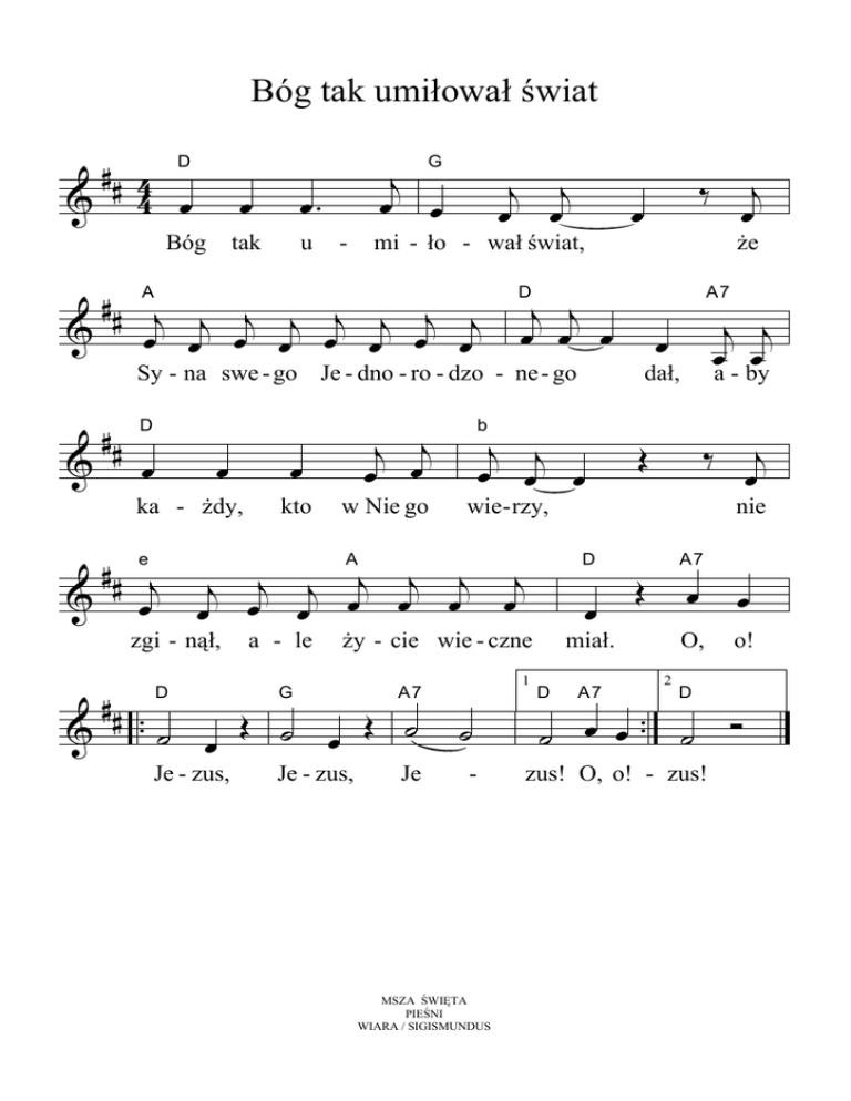 Bóg tak umiłował świat ## 4 D & 4 œ j œ œ G Bóg œ œ. tak u - j j œ œ mi - ło - wał świat, # # Aj j j j j j j j & œ œ œ œ œ œ œ œ & j j œ œ D j j œ œ œ œ œ ka - Ŝdy, œ kto w Nie go j œ œj œ a - le D œ Ŝy - cie wie - czne # & # .. ˙ œ Œ ˙ œ Œ ˙ D G A7 Je - zus, Je - zus, Je j j œ œ œ a - by Œ ‰ wie- rzy, A ## ej j & œ œj œ œj œj œj œj œj zgi - nął, A7 dał, b 1 ˙ - MSZA ŚWIĘTA PIEŚNI WIARA / SIGISMUNDUS A7 Œ 2 œ œ O, o! ˙ œ œ .. ˙ A7 j œ nie miał. D j œ Ŝe D Sy - na swe - go Je - dno - ro - dzo - ne - go ## ‰ œ D zus! O, o! - zus! Ó