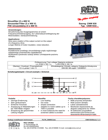 TRANSFORMATOREN Sinusfilter (3 x 400 V) Sinusoidal Filter (3 x 400 V) Filtr sinusoidalny (3 x 400 V) Szereg CNW 930 Typ CNW 933/... Anwendungen: Sinusformung des Ausgangsstromes an einem Frequenzumrichterausgang. Zur Lebensdauerverlängerung der Motorisolation, Geräuschminderung. Applications: Sine wave creation of the output current on the output of a frequency drive. Longer lifetime of motor insulation, noise reduction. Zastosowania: Kształtowanie przebiegu sinusoidalnego prądu wyjściowego napędowego przemiennika częstotliwości. Wydłużenie żywotności izolacji silnika i zmniejszenie poziomu dźwięku. Prüfspannung/ Test voltage/ Napięcie probierze L-L 2100 V, DC 1 s L-PE 2700 V, DC 1s Überlast / Overload / Przeciążalność Klimakategorie/ Climatic category/ Kategoria klimatyczna 1,5 x IN przez 1 min / h DIN IEC 68 część 1 25/085/21 Schaltungsbeispiel • Circuit example • Schemat Vorteile: • Geringe Erwärmung • Sehr geräuscharm • Einfacher Anschluß • Anpassung an Motorleitungen bis 1000 Meter möglich • Einsparung der geschirmten Leitung möglich Podlega modyfikacjom technicznym Benefits: • Low heating • low noise • simple connection • adaption to motor cables up to 1000 m possible • in most instances the need for screened cables is avoided Cechy charakterystyczne: • Małe przyrosty temperatur • Niski poziom dźwięku • Łatwe zainstalowanie • Mozliwość dopasowanie do długości połączenia do 1000m • W wiekszości przypadków eliminowana jest konieczność stosowania ekranowanych kabli. FILTR_CNW933.doc REO CROMA ul. Pożaryskiego 28 04-703 WARSZAWA Tel. (22) 8126182; 8123066 Fax. (22) 8156906 E-mail: [email protected] CNW 933/Strona 1 z 3 TRANSFORMATOREN Technische Daten • Technical data • Dane techniczne Typ Nennspannung Rated voltage Napięcie znamionowe Nennstrom Rated current Prąd znamionowy Induktivität pro Strang Inductance per branch Indykcyjność gałęzi [mH] [A] [V] CNW 933/4 CNW 933/6 CNW 933/8 CNW 933/10 CNW 933/12 CNW 933/16 CNW 933/24 CNW 933/30 CNW 933/37 CNW 933/48 CNW 933/60 CNW 933/75 CNW 933/90 CNW 933/115 CNW 933/150 CNW 933/180 CNW 933/200 CNW 933/250 3 x 400 50/60 Hz 4 6 8 10 12 16 24 30 37 48 60 75 90 115 150 180 200 250 13,5 6,8 7,5 5 4,7 3,6 2,4 2,1 1,7 1,5 1,1 0,9 0,8 0,65 0,5 0,44 0,4 0,33 Taktfrequenz Cycle frequency Częstotl. przemiennika [kHz] Gewicht Weight Masa 4-8 4-8 4-8 4-8 4-8 4-8 4-8 4-8 4-8 4-8 4-8 4-8 4-8 4-8 4-8 4-8 4-8 4-8 2,2 3,2 3,2 5 6,8 9 12 14 22 24 26 40 55 60 75 85 120 120 ca. [kg] Andere Ströme auf Anfrage Other currents on request Wykonania na inne prądy po uzgodnieniu Die Ausgangsfilter sind auf Motorleitungen bis zu 200 m ausgerichtet. Bei längeren Leitungen wird eine geringe Anpassung durchgeführt. Geben Sie dazu bitte die Länge und den Typ der Leitung an. Wichtig ist es, darauf zu achten die Ein- und Ausgangsklemmen nicht zu tauschen. Das Anschließen der Kondensatoren direkt an den Umrichter Ausgang kann zu einer Schädigung der Schaltung führen. The output filters are designed for motor cables up to 200 m, with longer cables a small adaption will be effected. Just let us know the cable type and length. It is important to ensure that the input and output terminals are not exchanged. Direct connection of the capacitors on the inverter output may damage the circuit. Filtry wyjściowe sa przeznaczone dla długości kabli silnikowych do 200m. W przypadku dłuższych kabli mozliwa jest adaptacja wykonania. W takim przypadku należy podać rodzaj i długość kabla. Bardzo ważna jest pewność, że nie zamieniono zacisków wejściowych i wyjściowych. Bezpośrednie przyłaczenie kondensatorów do wyjścia przemiennika grozi uszkodzeniem układu. Podlega modyfikacjom technicznym FILTR_CNW933.doc CNW 933/Strona 2 z 3 TRANSFORMATOREN B Maßbild • Dimension Drawing • Wymiary E C A Abmessungen • Dimensions • Wymiary Typ CNW 933/4 CNW 933/6 CNW 933/8 CNW 933/10 CNW 933/12 CNW 933/16 CNW 933/24 CNW 933/30 CNW 933/37 CNW 933/48 CNW 933/60 CNW 933/75 CNW 933/90 CNW 933/115 CNW 933/150 CNW 933/180 CNW 933/200 CNW 933/250 A B C D E ∅ [mm] [mm] [mm] [mm] [mm] [mm] 125 125 125 155 155 190 190 210 240 240 240 300 300 360 360 360 420 420 180 180 180 210 210 190 190 210 295 295 295 360 360 410 420 440 500 500 110 110 110 110 130 130 150 150 180 190 195 210 230 230 250 270 285 285 100 100 100 130 130 170 170 180 190 190 190 240 240 310 310 310 370 370 45 55 55 57 72 58 78 82 106 116 121 121 146 126 141 156 182 182 5 5 5 8 8 8 8 8 11 11 11 11 11 11 11 11 11 11 Podlega modyfikacjom technicznym FILTR_CNW933.doc Anschluß-Klemmen Connection-Terminals Połaczenie [mm2] 4 4 4 4 4 10 10 10 35 35 35 50 70 70 95 150 150 150 CNW 933/Strona 3 z 3