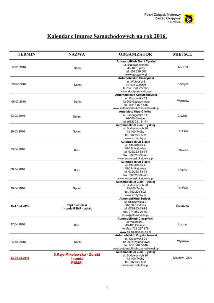 Polski Związek Motorowy Zarząd Okręgowy Katowice Kalendarz Imprez Samochodowych na rok 2016. TERMIN NAZWA 17.01.2016 Sprint 28.02.2016 Sprint 06.03.2016 Sprint 13.03.2016 Sprint 20.03.2016 Sprint 03.04.2016 KJS 09.04.2016 KJS 10.04.2016 Sprint 15-17.04.2016 Automobilklub Ziemi Tyskiej ul. Budowlanych 90 43-100 Tychy tel. 502 226 502 www.azt.tychy.pl Automobilklub Cieszyński ul. Wolności 3 43-400 Cieszyn tel./fax. 728 227 979 www.ak-cieszynski.ox.pl Automobilklub Częstochowski ul. Krakowska 31 42-200 Częstochowa tel. 0/513-027-816 www.automobilklubczestochowski.pl Auto Moto Klub Gliwice ul. Jasnogórska 11 44-100 Gliwice tel. (032) 231-31-41 Automobilklub Ziemi Tyskiej ul. Budowlanych 90 43-100 Tychy tel. 502 226 502 www.azt.tychy.pl Automobilklub Śląski ul. Stanisława 4 40-014 Katowice tel. 032/253-88-74 fax. 032/253-99-43 www.auto-slaski.katowice.pl Automobilklub Śląski ul. Stanisława 4 40-014 Katowice tel. 032/253-88-74 fax. 032/253-99-43 www.auto-slaski.katowice.pl Automobilklub Ziemi Tyskiej ul. Budowlanych 90 43-100 Tychy tel. 502 226 502 www.azt.tychy.pl Automobilklub Sudecki ul. Kliczkowska 2 58-100 Świdnica tel. 074/853-69-98 fax. 074/852-21-00 [email protected] Automobilklub Cieszyński ul. Wolności 3 43-400 Cieszyn tel./fax. 728 227 979 www.ak-cieszynski.ox.pl Automobilklub Częstochowski ul. Krakowska 31 42-200 Częstochowa tel. 0/513-027-816 www.automobilklubczestochowski.pl Automobilklub Ziemi Tyskiej ul. Budowlanych 90 43-100 Tychy tel. 502 226 502 www.rajd.mikolow.pl Rajd Świdnicki 1 runda RSMP - asfalt 17.04.2016 KJS 17.04.2016 Sprint 23-24.04.2016 ORGANIZATOR 5.Rajd Mikołowsko - Żorski I runda RSMŚl 1 MIEJSCE Tor FCA Kaczyce Wyrazów Gliwice Tor FCA Katowice Kraków Tor FCA Świdnica Ustroń Wyrazów Mikołów - Żory Polski Związek Motorowy Zarząd Okręgowy Katowice 30.04.2016 KJS 07.05.2016 2.Rally Sprint o Puchar Prezydenta Miasta Gliwice 08.05.2016 Sprint 14.05.2016 KJS 15.05.2016 Sprint 21-22.05.2016 6.Rajd Zamkowy II runda RSMŚl 27-29.05.2016 Rajd Kaszub Gdańsk Baltic Cup 2 runda RSMP - szuter 04.06.2016 Sprint 05.06.2016 Sprint 10-11.06.2016 4.Rajd Ziemi Bocheńskiej im. Janusza Kuliga III runda RSMŚl 18.06.2016 KJS 19.06.2016 Sprint 26.06.2016 Sprint 02.07.2016 KJS 01-03.07.2016 Automobilklub Rallymania ul. Jana Długosza 34/11 43-140 Lędziny www.ak-rallymania.pl Stowarzyszenie Moto Sport Gliwice ul. Kościuszki 35 44-100 Gliwice tel. 660 681 719 www.msg-rally.pl Automobilklub Ziemi Tyskiej ul. Budowlanych 90 43-100 Tychy tel. 502 226 502 www.azt.tychy.pl Automobilklub Śląski ul. Stanisława 4 40-014 Katowice tel. 032/253-88-74 fax. 032/253-99-43 www.auto-slaski.katowice.pl Automobilklub Częstochowski ul. Krakowska 31 42-200 Częstochowa tel. 0/513-027-816 www.automobilklubczestochowski.pl Automobilklub Zamkowy ul. Sportowa 6 42-500 Będzin tel. 0/501 452 595 www.rajdzamkowy.pl Automobilklub Orski Al. Niepodległości 931 81-861 Sopot tel./fax. 058/551-69-75 Automobilklub Cieszyński ul. Wolności 3 43-400 Cieszyn tel./fax. 728 227 979 www.ak-cieszynski.ox.pl Automobilklub Ziemi Tyskiej ul. Budowlanych 90 43-100 Tychy tel. 502 226 502 www.azt.tychy.pl Automobilklub Śląski ul. Stanisława 4 40-014 Katowice tel. 032/253-88-74 fax. 032/253-99-43 www.rajdziemibochenskiej.pl Automobilklub Śląski ul. Stanisława 4 40-014 Katowice tel. 032/253-88-74 fax. 032/253-99-43 www.auto-slaski.katowice.pl Automobilklub Częstochowski ul. Krakowska 31 42-200 Częstochowa tel. 0/513-027-816 www.automobilklubczestochowski.pl Automobilklub Beskidzki ul. Kazimierza Wielkiego 1 43-300 Bielsko Biała tel. (33) 812-22-81 Stowarzyszenie Moto Sport Gliwice ul. Kościuszki 35 44-100 Gliwice tel. 660 681 719 Polski Związek Motorowy Zarząd Główny ul. Kazimierzowska 66 02/518 Warszawa 73rd LOTOS Rally Poland 7 runda WRC 2 Bieruń Gliwice Tor FCA Czechowice-Dziedzice (Dankowice) Lotnisko Rudniki Będzin Gdańsk Zamarski Tor FCA Bochnia Łaziska Górne Lotnisko Rudniki Andrychów Gliwice Mikołajki Polski Związek Motorowy Zarząd Okręgowy Katowice 17.07.2016 04-06.08.2016 12-13.08.2016 14.08.2016 19-20.08.2016 26-27.08.2016 28.08.2016 02-04.09.2016 Sprint Rajd Rzeszowski 8 rd ERC 4 runda RSMP - asfalt KJS 2-dniowy KJS 3.Rajd Oświęcimski IV runda RSMŚl KJS Rajd Nadwiślański 5 runda RSMP - asfalt 03.09.2016 Sprint 04.09.2016 KJS 10.09.2016 3.Rally Sprint o Puchar Prezydenta Miasta Gliwice 10.09.2016 KJS 23-24.09.2016 02.10.2016 07-09.10.2016 Automobilklub Ziemi Tyskiej ul. Budowlanych 90 43-100 Tychy tel. 502 226 502 www.azt.tychy.pl Automobilklub Rzeszowski Al. Wyspiańskiego 2 35-111 Rzeszów tel. 017/853-31-60 fax. 017/853-31-39 Automobilklub Śląski ul. Stanisława 4 40-014 Katowice tel. 032/253-88-74 fax. 032/253-99-43 www.auto-slaski.katowice.pl Automobilklub Cieszyński ul. Wolności 3 43-400 Cieszyn tel./fax. 728 227 979 www.ak-cieszynski.ox.pl Automobilklub Rallymania ul. Jana Długosza 34/11 43-140 Lędziny www.ak-rallymania.pl Towarzystwo Motoryzacyjne „Zabytek” ul. Brodeckiego 7A 43-246 Strumień tel. 512 456 204 Automobilklub Polski ul. Pańska 85 00-834 Warszawa tel. 022/652-81-20 fax. 022/652-81-10 Automobilklub Częstochowski ul. Krakowska 31 42-200 Częstochowa tel. 0/513-027-816 www.automobilklubczestochowski.pl Automobilklub Ziemi Tyskiej ul. Budowlanych 90 43-100 Tychy tel. 502 226 502 www.azt.tychy.pl Stowarzyszenie Moto Sport Gliwice ul. Kościuszki 35 44-100 Gliwice tel. 660 681 719 www.msg-rally.pl Automobilklub Śląski ul. Stanisława 4 40-014 Katowice tel. 032/253-88-74 fax. 032/253-99-43 www.auto-slaski.katowice.pl Automobilklub Śląski ul. Stanisława 4 40-014 Katowice tel. 032/253-88-74 fax. 032/253-99-43 www.rajd-wisly.pl Automobilklub Śląski ul. Stanisława 4 40-014 Katowice tel. 032/253-88-74 fax. 032/253-99-43 www.auto-slaski.katowice.pl Automobilklub Ziemi Kłodzkiej ul. Harcerzy 3a 57-300 Kłodzko tel. 074/647-47-02 62.Rajd Wisły V runda RSMŚl KJS Rajd Dolnośląski 6 runda RSMP - asfalt 3 Tor FCA Rzeszów Kra