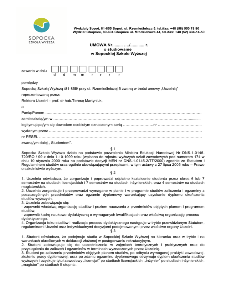Wydziały Sopot, 81-855 Sopot, ul. Rzemieślnicza 5. tel./fax: +48 (58) 550 78 80 Wydział Chojnice, 89-604 Chojnice ul. Młodzieżowa 44, tel./fax: +48 (52) 334-14-50 UMOWA Nr......... …./............ r. o studiowanie w Sopockiej Szkole Wyższej zawarta w dniu d d m m r r r r pomiędzy Sopocką Szkołą Wyższą /81-855/ przy ul. Rzemieślniczej 5 zwaną w treści umowy „Uczelnią" reprezentowaną przez: Rektora Uczelni - prof. dr hab.Teresę Martyniuk, a Panią/Panem …..……………………………………………………………………………………………….………. zamieszkałą/ym w ……………………………………………………………………………………………….......... legitymującą/ym się dowodem osobistym oznaczonym serią ……………………nr …………………………….. wydanym przez …………………………………………………………………………………………………………. nr PESEL .…………………………………………………….…………………………………………………………. zwaną/ym dalej „ Studentem”. §1 Sopocka Szkoła Wyższa działa na podstawie pozwolenia Ministra Edukacji Narodowej Nr DNS-1-0145720/RO / 99 z dnia 1-10-1999 roku (wpisana do rejestru wyższych szkół zawodowych pod numerem 174 w dniu 10 stycznia 2000 roku na podstawie decyzji MEN nr DNS-1-0145-2/TT/2000) zgodnie ze Statutem i Regulaminem studiów oraz ogólnie obowiązującymi przepisami, w tym ustawy z 27 lipca 2005 roku – Prawo o szkolnictwie wyższym. §2 1. Uczelnia oświadcza, że zorganizuje i poprowadzi odpłatne kształcenie studenta przez okres 6 lub 7 semestrów na studiach licencjackich i 7 semestrów na studiach inżynierskich, oraz 4 semestrów na studiach magisterskich. 2. Uczelnia zorganizuje i przeprowadzi wymagane w planie i w programie studiów zaliczenia i egzaminy z poszczególnych przedmiotów oraz egzamin dyplomowy warunkujący uzyskanie dyplomu ukończenia studiów wyższych. 3. Uczelnia zobowiązuje się: - zapewnić właściwą organizację studiów i poziom nauczania z przedmiotów objętych planem i programem studiów, - zapewnić kadrę naukowo-dydaktyczną o wymaganych kwalifikacjach oraz właściwą organizację procesu dydaktycznego. 4. Organizacja toku studiów i realizacja procesu dydaktycznego następuje w trybie przewidzianym Statutem, regulaminami Uczelni oraz indywidualnymi decyzjami podejmowanymi przez właściwe organy Uczelni. §3 1. Student oświadcza, że podejmuje studia w Sopockiej Szkole Wyższej na kierunku oraz w trybie i na warunkach określonych w deklaracji złożonej w postępowaniu rekrutacyjnym. 2. Student zobowiązuje się do uczestniczenia w zajęciach teoretycznych i praktycznych oraz do przystąpienia do zaliczeń i egzaminów w terminach wyznaczonych przez Uczelnię. 3. Student po zaliczeniu przedmiotów objętych planem studiów, po odbyciu wymaganej praktyki zawodowej, złożeniu pracy dyplomowej, oraz po zdaniu egzaminu dyplomowego otrzymuje dyplom ukończenia studiów wyższych i uzyskuje tytuł zawodowy „licencjat” po studiach licencjackich, „inżynier” po studiach inżynierskich, „magister” po studiach II stopnia. §4 1. W zamian za usługę edukacyjną określoną w § 2 niniejszej umowy Student zobowiązuje się do wnoszenia czesnego oraz innych opłat, których rodzaje, wysokość, sposób i terminy wnoszenia, a także konsekwencje niezachowania tych terminów określa załącznik nr 1 „Opłaty za studia w Sopockiej Szkole Wyższej” do niniejszej umowy. 2. Student oświadcza, że zapoznał się z załącznikiem nr 1 doręczonym mu przed zawarciem niniejszej umowy. 3. Student dokonuje wyboru jednego ze sposobów wnoszenia czesnego określonych w załączniku nr 2 „Deklaracja wyboru kierunku studiów i sposobu płatności” do niniejszej umowy. §5 1. Student może w każdym czasie zrezygnować ze studiów poprzez złożenie oświadczenia o rezygnacji na piśmie. W tym przypadku dniem rezygnacji jest dzień złożenia oświadczenia o rezygnacji w dziekanacie Uczelni lub dzień otrzymania przez Uczelnię przesyłki zawierającej oświadczenie o rezygnacji. 2. Opłata czesnego obowiązuje do dnia rezygnacji. 3. Rezygnacja ze studiów nie zwalnia Studenta z obowiązku wnoszenia zaległych opłat przewidzianych w załączniku nr 1 do niniejszej umowy. 4. Zaprzestanie uczęszczania na zajęcia nie zwalnia Studenta od wnoszenia czesnego w wymaganych terminach. Przekroczenie terminu zapłaty o dwa tygodnie może spowodować zawieszenie w prawach studenta lub skreślenie z listy studentów. Skreślenie z listy studentów nie zwalnia Studenta z obowiązku wniesienia czesnego do dnia, w którym skreślenie to nastąpiło, a także obowiązku wniesienia innych zaległych opłat przewidzianych w załączniku nr 1 do niniejszej umowy. §6 1. Umowa obowiązuje od dnia jej zawarcia do dnia ukończenia studiów lub skreślenia Studenta z listy studentów. 2. Status studenta uzyskuje osoba, która podpisała umowę o studiowanie, została przyjęta na pierwszy rok studiów oraz złożyła ślubowanie w treści określonej przez Statut Uczelni. §7 1. Wszelkich doręczeń Uczelnia będzie dokonywała na adres do korespondencji wskazany w kwestionariuszu osobowym złożonym w postępowaniu rekrutacyjnym. Korespondencję wysłaną na wskazany adres uważa się za doręczoną poprawnie do dnia pisemnego zawiadomienia Uczelni przez Studenta o zmianie tego adresu. §8 1. Student wyraża zgodę na upublicznianie wyników i ocen uzyskiwanych w trakcie procesu edukacyjnego w formach obowiązujących na Uczelni. 2. Student wyraża zgodę na używanie jego wizerunku w celach promocyjnych Sopockiej Szkoły Wyższej. 3. Student wyraża zgodę na przetwarzanie danych osobowych dla potrzeb niezbędnych do realizacji rekrutacji i dydaktyki zgodnie z Ustawą z dnia 29.08.1997 roku o ochronie danych osobowych (Dz.