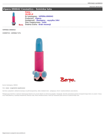 Informacje o produkcie Utworzono 08-03-2017 Vipera 090042 Cosmetics - Szminka tutu Cena : 10,90 zł Nr katalogowy : VIPERA.090042 Producent : Vipera Dostępność : Dostępny - wysyłka 24h! Stan magazynowy : niski Średnia ocena : brak recenzji VIPERA 090042 COSMETICS - SZMINKA TUTU Numer katalogowy: 090042 Stan: nowe - oryginalnie zapakowane Szminka z połyskiem, delikatnie barwiąca na pół-transparentny, lekko niebieski kolor - pielęgnuje, chroni i nawilża delikatne usta dziecka. Pielęgnacyjna Szminka o walorach dziecięcego balsamu do ust jest idealna na słoneczną pogodę i niepogodę. Szminka pozostawia powiew transparentnego koloru na ustach. Cieszy oczy małej Baletnicy, wywołuje świadomość własnej urody. Nieco świetlana barwa, może być stosowana jako ochrona na spierzchnięte usta. Wygenerowano w programie www.oscGold.com Dostępność w salonach: Ilość: Sklep - Złotniki: 1 Sklep - zlikwidowany: 0 Sklep - Szczepankowo: 0