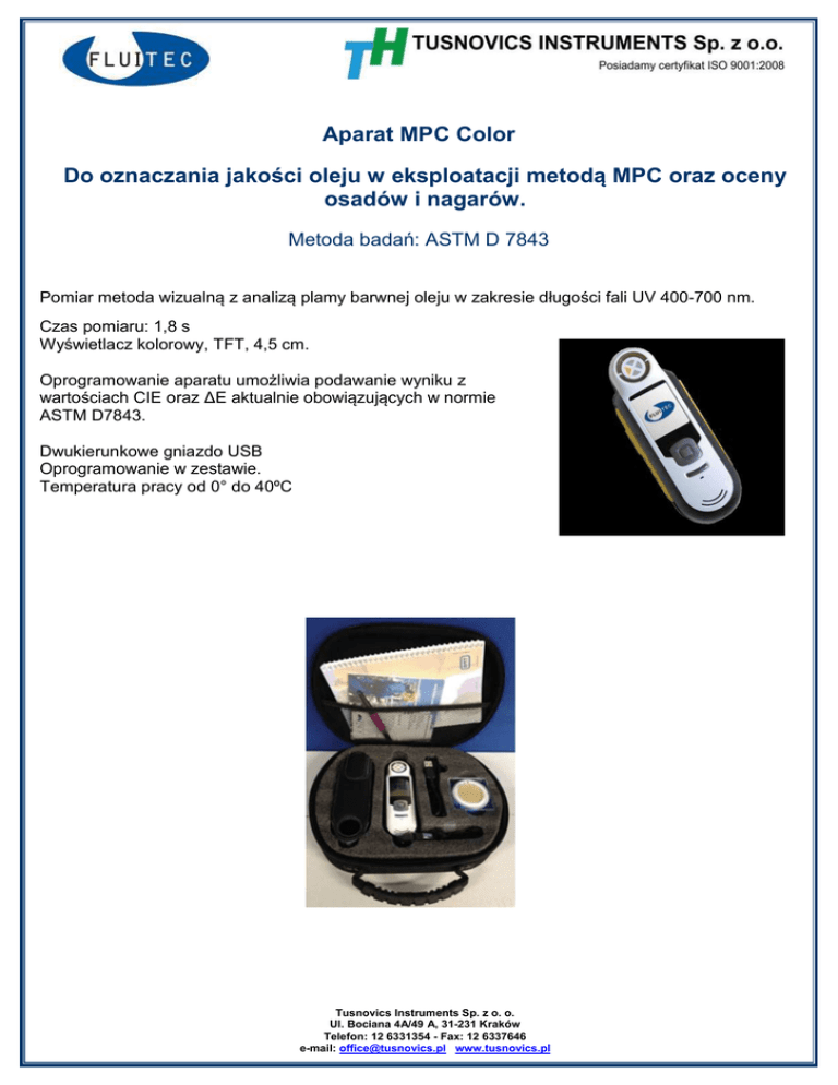 Aparat MPC Color Do oznaczania jakości oleju w eksploatacji metodą MPC oraz oceny osadów i nagarów. Metoda badań: ASTM D 7843 Pomiar metoda wizualną z analizą plamy barwnej oleju w zakresie długości fali UV 400-700 nm. Czas pomiaru: 1,8 s Wyświetlacz kolorowy, TFT, 4,5 cm. Oprogramowanie aparatu umożliwia podawanie wyniku z wartościach CIE oraz ΔE aktualnie obowiązujących w normie ASTM D7843. Dwukierunkowe gniazdo USB Oprogramowanie w zestawie. Temperatura pracy od 0° do 40ºC Tusnovics Instruments Sp. z o. o. Ul. Bociana 4A/49 A, 31-231 Kraków Telefon: 12 6331354 - Fax: 12 6337646 e-mail: [email protected] www.tusnovics.pl