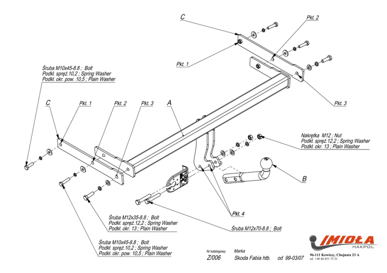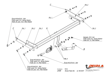 C Pkt. 1 Śruba M10x45-8.8 ; Bolt Podkł. spręż.10,2 ; Spring Washer Podkł. okr. pow. 10,5 ; Plain Washer C Pkt. 1 Pkt. 2 Pkt. 2 Pkt. 3 A Pkt. 3 Nakrętka M12 ; Nut Podkł. spręż.12,2 ; Spring Washer Podkł. okr. 13 ; Plain Washer B Pkt. 4 Śruba M12x35-8.8 ; Bolt Podkł. spręż.12,2 ; Spring Washer Podkł. okr. 13 ; Plain Washer Śruba M10x45-8.8 ; Bolt Podkł. spręż.10,2 ; Spring Washer Podkł. okr. pow. 10,5 ; Plain Washer Śruba M12x70-8.8 ; Bolt Nr katalogowy Z/006 Marka Skoda Fabia htb. od 99-03/07 96-111 Kowiesy, Chojnata 23 A tel. +48 46 831 73 31 Gniazdo 7-biegunowe 12V z ruchomymi bolcami Symbol SWW 1135-812 Oznaczenie zacisku 31 L R 54 58L 58R + Zacisk do łączenia przewodów do masy pojazdu do świateł kierunku jazdy lewych do świateł kierunku jazdy prawych do świateł hamowania do świateł pozycyjnych lewych do świateł pozycyjnych prawych tylne światła przeciwmgłowe Moment skręcający dla śrub i nakrętek (8.8) Torgue settings for nuts and bolts (8.8) M8 25 Nm M12 M10 55 Nm M14 M16 195 Nm • • • • • • • • • • ZESTAW ŚRUBOWY: FASTENING MEANS: Kolory Biały , white Żółty , yellow zielony, green czerwony, red czarny, black brązowy, brown niebieski , blue -M12x70 8.8 -M12x35 8.8 -M10x45 8.8 SKODA FABIA htb. 99 NO CAT. Z/006 INSTRUKCJA MONTAŻU: FITTING INSTRUCTION: 2szt 2szt 4szt -M12 4szt -M10 4szt -M12 4szt -M10 -M12 4szt 2szt − ∅ x36 4szt 85 Nm 135 Nm Odkręcić zderzak . Od tylnego pasa samochodu odkręcić belkę zderzeniową (nie będzie już wykorzystana). W otwory podłużnic wsunąć elementy zaczepu C i poprzez technologiczne otwory w podłużnicy skręcić lekko śrubami M10x45 8.8 (pkt 1). Między elementy zaczepu C wsunąć do podłużnic belkę zaczepu A i poprzez technologiczne otwory w podłużnicy oraz otwory w elementach C (pkt 2) skręcić lekko śrubami M10x45 8.8. Skręcić elementy C z belką zaczepu A (pkt 3) śrubami M12x35 8.8. Dokręcić wszystkie śruby z momentem wg tabeli. Wykonać wycięcie w osi, w dolnej części zderzaka o wymiarach 50x50. Zamontować zderzak. Przykręcić kulę i blachę gniazda elektrycznego śrubami M12x70 8.8. Podłączyć instalację elektryczną. • • • • • • • • • • Unscrew the bumper. Unscrew the bumper bar from the rear belt of the car (it will not be used any more). Insert elements C in the holes of the metal clamps and screw slightly, through the technological holes in the metal clamps, with bolts M10x45 8.8 (point 1). Insert the main bar A in the metal clamps between elements C and screw slightly through the technological holes in the metal clamps and in the elements C (point 2) with bolts M10x45 8.8. Screw elements C to the main bar A with bolts M12x35 8.8 (point 3). Tighten all the bolts according to the torque setting –see the table. Cut out the fragment 50x50 in the lower part of the bumper, in its axle. Assemble the bumper. Fix the ball and electric plate with bolts M12x70 8.8. Connect the electric wires. WARUNKI EKSPLOATACJI. Zakład Produkcyjno Handlowo Usługowy 96-111 Kowiesy, Chojnata 23A tel. (0-46) 831 73 31, fax 831 74 29 www.hakpol.pl POLAND Zaczep posiada tabliczkę znamionową obowiązującą użytkownika w zakresie prawidłowego i bezpiecznego obciążenia. R = 1200 kg D = 6,50 kN ⇓ Zaczep kulowy do samochodu: S = 50 kg SKODA FABIA htb. 99 - Nr katalogowy Z/006 KARTA GWARANCYJNA Warunki gwarancyjne i postępowanie reklamacyjne 1. 2. 3. 4. 5. Producent zobowiązuje się do wymiany wadliwego wyrobu w okresie 12 miesięcy od daty zakupu lub 24 miesięcy od daty produkcji, w terminie 14-dniowym. Wymianę wadliwego wyrobu dokonuje się w miejscu zakupu lub bezpośrednio u producenta. Nie podlega reklamacji gwarancyjnej zaczep kulowy, którego uszkodzenie nastąpiło: a) wskutek wypadku, b) wskutek nieprzestrzegania zasad prawidłowej obsługi, eksploatacji, konserwacji podanych w instrukcji. Karta gwarancyjna bez daty sprzedaży , pieczęci sklepu lub warsztatu montującego, nie może służyć jako podstawa do reklamacji. W skutek nie prawidłowego zamontowania zaczepu. Przeznaczenie Zaczep kulowy zamontowany do samochodu przeznaczony jest do holowania przyczep towarowych i turystycznych. Warunki zamontowania Zaczep może być zamontowany i eksploatowany w samochodzie, który posiada właściwy stan techniczny elementów podwozia, poprzez które następuje podłączenie haka. Elementy te nie mogą być uszkodzone mechanicznie ani poprzez działanie korozji. W czasie całej eksploatacji należy poszczególne elementy zaczepu utrzymywać w należytym stanie technicznym (właściwie dokręcone elementy złączone, całość konstrukcji zabezpieczona przed działaniem korozji). Przyczepa musi być połączona z samochodem dodatkowym złączem o odpowiedniej wytrzymałości (łańcuch, linka z zapięciem). UWAGA Uszkodzenia mechaniczne zaczepu kulowego np. w wyniku najechania, zaczepienia przeszkodę, wykluczają dalszą eksploatację zaczepu. Uszkodzony zaczep kulowy nie może być naprawiany. Sprawdzić śruby mocujące zaczep kulowy po około 1000 km przebiegu eksploatacji. Nacisk pionowy na kulę zaczepu nie może przekroczyć 50 kg. Po zamontowaniu zaczepu kulowego należy dokonać przeglądu na stacji diagnostycznej! data sprzedaży............................ nr rej poj .................................... Data produkcji........-.................. m-c rok. .. .......................... pieczęć sprzedawcy. E20 55R 01 0802