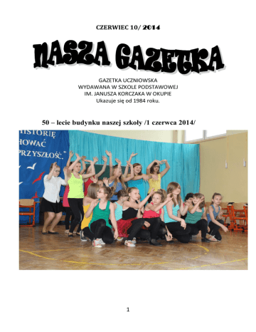 CZERWIEC 10/ 2014 GAZETKA UCZNIOWSKA WYDAWANA W SZKOLE PODSTAWOWEJ IM. JANUSZA KORCZAKA W OKUPIE Ukazuje się od 1984 roku. 50 – lecie budynku naszej szkoły /1 czerwca 2014/ 1 1 czerwca 2014 roku świętowaliśmy 50 – te urodziny Szkoły Podstawowej im. Janusza Korczaka URODZINY NASZEJ SZKOŁY Szkoła w Okupie istnieje od 69 lat. Wcześniej, od 1945 do 1964 roku funkcjonowała w dwóch budynkach oddalonych od siebie o około 2 km. Od pięćdziesięciu lat działa w obecnym budynku. Obchody 50 – lecia rozpoczęły się mszą w Kościele Parafialnym w Okupie, po której zaproszeni goście, byli dyrektorzy, nauczyciele, absolwenci oraz rodzice i dzieci przeszli do szkoły. Podczas jubileuszowych uroczystości nie zabrakło szczególnych życzeń składanych na ręce dyrektora Tomasza Tkaczuka i pamiątkowych wpisów do szkolnej kroniki. Dyrektor, grono pedagogiczne, pracownicy szkoły oraz uczniowie przyznali wyróżnienia honorowe wszystkim, którzy w ciągu pięćdziesięciu lat byli żywo zaangażowani w działania na rzecz podstawówki. Wyróżnieniami 50 – lecia uhonorowani zostali: Jan Strzelczyk, Maria Strzelczyk, Feliks Piotrowski, Halina Król, Jerzy Łącz, Zdzisław Lepsik, Jan Klimczak, Jadwiga Rygielska, Sylwester Owczarek ,Grzegorz Miłosz,Joanna Chinalska, Bartosz Chinalski, Andrzej Owczarek, Wojciech Sikora, Gabriel Szkudlarek, Ks. Tomasz Promiński, Zygmunt Nowakowski, Mariola i Mirosław Bajowie, Ochotnicza Straż Pożarna w Okupie, Zbigniew Sowała, Leokadia Wąsik, Henryka Niziołek, Ireneusz Kobiela, Agnieszka i Jacek Perlikowie, Anna i Bogdan Skowronowie, Agnieszka i Tomasz Gawronowie, 2 Małgorzata i Krzysztof Piotrowscy, Marianna Rębacz, Ewa Sitek, Kazimierz Warecki. Specjalne certyfikaty otrzymali byli dyrektorzy szkoły: Jan Strzelczyk, Maria Strzelczyk, Urszula Wrzesińska, Feliks Dębkowski oraz Ryszard Nowicki. Po części oficjalnej w programie artystycznym, bawiąc i wzruszając publiczność, zaprezentowali się uczniowie. Wielu wzruszeń dostarczyła także wystawa szkolnych fotografii przywołująca wspomnienia najstarszych absolwentów i odświeżająca pamięć najmłodszych. Urodziny kończył piknik rodzinny na terenie szkolnym. Honorowe wyróżnienia odbierają Maria i Jan Strzelczykowie 3 Wydarzenia z życia szkoły 6 czerwca 2014 roku, z małym opóźnieniem spowodowanym Jubileuszem naszej szkoły, odbył się Dzień Dziecka. Na szczęście pogoda dopisała i wszyscy mogliśmy startować w konkurencjach sportowych zorganizowanych na szkolnych boiskach. Upiekliśmy też kiełbaski i chleb na ognisku, a pod koniec tego niezwykłego dnia zjedliśmy pyszne lody. 13 czerwca 2014 roku, podczas pikniku rodzinnego zorganizowanego przez Specjalny Ośrodek Szkolno – Wychowawczy w Łasku, odbyło się rozstrzygnięcie kwietniowego konkursu AUTYZM – TAK TO WIDZĘ. Na konkurs napłynęły łącznie 43 prace. Jury wybrało 14 laureatów, wśród których znalazło się aż czworo naszych artystów. Matylda Strzelczyk, Mateusz Lewandowski, Agata Witczak i Julia Owczarek wraz ze szkolnym opiekunem konkursu p. Agnieszką Sobczak pojechali na uroczyste wręczenie nagród i dyplomów do SOSW w Łasku. Wiele radości dostarczył im udział w pikniku, przejażdżki konne, możliwość obejrzenia z bliska a nawet pogłaskania kruka, sowy, orła przedniego oraz zabawy w dmuchanym zamku, na trampolinie i karuzeli. Mogły również zjeść kiełbaskę z grila i smaczne ciasta. 4 Matylda Strzelczyk /kl.1 i Mateusz Lewandowski /kl.3/ nagrodzeni w konkursie „Autyzm – tak to widzę” 16 czerwca 2014 roku odbyła się lekko spóźniona, ale bardzo ciekawa uroczystość z okazji Dnia Mamy zorganizowana przez Drużynę Marzeń, której działania koordynuje p. Agnieszka Sobczak. Każda klasa przygotowała dla mam krótki występ artystyczny. Wszystkie mamy obdarowane zostały dyplomikiem potwierdzającym nadanie tytułu „Mama z Klasą”. Wiele emocji dostarczyło również spotkanie z wyjątkowymi gośćmi – Jarką Wawrzyniak /mistrzynią Polski i wicemistrzynią Europy w sztukach walki/ i jej mamą. Panie zostały wyjątkowo wnikliwie przepytane Było fantastycznie 5 Mistrzyni Polski, wicemistrzyni Europy w sztukach walki rozdaje autografy. 18 czerwca odbył się bal zorganizowany przez uczniów klasy szóstej. W tym roku edukację w naszej szkole zakończyli: Kasia Bednarska, Kuba Cichoń, Patrycja Cuper, Patryk Gajewczyk, Natalka Koziróg, Dawid Michalak, Marcin Miłosz, Julka Owczarek, Aga Pilarczyk, Seba Stefaniak, Hubert Szafran, Krystian Taborowski, Bartek Wartalski, Monika Wiluś, Marta Wyrwas, Natalia Zwolińska. 6 Jak zostać ratownikiem. Pierwszoklasiści przygotowywali się bardzo solidnie do nadchodzących wakacji. Dzieci wiedzą jak poradzić sobie w trudnej sytuacji, gdzie zwrócić się o pomoc, jakie numery alarmowe wykorzystać. Podczas ćwiczeń na fantomie uczyły się jak udzielić pierwszej pomocy przedmedycznej. Okazało się, że wcale to nie takie proste. Niektórym zabrakło siły, by wykonać 30 uciśnięć klatki piersiowej i dwa wdechy. 7 NAJLEPSI W ROKU SZKOLNYM 2013/2014 Najlepsi uczniowie z klas 1 – 3 /w kolejności alfabetycznej/ Klasa 1 Bartos Julia Mikołaj Braczkowski Mikołaj Gawron Jakub Garbaciński Małgorzata Niziołek Paula Oleszczak Wiktor Pawliczak Kinga Rygielska Bartek Sobczak Matylda Strzelczyk Klasa 2 Julia Bednarska Alicja Chinalska Maja Łopusiewicz Norbert Nowak Paweł Owczarek Bartosz Sobala Klasa 3 Igor Felczerek Aleksander Gawron Mateusz Lewandowski Mateusz Miłosz Hubert Stanaszek Agata Witczak Kamila Wlazło 8 Uczniowie z klas 4 – 6 /Świadectwo z czerwonym paskiem otrzymują uczniowie, którzy uzyskali średnią 4,75 i wyżej. Rodzice uczniów ze średnią 5,0 i wyżej otrzymują Listy Gratulacyjne/ Klasa 4 Mieszko Strzelczyk – 5,27 Hanna Korona – 5,09 Iga Janas – 4,73 Klaudia Maląg – 4,55 Martyna Bartos – 4,55 Klasa 5 Zuzanna Przytuła – 5,27 Weronika Sobczak – 5,09 Klaudia Bonikows