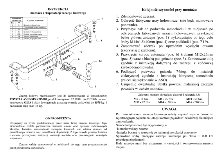 INSTRUKCJA montaŜu i eksploatacji zaczepu kulowego Oznaczenie zacisku wg ISO PN 1 L 2 + 3 31 4 R 5 58R 6 54 7 58L Kolejność czynności przy montaŜu 7 Łączenie przewodów Kierunkowskazy lewe Tylne światła przeciwmgłowe Masa Kierunkowskazy prawe Światła pozycyjne prawe Światła hamowania Światła pozycyjne lewe 1 4 5 6 7 12 3 2 4 Zaczep kulowy przeznaczony jest do zamontowania w samochodzie: TOYOTA AVENSIS KOMBI, produkowanym od 02.1998r. do 03.2003r., numer katalogowy O20A i słuŜy do ciągnięcia przyczep o masie całkowitej do 1575 kg i nacisku na kulę max 75 kg. 1. Zdemontować zderzak. 2. Odkręcić fabryczne uszy holownicze (nie będą montowane ponownie). 3. PrzyłoŜyć hak do podwozia samochodu i w miejscach po odkręcanych fabrycznych uszach holowniczych przykręcić belkę główną zaczepu (poz. 1) wykorzystując do tego celu śruby M14x1.5x40mm (poz. 4) oraz podkładki (poz. 7 i 9). 4. Zamontować zderzak po uprzednim wycięciu otworu (skorzystaj z szablonu). 5. Przykręcić korpus automatu (poz. 6) śrubami M12x25mm (poz. 5) wraz z blachą pod gniazdo (poz. 3). Zamocować kulę zgodnie z instrukcją dołączaną do zaczepu z końcówką szybkodemontowalną. 6. Podłączyć przewody gniazda 7-bieg. do instalacji elektrycznej zgodnie z instrukcją fabryczną samochodu (zaleca się wykonanie w ASO). 7. Uzupełnić ewentualne ubytki powłoki malarskiej zaczepu powstałe w trakcie montaŜu. Zalecany moment skręcający dla śrub i nakrętek 8,8: M6 - 11 Nm M8 - 25 Nm M10 - 50 Nm M12 - 87 Nm M14 - 138 Nm M16 - 210 Nm UWAGA OD PRODUCENTA Dziękujemy za wybór produkowanego przez naszą firmę zaczepu kulowego. Jego niezawodność została potwierdzona licznymi testami oraz opiniami zadowolonych klientów. JednakŜe niezawodność zaczepów kulowych jest zaleŜna równieŜ od prawidłowego montaŜu oraz prawidłowej eksploatacji. Z tego powodu prosimy Państwa o staranne przeczytanie niniejszej instrukcji montaŜu oraz przestrzeganie zawartych wskazówek. Zaczep naleŜy zamontować w miejscach do tego celu przeznaczonych przez producenta samochodu. Po zamontowaniu zaczepu kulowego naleŜy uzyskać wpis w dowodzie rejestracyjnym pojazdu na „stacji kontroli pojazdów” właściwej dla miejsca zamieszkania. Samochód powinien być wyposaŜony w : -kierunkowskazy boczne -lusterka boczne o rozstawie co najmniej szerokości przyczepy Sprawdzać śruby mocujące zaczepu kulowego po około 1 000 km przebiegu eksploatacji. Kula zaczepu musi być utrzymana w czystości i konserwowana smarem stałym. PPUH AUTO-HAK Sp.J. WyposaŜenie zaczepu: Produkcja Zaczepów Kulowych Henryk & Zbigniew Nejman 76-200 SŁUPSK ul. Słoneczna 16K tel/fax (059) 8-414-414; 8-414-413 E-mail: [email protected] www. autohak.com.pl Zaczep kulowy bez wyposaŜenia elektrycznego O20A Klasa: A50-X Nr kat. Przeznaczony do zamontowania w samochodzie: Producent: TOYOTA Model: AVENSIS Typ: KOMBI produkowanego od 02.1998r. do 03.2003r. Dane techniczne: wartość D: 8,3 kN maksymalna masa przyczepy: 1575 kg maksymalny nacisk na kulę: 75 kg Numer homologacji zgodnie z Dyrektywą 94/20/WE: e20*94/20*1062*00 KARTA GWARANCYJNA Producent udziela gwarancji niniejszą kartą gwarancyjną na okres 24 miesięcy licząc od dnia zakupu zaczepu kulowego do samochodu: INFORMACJA WSTĘPNA TOYOTA AVENSIS KOMBI produkowanego od 02.1998r. do 03.2003r. Data produkcji .............................. Data zakupu............................................. Zakres gwarancji obejmuje wyłącznie wady jakościowe wynikające z winy producenta. Gwarancja nie obejmuje natomiast uszkodzeń zawinionych przez nabywcę, wynikających z niewłaściwego montaŜu, uŜytkowania lub konserwacji, uszkodzeń mechanicznych, normalnego zuŜycia podczas eksploatacji itp. Gwarancja udzielona na zakupiony towar nie wyłącza, nie ogranicza ani nie zawiesza uprawnień kupującego wynikających z niezgodności towaru z umową. Reklamacje naleŜy zgłaszać w punkcie sprzedaŜy, składając jednocześnie kartę gwarancyjną. Usunięcie "wady" następuje po stwierdzeniu przez punkt sprzedaŜy wspólnie z producentem słuszności złoŜonej reklamacji. Reklamacja powinna być załatwiona w ciągu 14 dni od dnia uznania reklamacji. Karta gwarancyjna jest niewaŜna jeŜeli nie jest wypełniona i podpisana. Data zgłoszenia reklamacji: ................................................................... Zaczep kulowy jest skonstruowany zgodnie z zasadami bezpieczeństwa ruchu drogowego. Zaczep kulowy jest elementem wpływającym na bezpieczeństwo jazdy i moŜe zostać zainstalowany wyłącznie przez personel wyspecjalizowany. Niedopuszczalne jest dokonywanie jakichkolwiek zmian w konstrukcji zaczepu. Powoduje to wygaśniecie dopuszczenia do stosowania. W przypadku obecności masy izolacyjnej lub osłony podwozia w miejscu przylegania zaczepu, naleŜy ją usunąć. Nieosłonięte miejsca karoserii oraz wywiercone otwory naleŜy pomalować farbą antykorozyjną. Informacjami wiąŜącymi odnośnie wartości obciąŜeń są dane podawane przez producenta samochodu, względnie wartości maksymalnej masy przyczepy oraz maksymalnego nacisku na kulę, przy czym wartości parametrów zaczepu kulowego nie mogą być przekroczone. Wzór do obliczania wartości siły D: Maks. masa przyczepy [kg] x Maks. masa samochodu [kg] Maks. masa przyczepy [kg] + Maks. masa samochodu [kg] X 9,81 = 1000 D [kN]